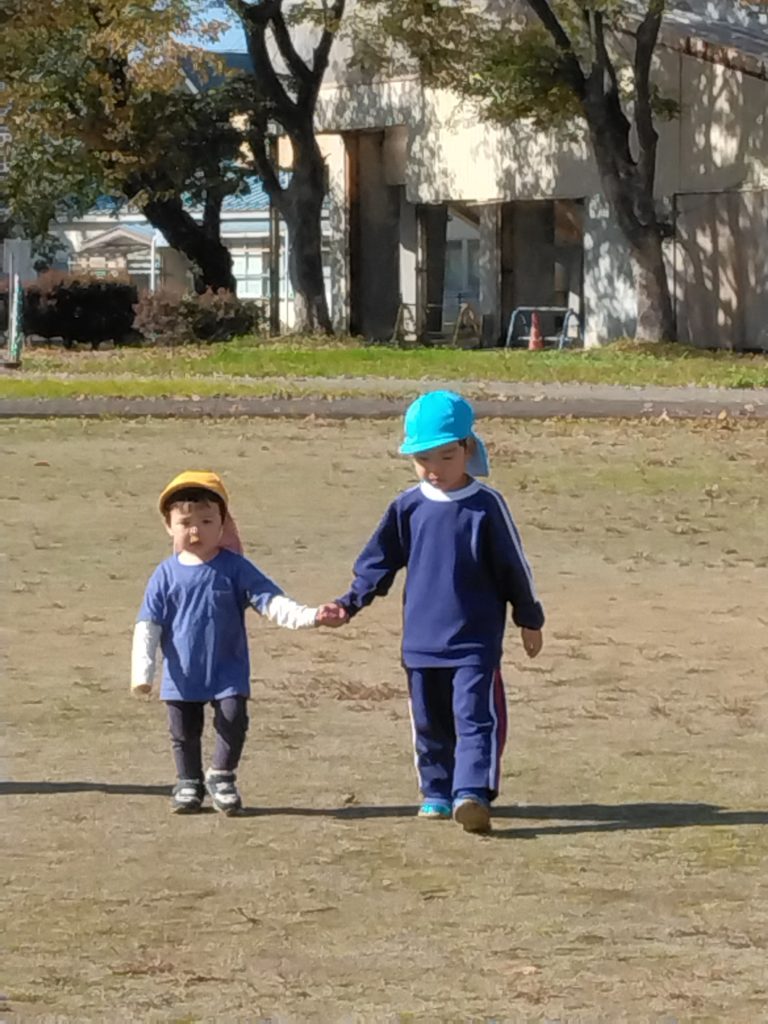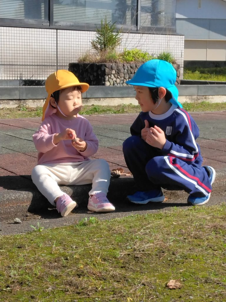 いっしょにあそぶ? 2023.11.10 十字の里へすみれ組の子どもたちが遊んでいるとすずらん組の子どもたちも来ました。 早速近寄って〝いっしょにあるこうか〟と、優しく手を差し伸べるすみれ組の男の子。 〝なにをみてるの?〟 〝いっしょにあそぶ?〟と、 自分たちよりも小さなすずらん組の子どもたちへの声がけなど配慮している姿がうれしく思えました。