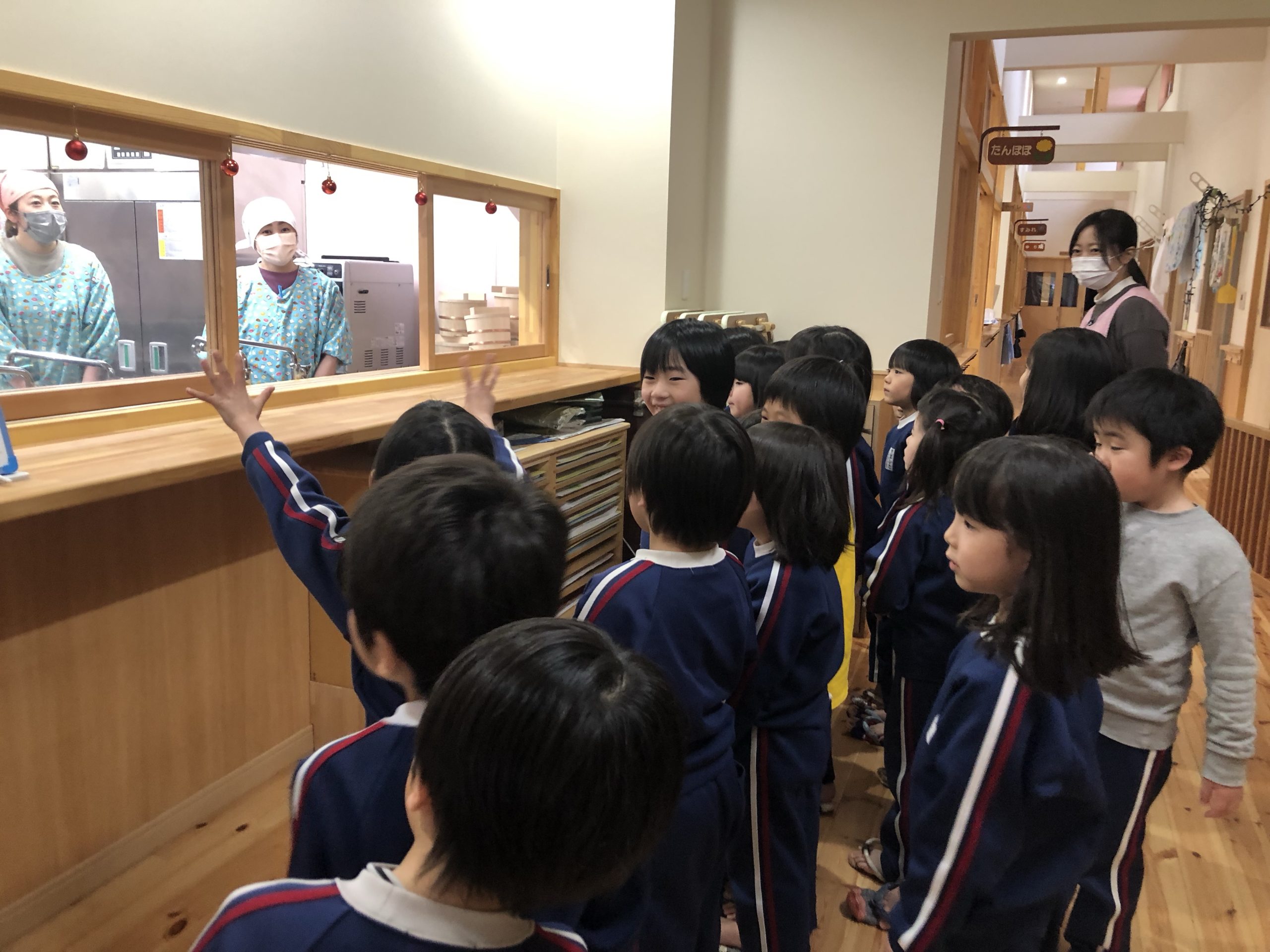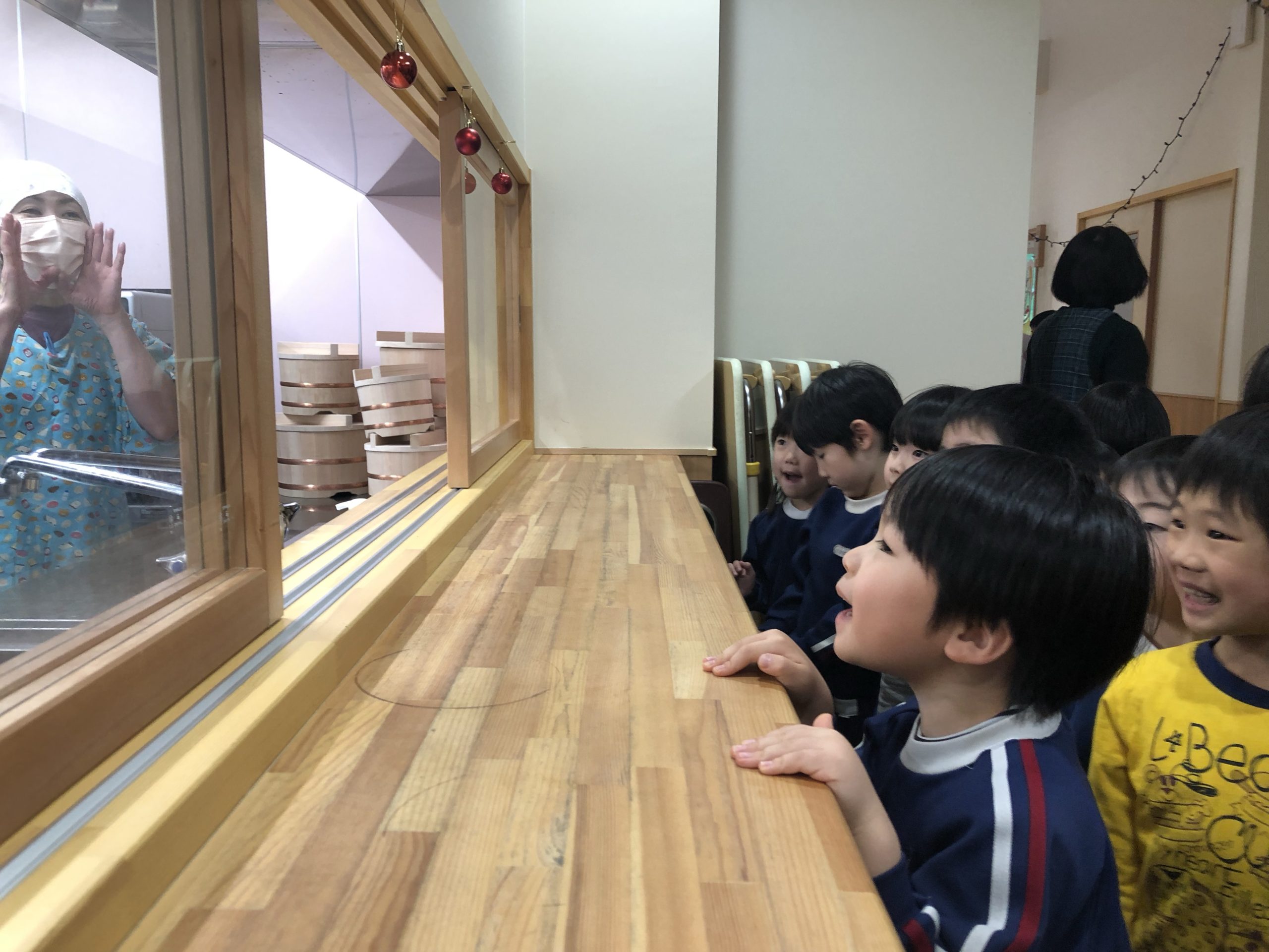 いつもありがとうございます 2021.12.17 朝からバイキング給食のために一生懸命働いている給食の方々。 バイキングだけでなく、日々の給食をいつも笑顔で作ってくださっています。 今日はそんな給食のスタッフに感謝を込めて、年長のゆり組の子どもたちがバイキング給食の後に挨拶をしていました。 「給食おいしかったよ。ありがとうございます」 給食のスタッフも笑顔で応えていました!!