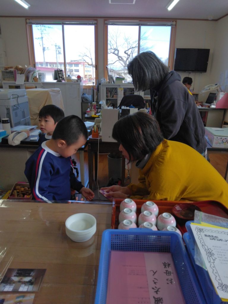 ゆり組の子どもたちが卒園式を明日にひかえ、先生方や、給食の方、事務の方にありがとうを伝えにいきました。言葉と一緒に手作りのプレゼントも添えてくれました。