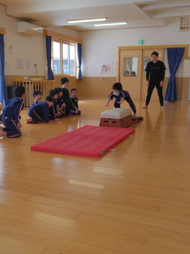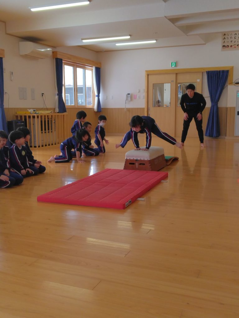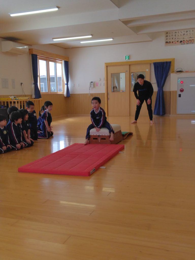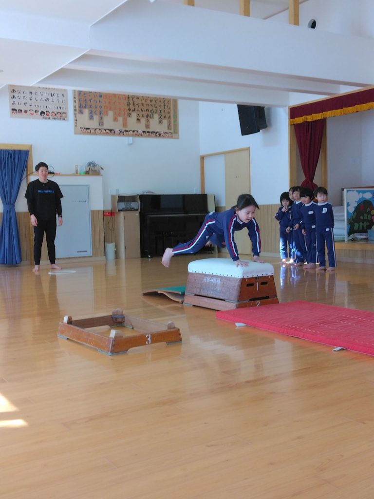 ゆり組では跳び箱3段!そして跳んだ後の決めのポーズもしっかりと出来るように一人一人が取り組んでいました。ゆり組の子どもたちに向けて照井先生は最後と言うことでみんなに伝えたいことがあるとお話してくださいました。