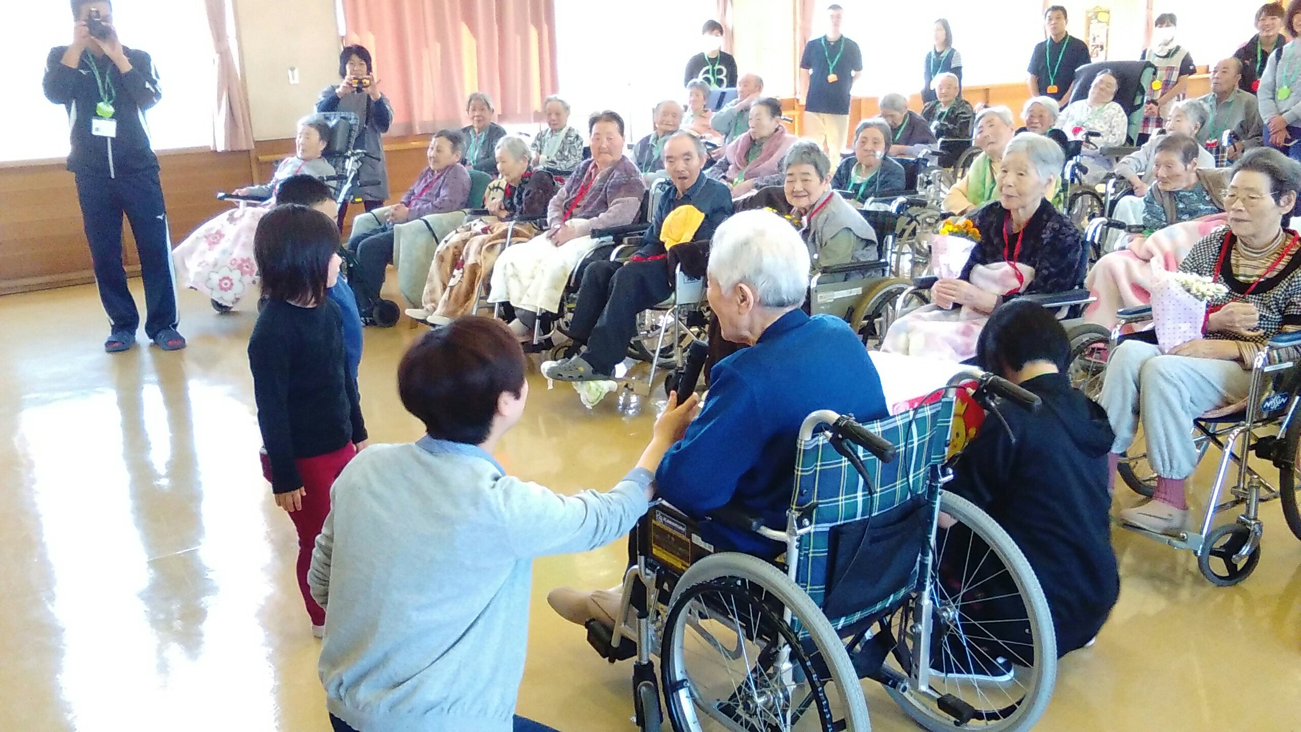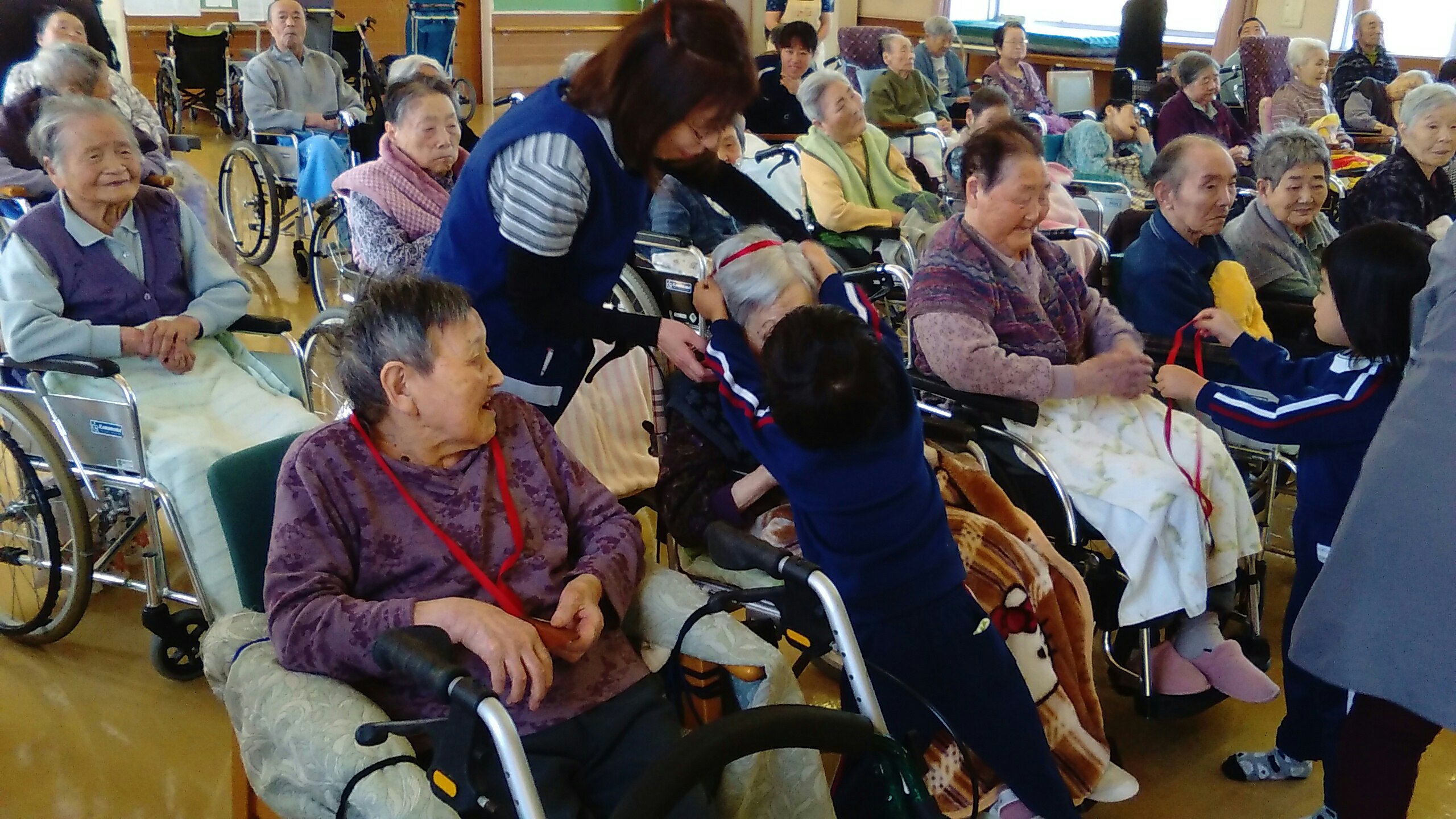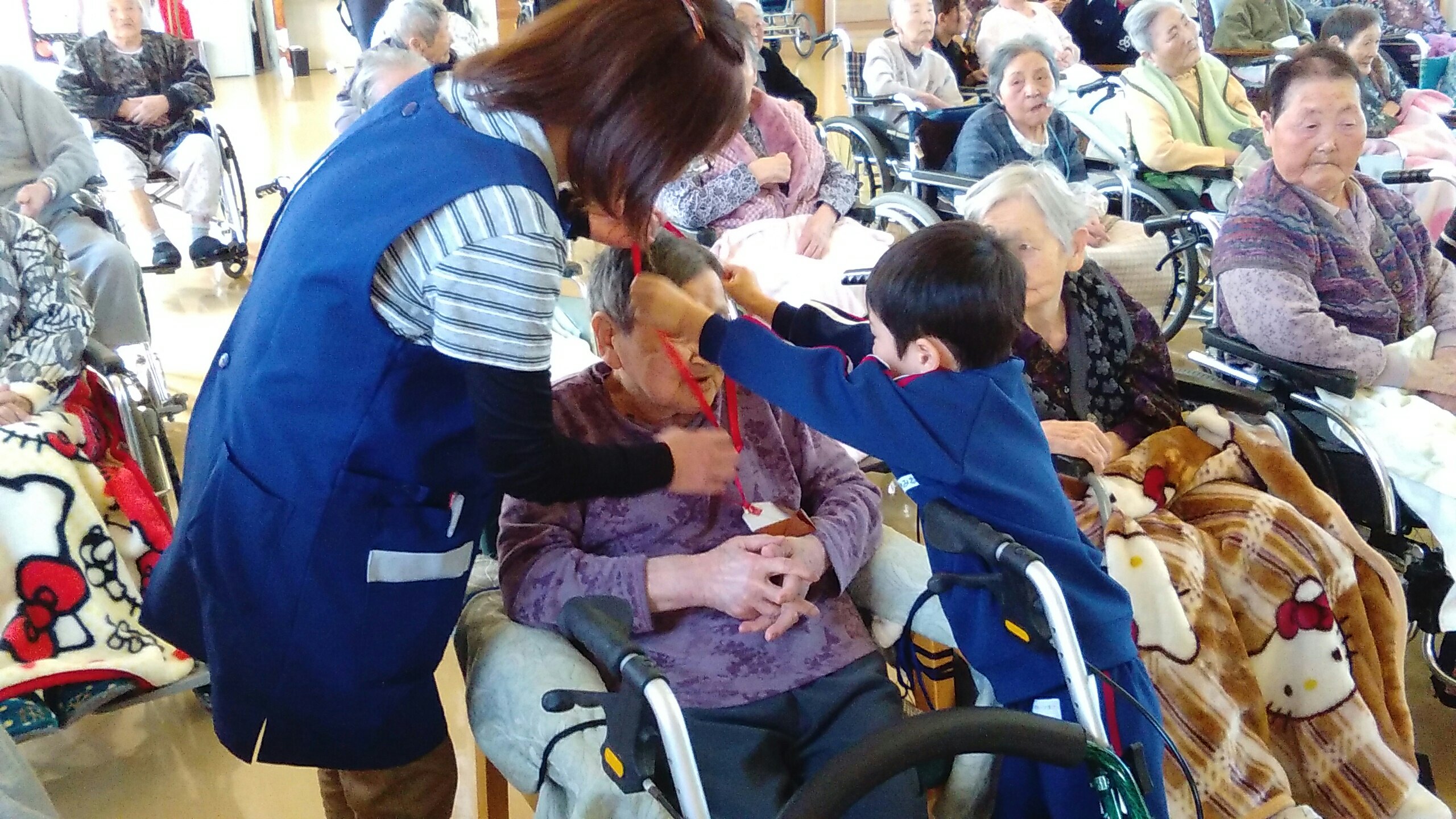 最後には、手作りの折り紙プレゼントをお一人お一人の首にかけてあげ、握手をすると笑顔で喜んでくださるおじいちゃん・おばあちゃんたちでした。