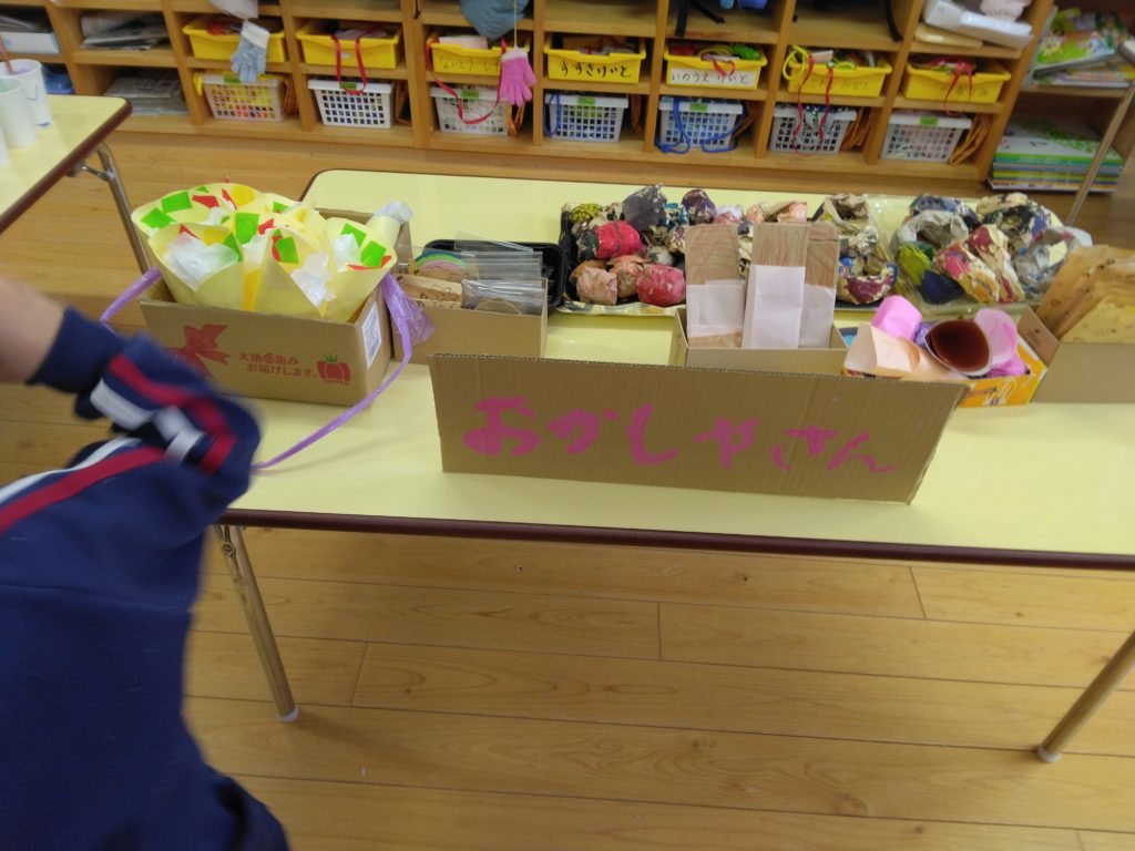 おみせやさんごっこ!! 2023.02.12 子どもたちが楽しみにしていたおみせやさんごっこの日!! まず初めに各お部屋のお店にはどんなものが売っているのかを確かめるツアーを! たんぽぽ組にはチョコバナナ、みかん、りんご、アイスクリームなどなど。 すみれ組にはなんと!魚つりをして魚がゲットできるお店に、わたあめの機械も作ってわたあめの店…。 ゆり組はハンバーガー、餅、アクセサリー 的当てコーナー! 何を買おうかなーと各お部屋を回って品物をじっくり見ていました。