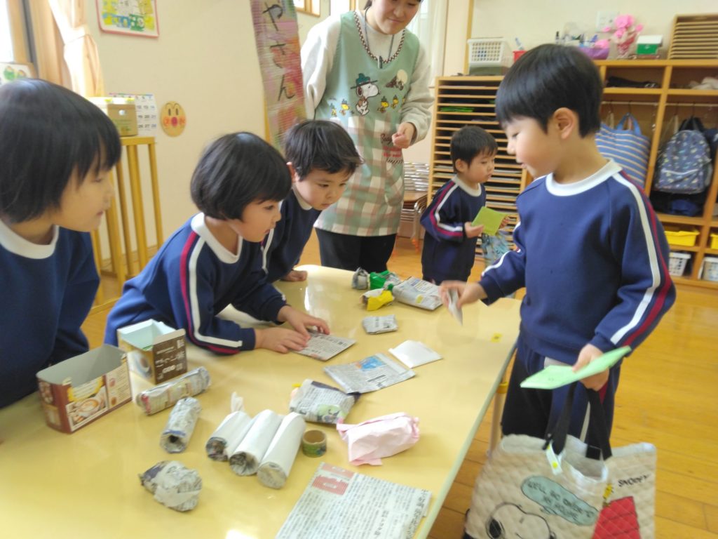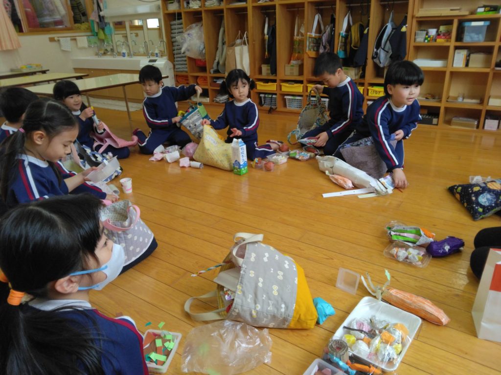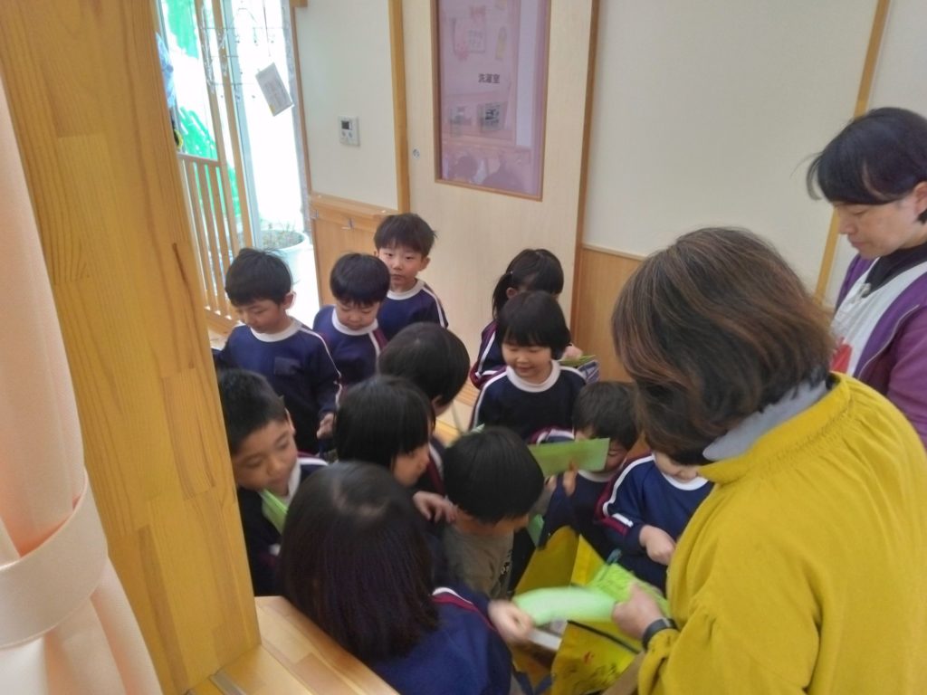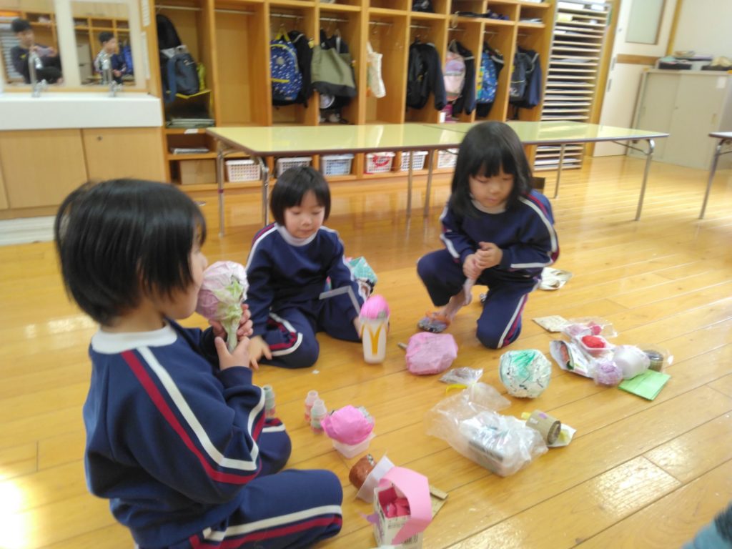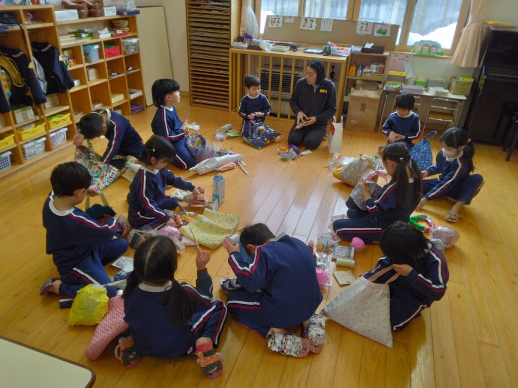 お店屋さんごっこ(お金ください) 2026.02.12 お店屋さんごっこが終わろうとしていた時に「もっと買いたかった」「もっとお金がほしい」と言う声があり、急遽こひつじ銀行が開店し放送が流れました。 〝こひつじ銀行を開きます。お金の必要な方はたんぽぽ組の廊下まで来てください。〟 子どもたちは急いで廊下に出て園長先生からお金を貰って再び買い物を楽しんでいました。 買い物が終わるとお部屋で何を買ったのか見せ合いをしていました。お店の売り上げ金も数えていました。
