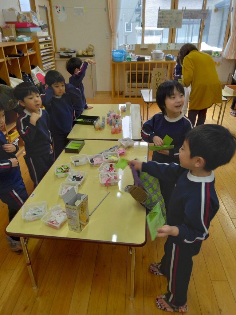 お店屋さんごっこ 2026.02.12 未満児クラスの子どもたちの買い物が終わり、いよいよ以上児クラスの子どもたちの買い物が始まりました。 何を買おうかなー お寿司かなー アイスもいいなぁー お金がなくなってしまった… お金、もっとほしいなぁ… 子どもたちのいろいろな会話が聞こえてきました。