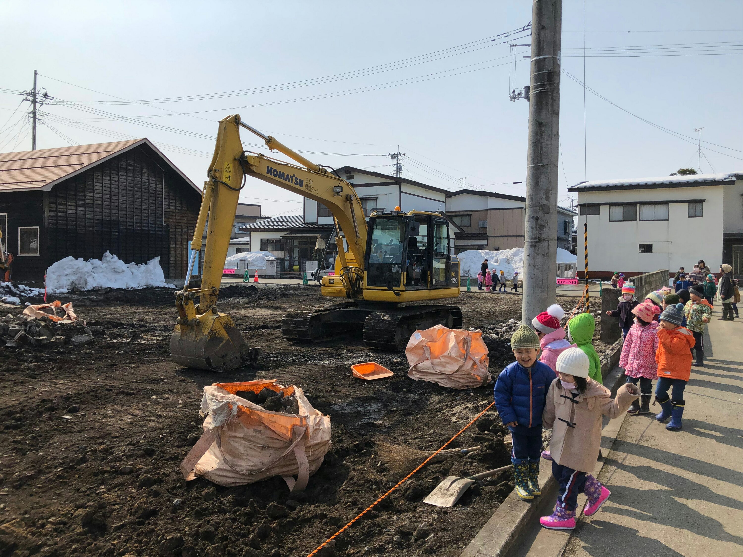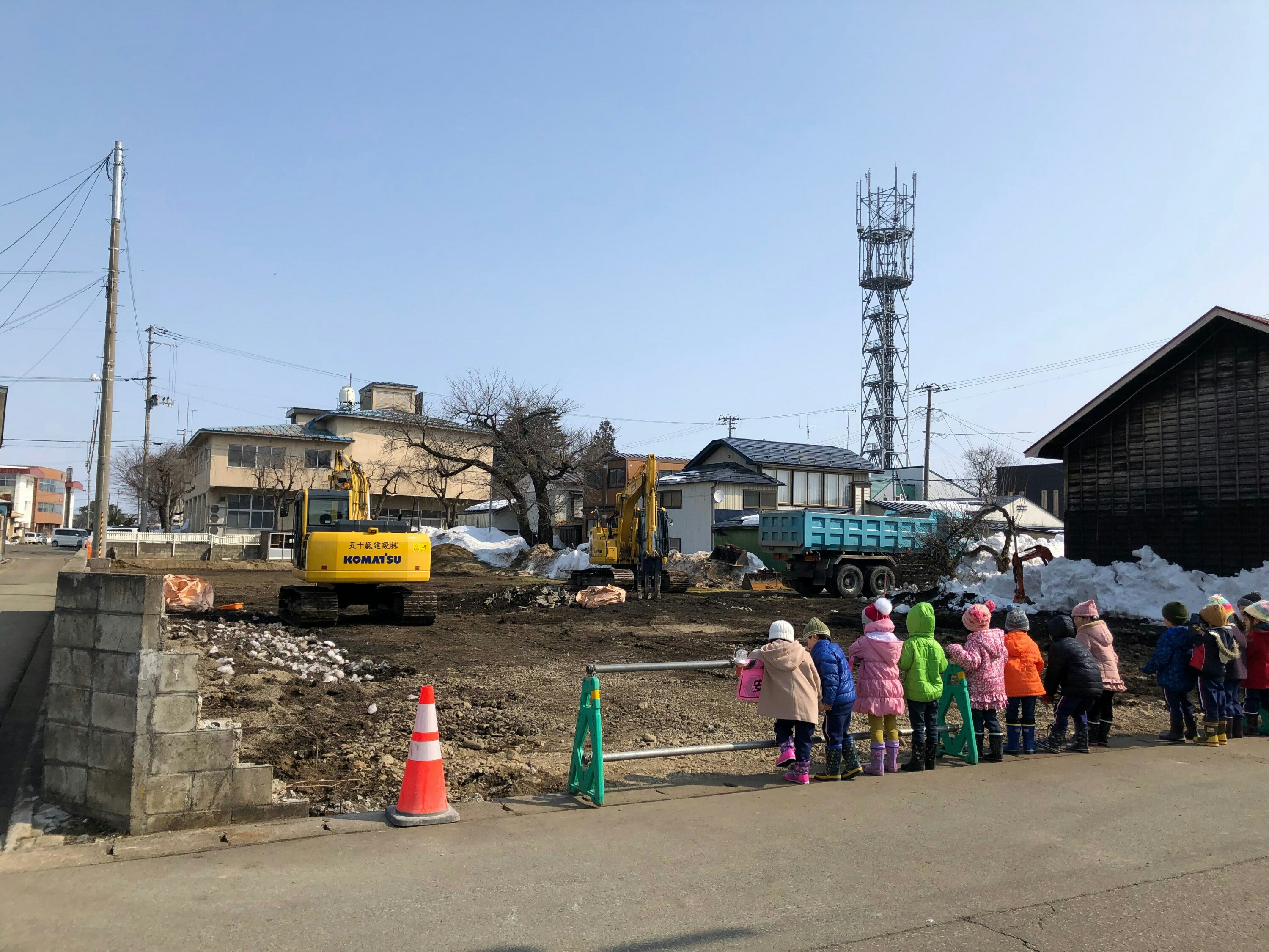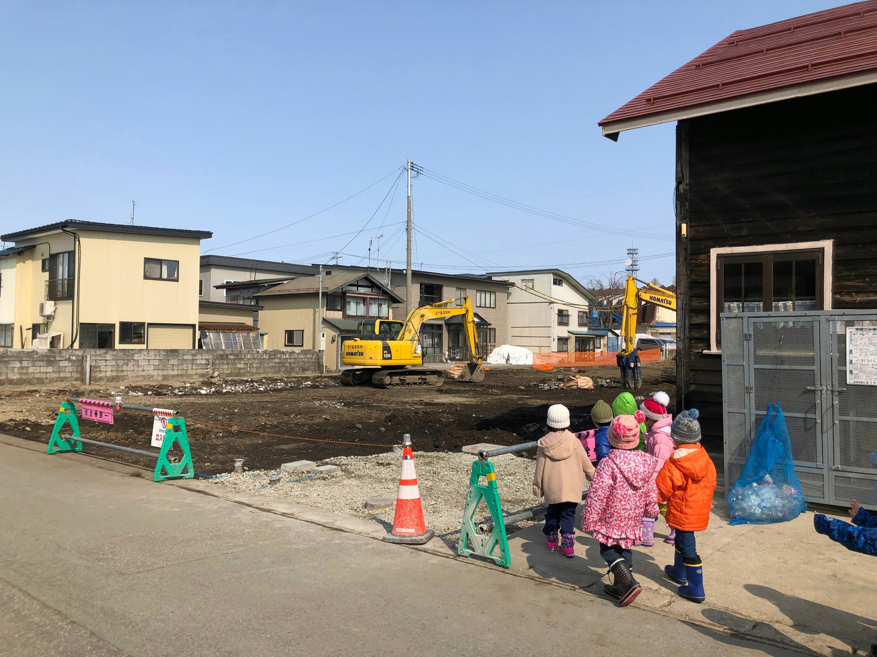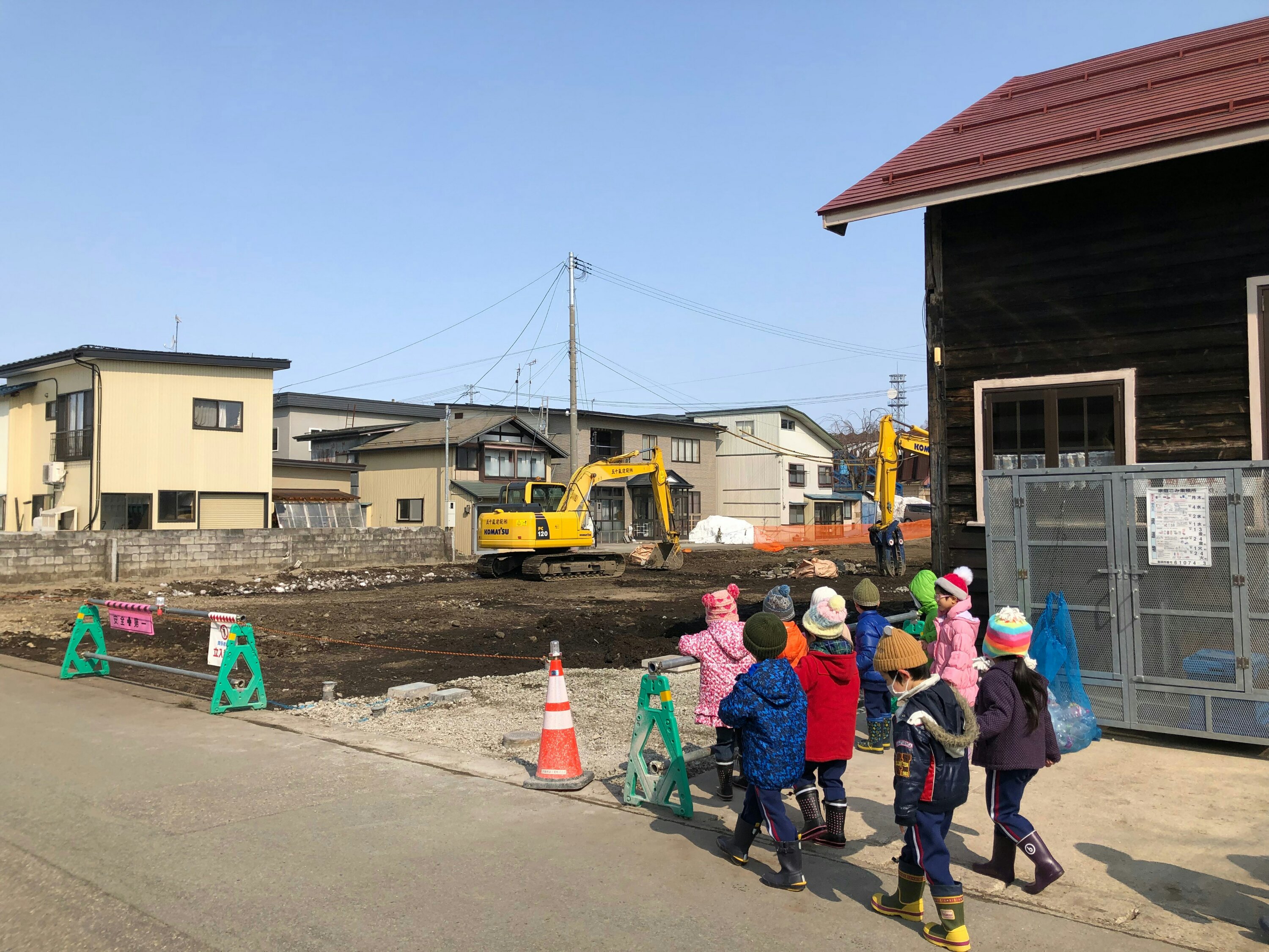 この間まであった建物があっという間に無くなってしまい、なんだか不思議な感じです。ずっと見ていたい気持ちを押さえ、仮設園舎へと帰りの足を向けました。