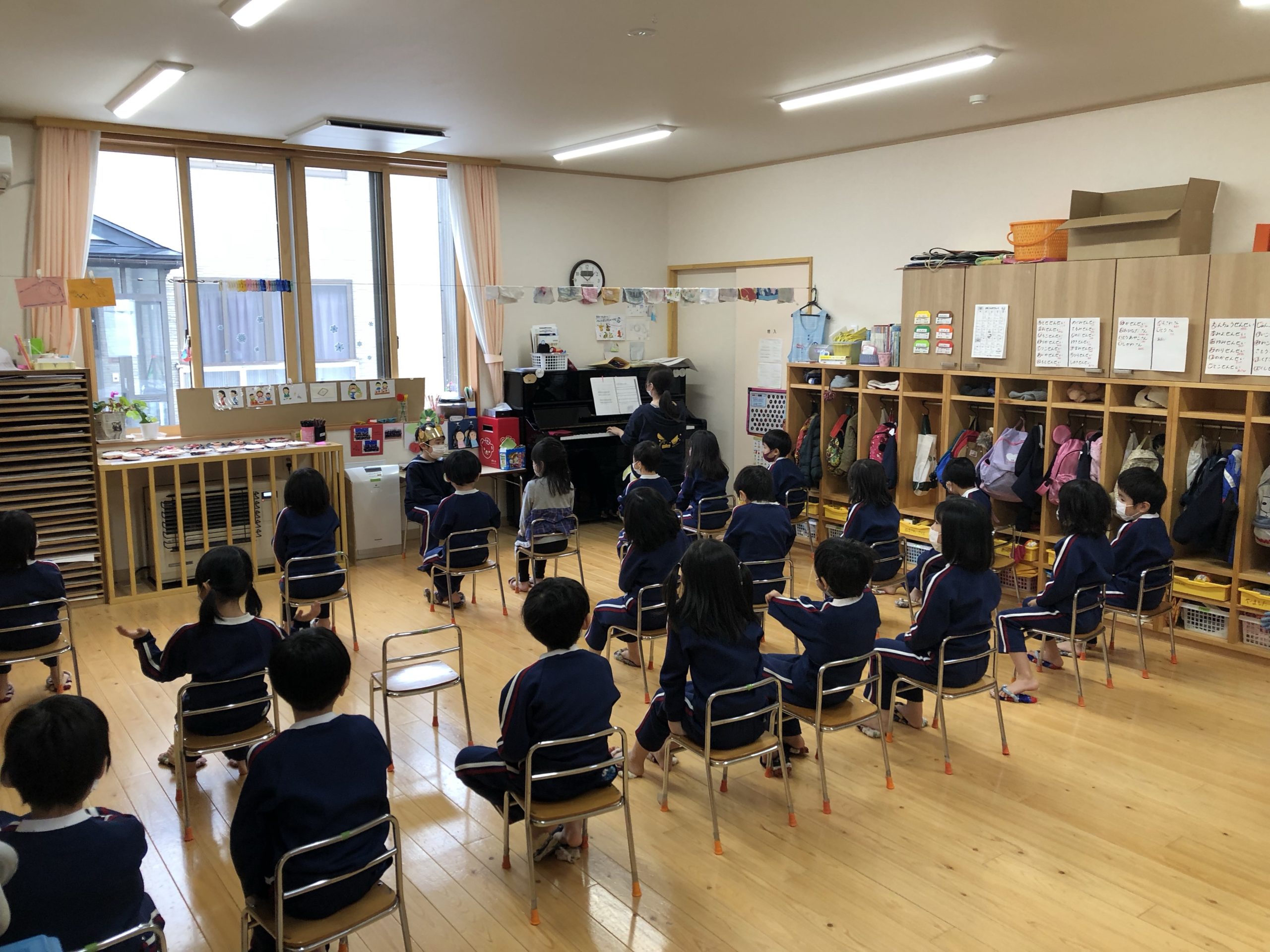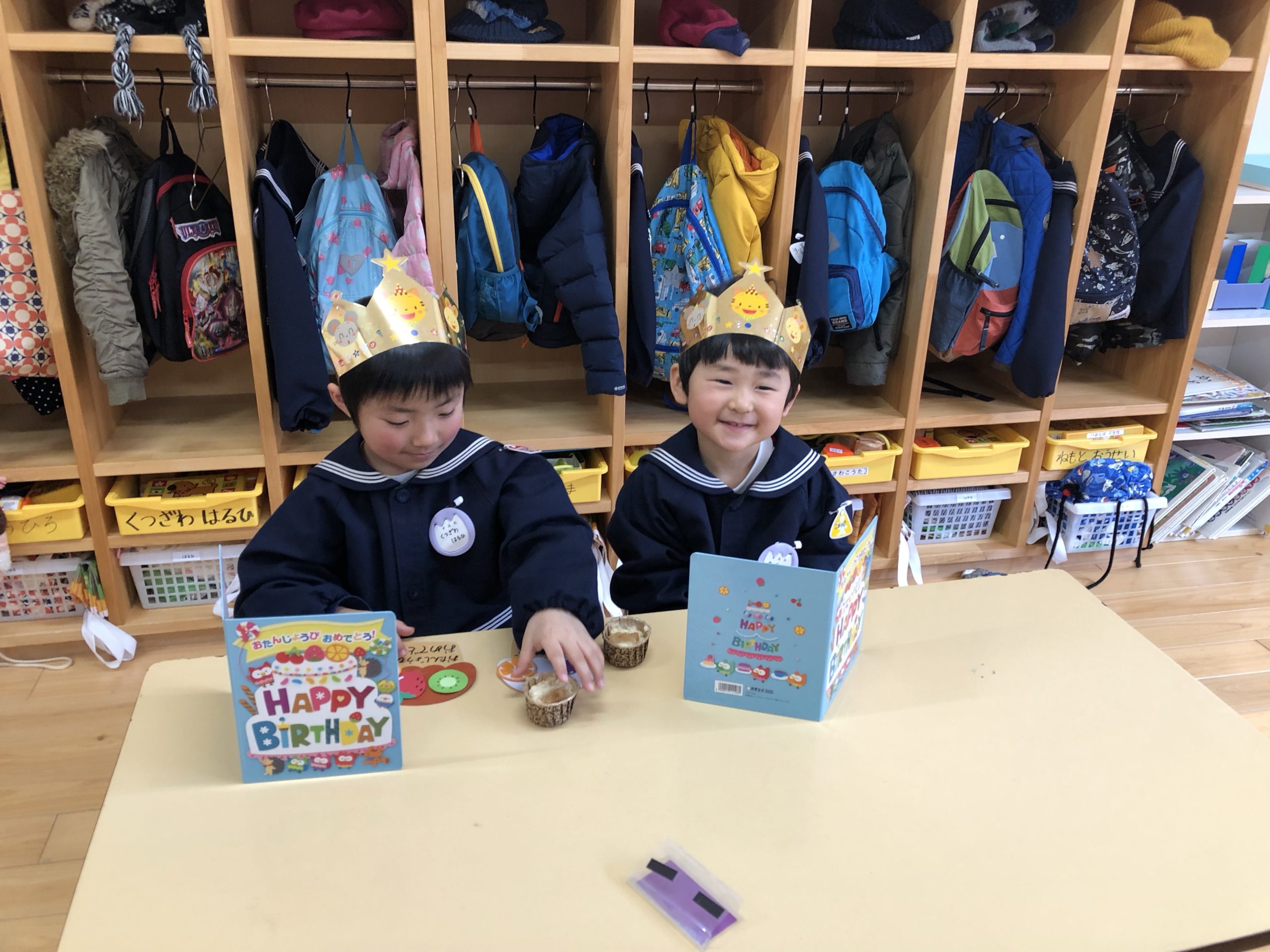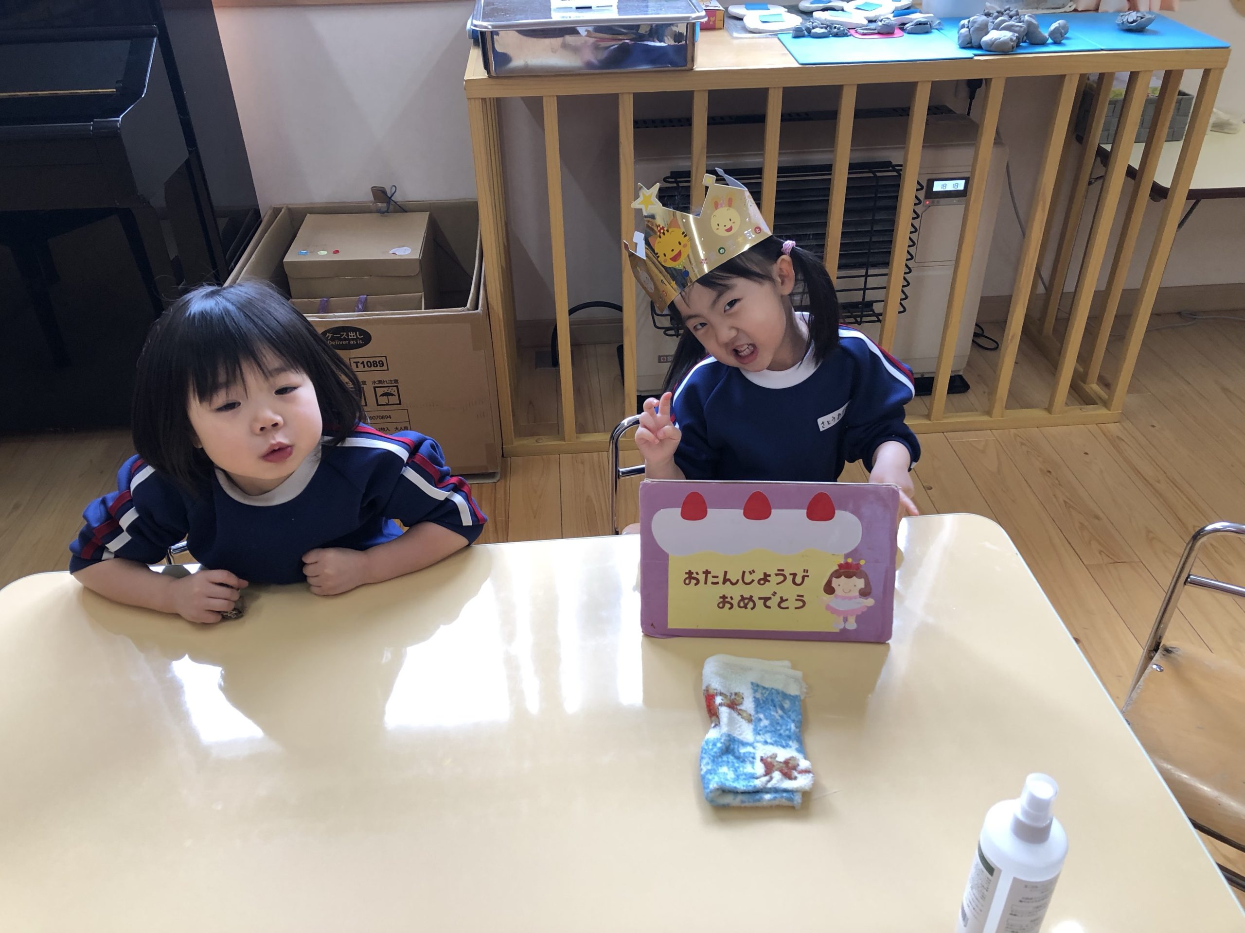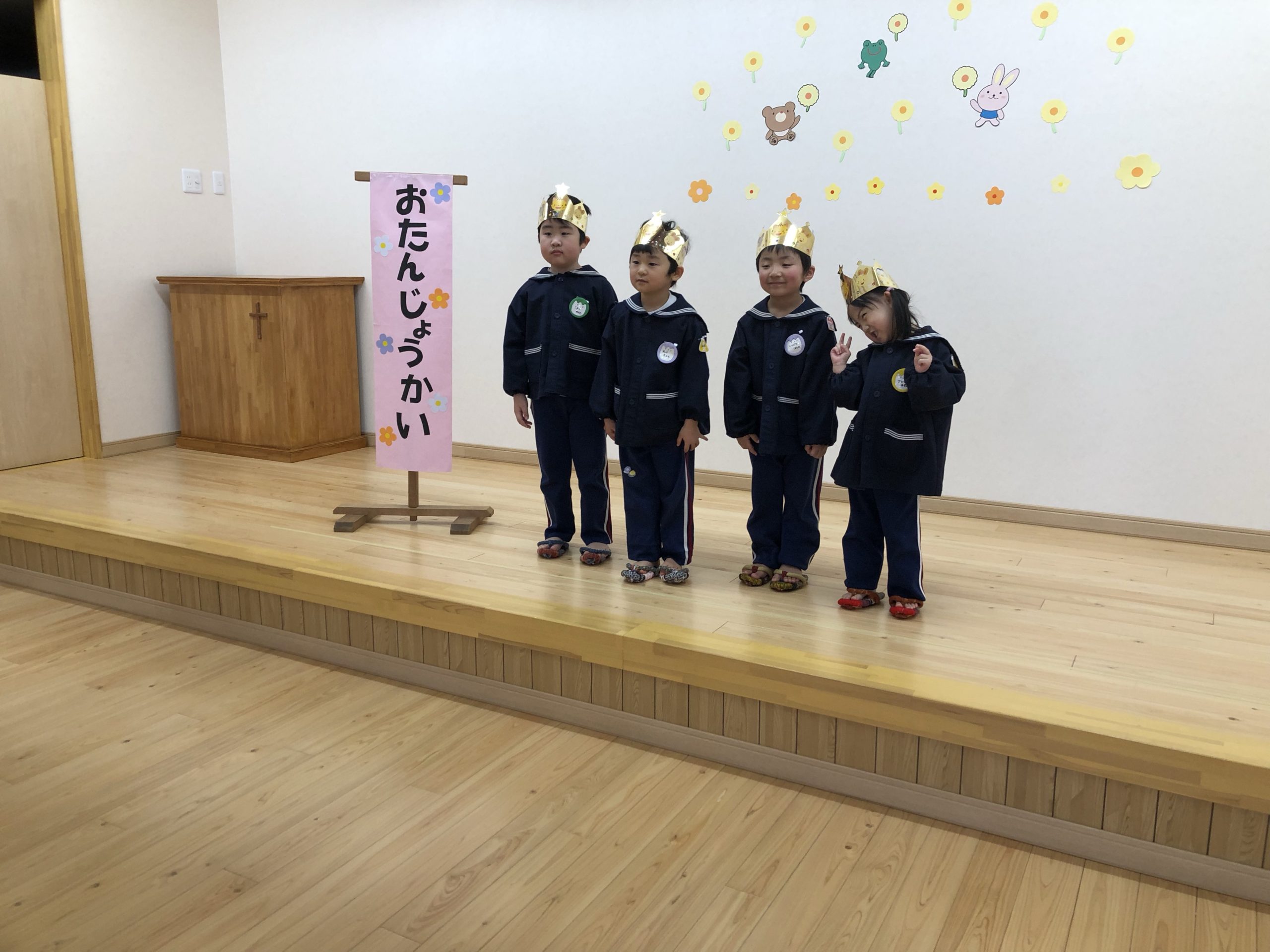 お誕生会(以上児クラス) 2022.03.05 やっと自分たちの誕生会だね! 嬉しいね!ニコニコ顔で事務室の前に並びました。 こんな風にここでお祈りしてもらっていたのか‥。 緊張する!! マイクを通しての自己紹介も大きな声言えました。 記念写真はリラックス!!お部屋でも素敵な笑顔!!