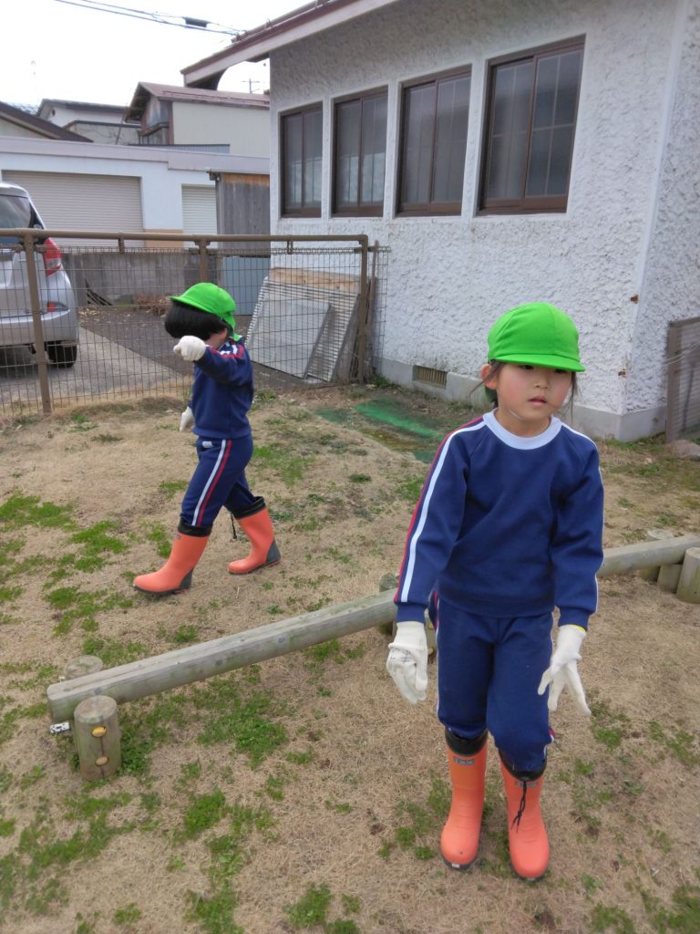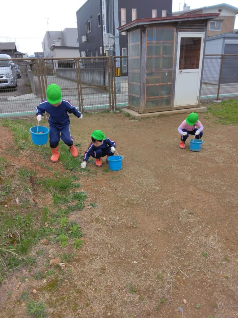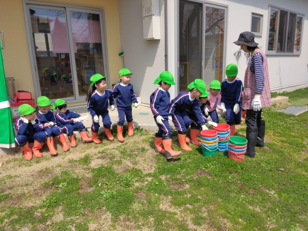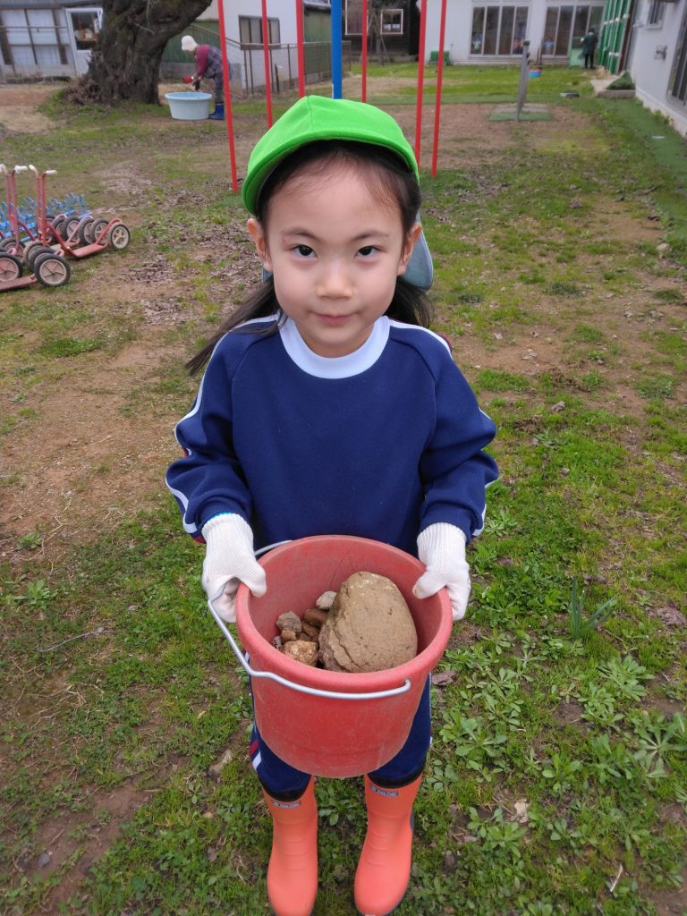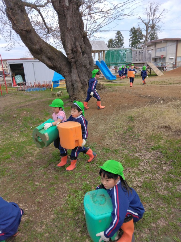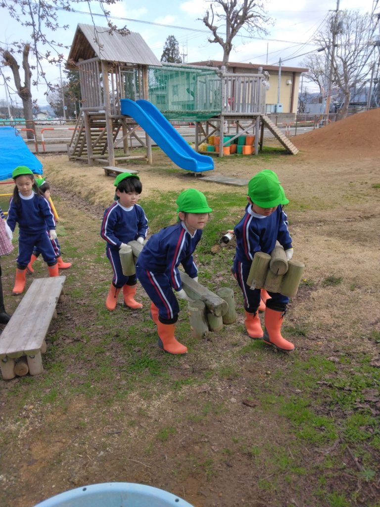 がんばるぞ!! 2025.04.18 恒例の年長さんによる園庭整備。 まずは石拾い、枝拾いをします。 その次は木の椅子やテーブル、平均台等を運びます。 これがとても重くて大変な作業です。毎年春には年長さんが汗を流しながら頑張っている姿を未満児クラスの子どもたちが窓から〝がんばってー〟と、応援してくれます。 ふぅーつかれた…。 力持ち!!