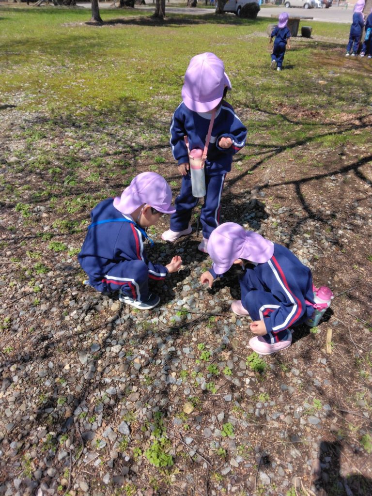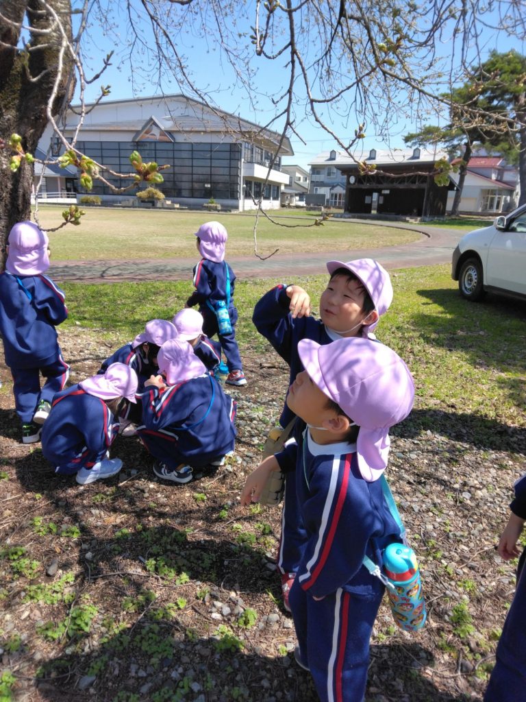 きれいだね 2025.04.22 ぽかぽか陽気の中、以上児は桜を見ながら散歩を楽しみました。 春をみつけましょうね!との保育者の声かけに、真っ先に桜をみつけたこどもたち!でもよく見ると、「白にも見えるし、ピンクにも見える」「きれいだねーあっちにもある!」と次々にみつけ楽しみました。 そして、よーく見ると桜のつぼみを発見!!この前読んでもらった本と一緒だと気づき、みんなでじっくり観察し、帰ってきました。