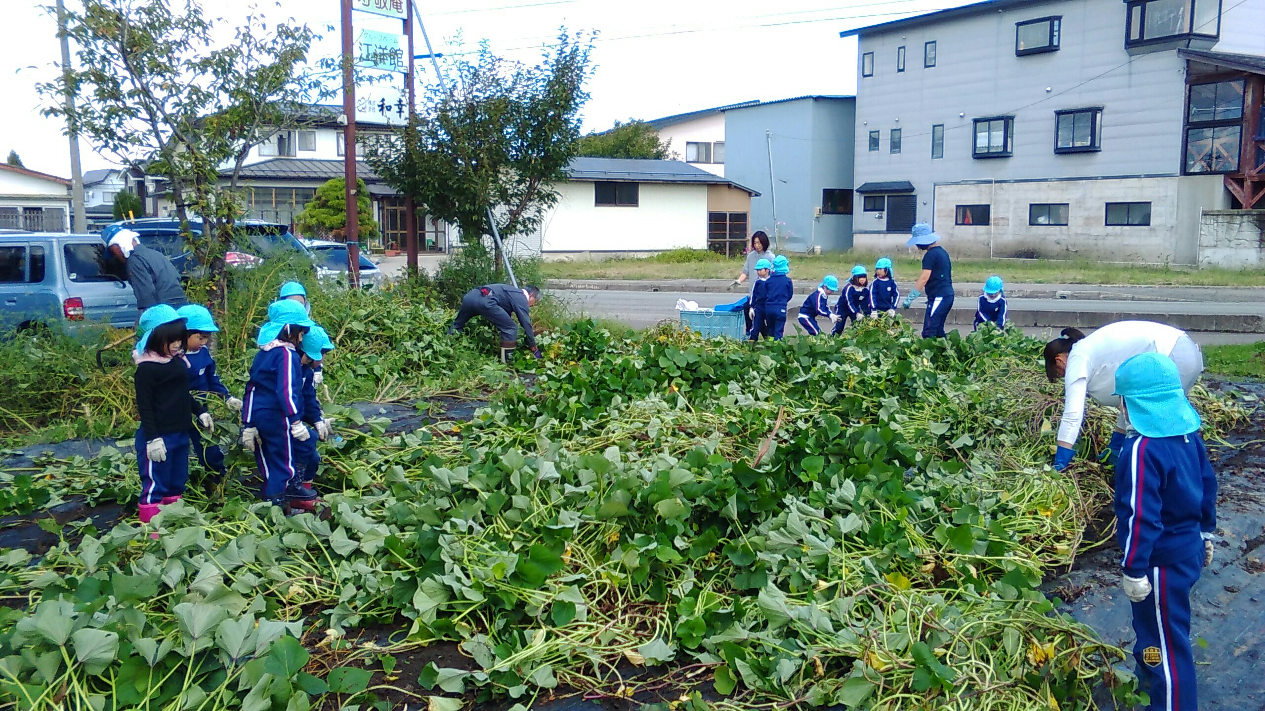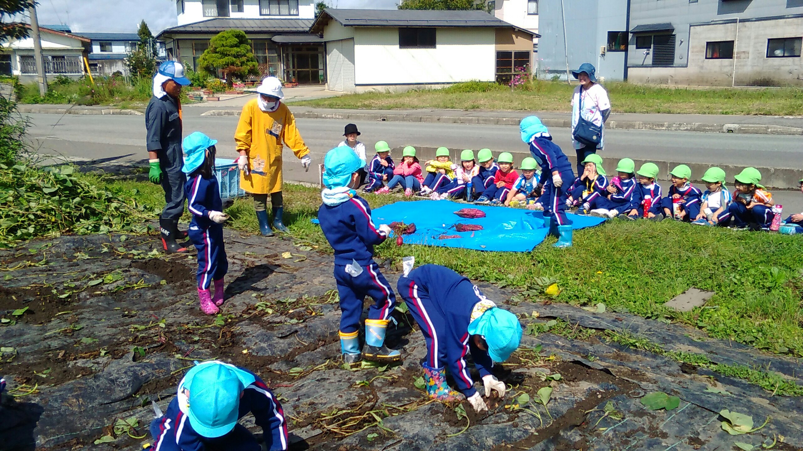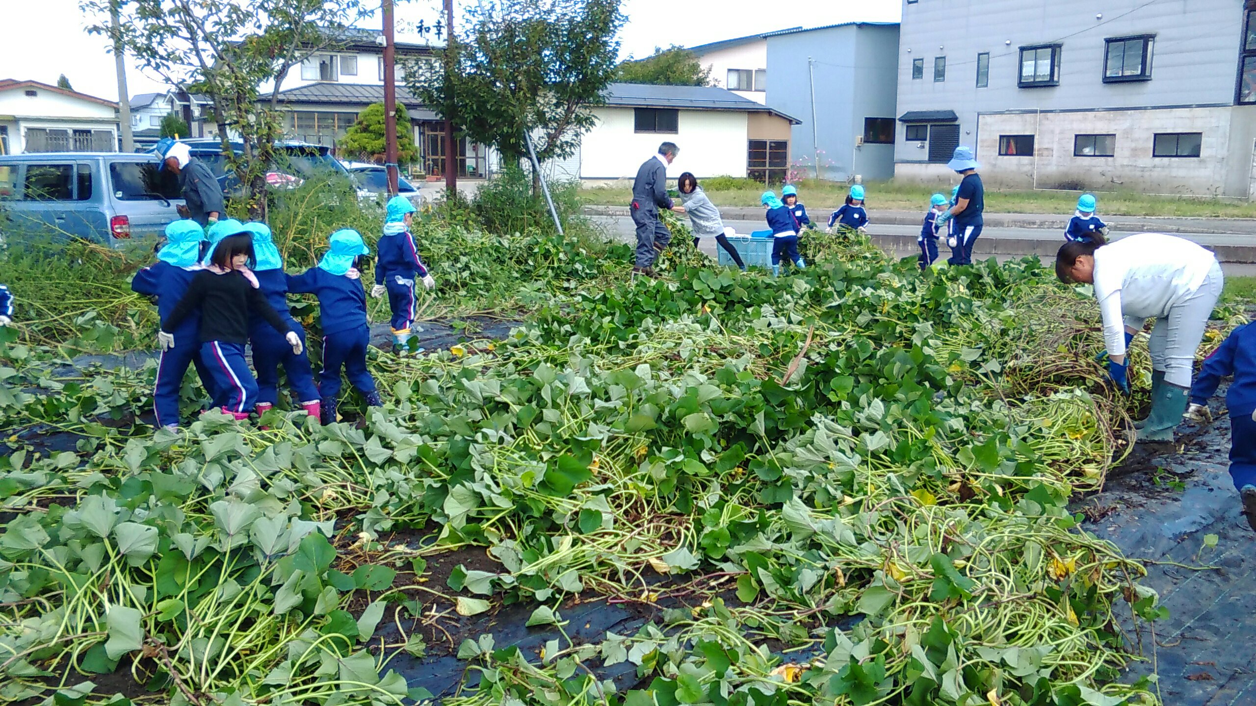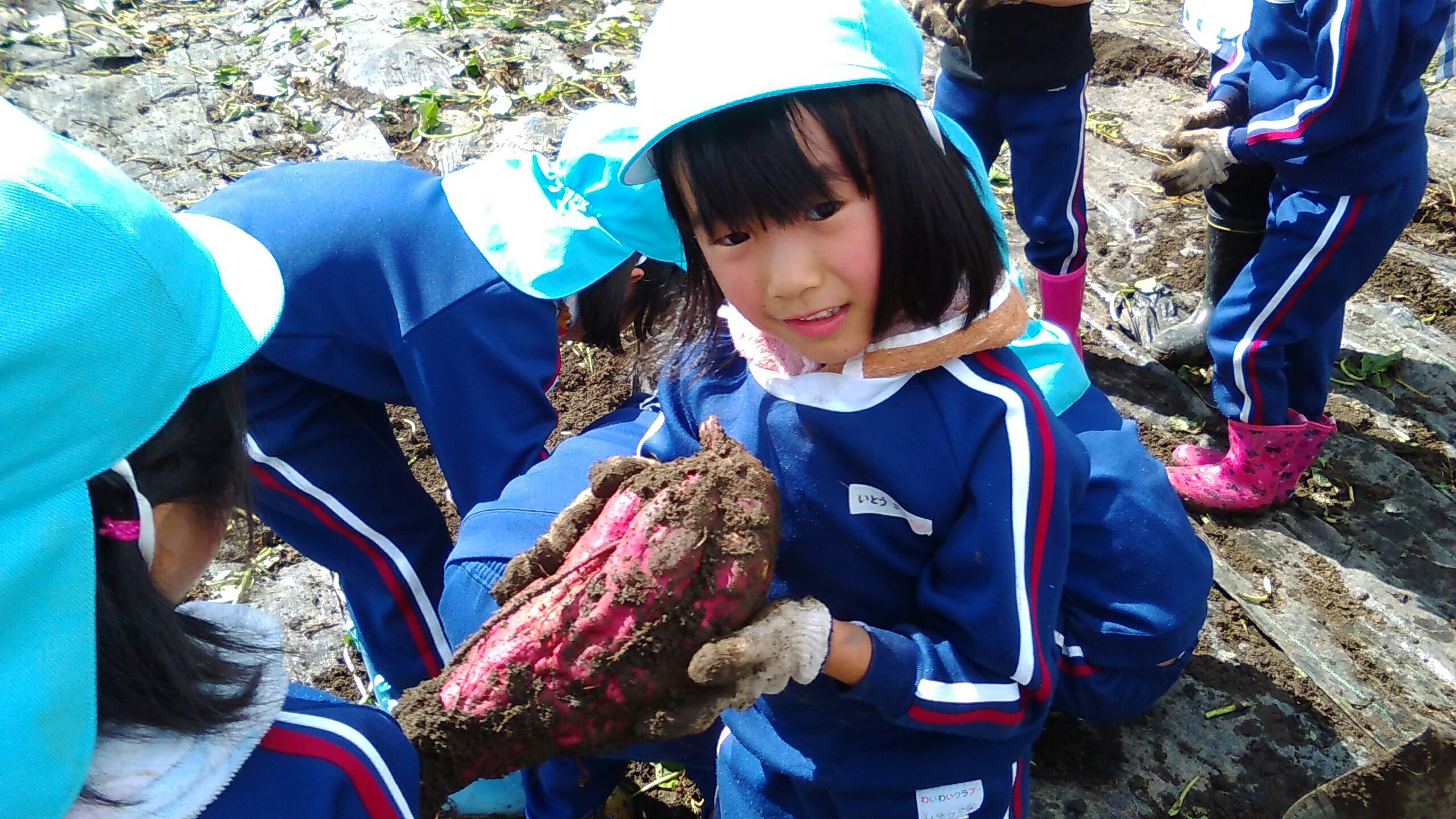 みんなで力を合わせ、声を合わせ、「よいしょーよいしょー!!」とひっぱります。今年は例年になく、とても大きな巨大なさつまいもがゴロゴロとあり、さつまいもの強さに負けてしまいましたが、そこら中で大歓声が沸き起こり、しりもちをつきながらも、楽しく活動することができました。