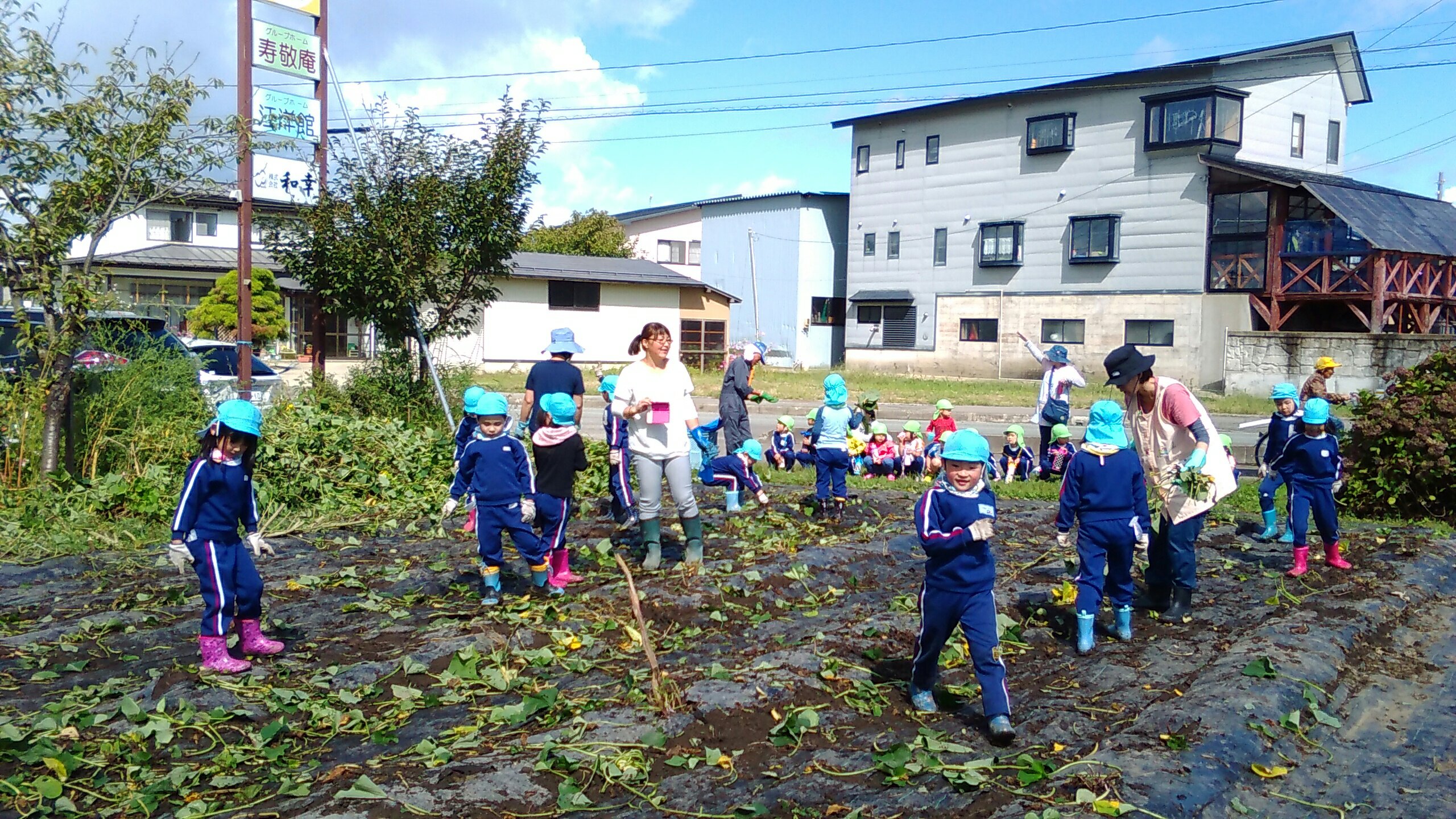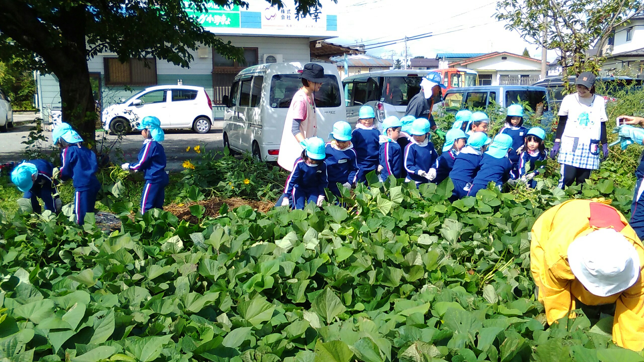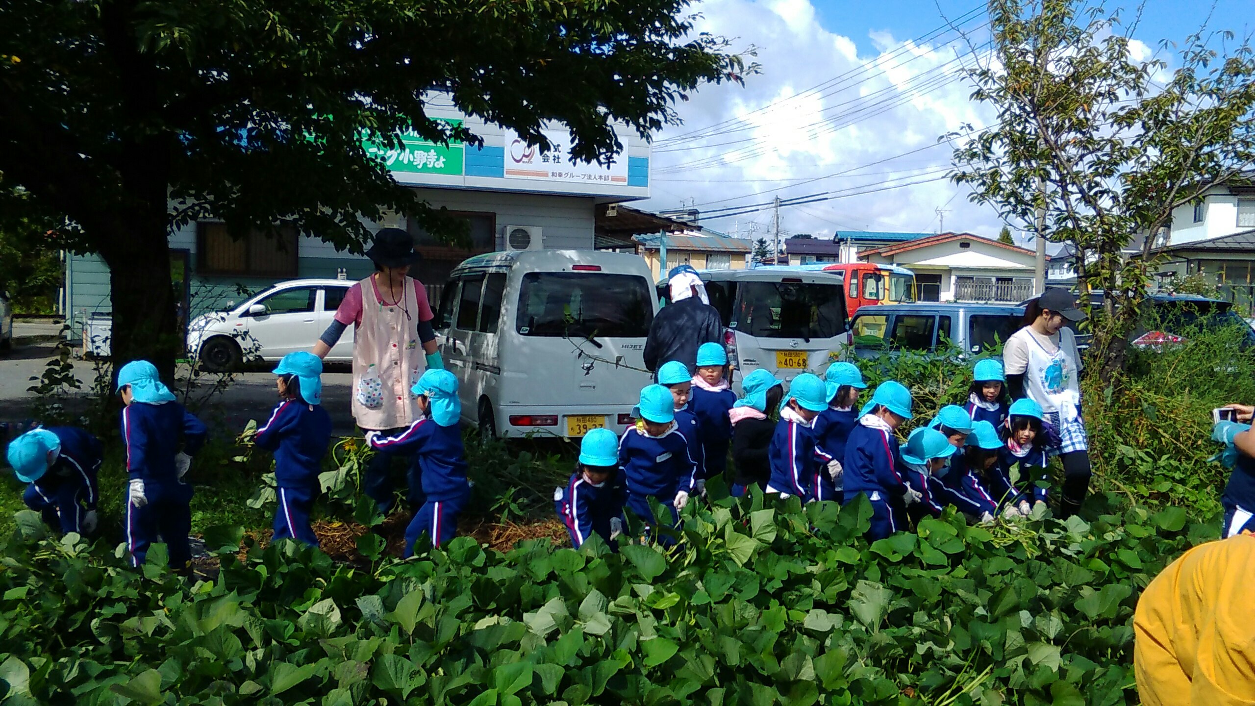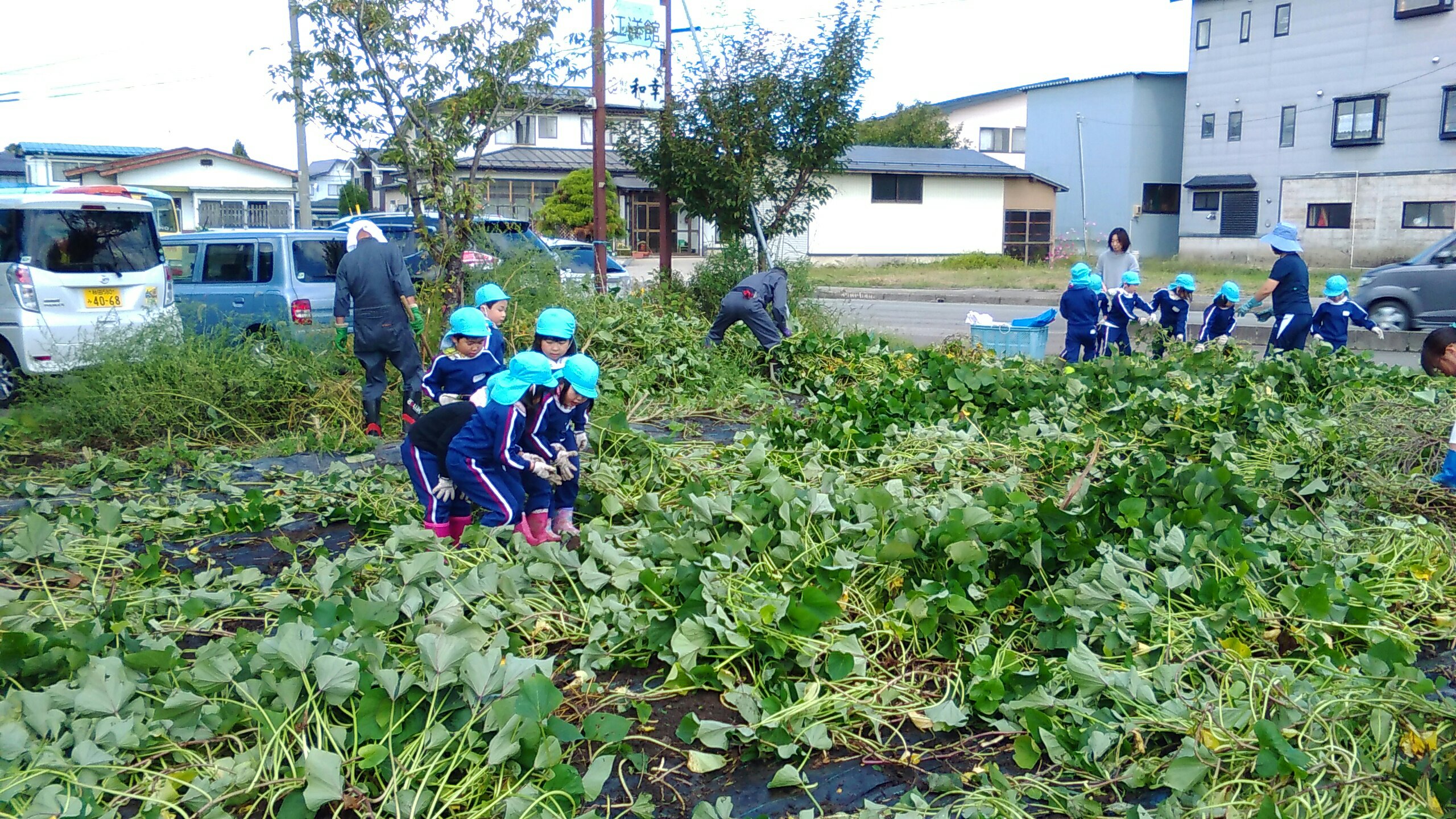 みんなで力を合わせ、声を合わせ、「よいしょーよいしょー!!」とひっぱります。今年は例年になく、とても大きな巨大なさつまいもがゴロゴロとあり、さつまいもの強さに負けてしまいましたが、そこら中で大歓声が沸き起こり、しりもちをつきながらも、楽しく活動することができました。