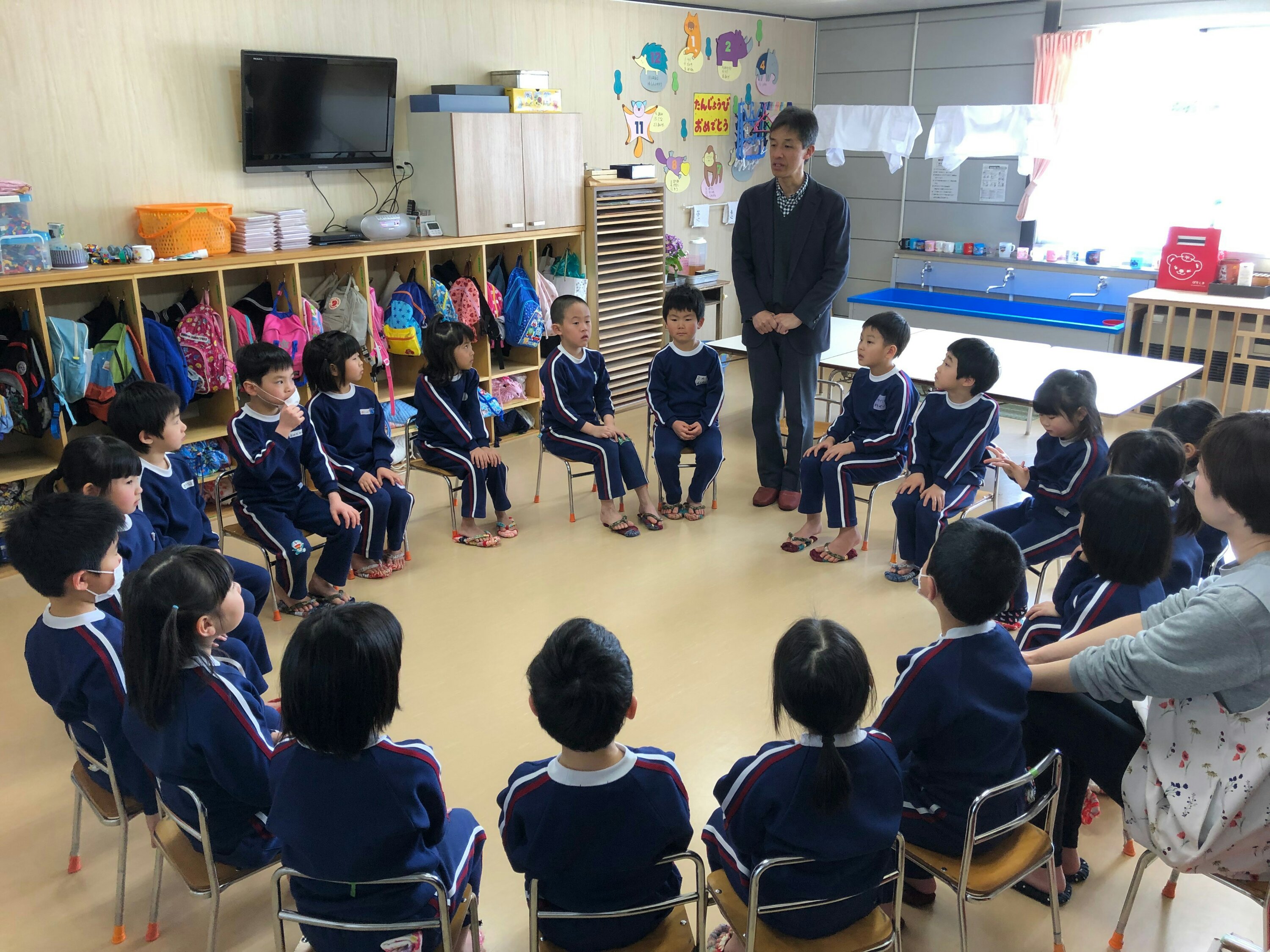 今日は、牧師先生が園に来てくださり、ゆり組さんの部屋でお話とお祈りをしてくださいました。