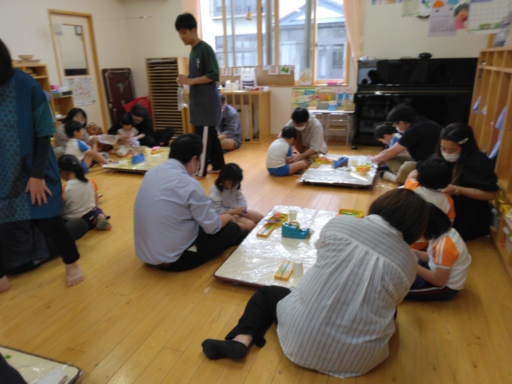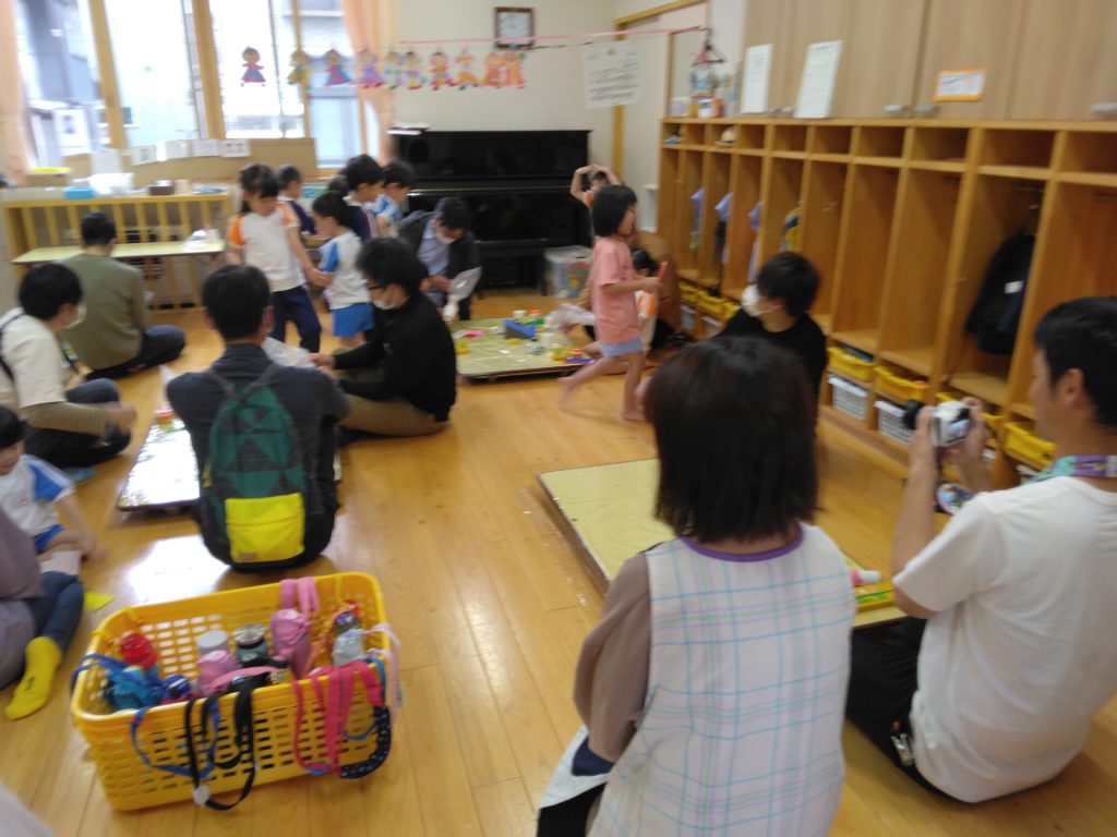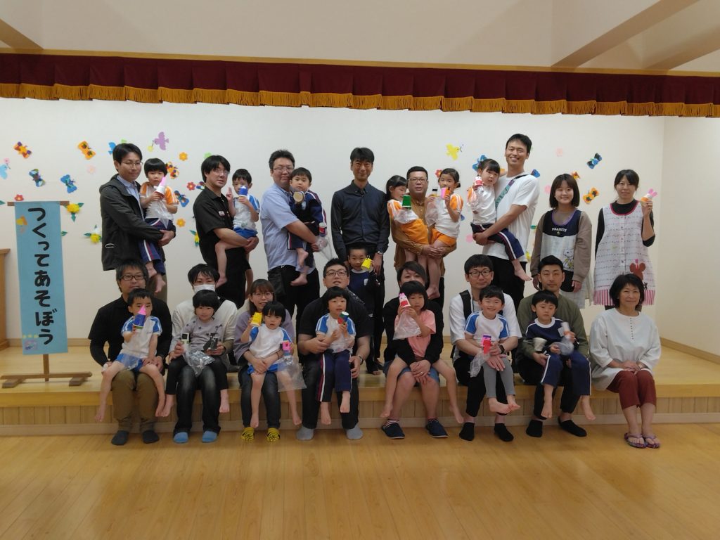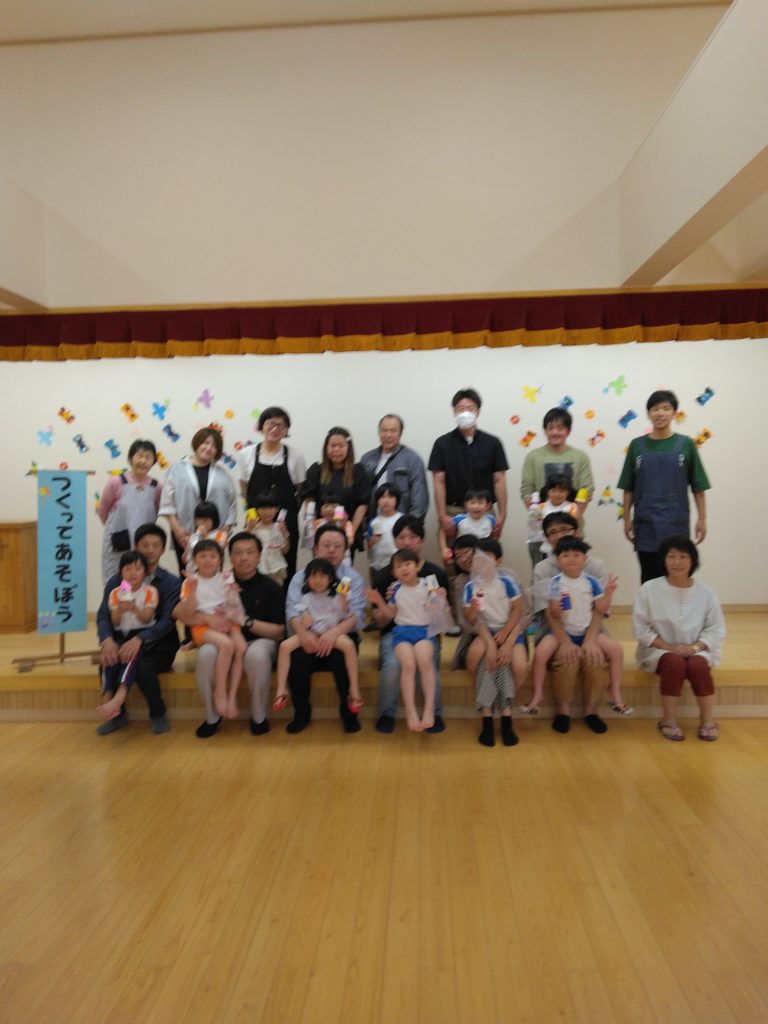 つくってあそぼう!! 2023.06.03 今日、以上児クラスでは6月の父の日に合わせて〝つくってあそぼう〟が行われました。 お家の方と一緒に登園をしてきた子どもたちの顔はニコニコでした。でも、中にはいつもと違ってたくさんの大人がいることにびっくりしている様子の子どもたちがいました。 2019年度に行って以来の全クラスでのつくってあそぼうでした。 今回は〝空気で飛ばそう〟ということで、紙コップと袋を使った制作でした。 作った後は実際に飛ばしてみました!! 記念写真もばっちり!!