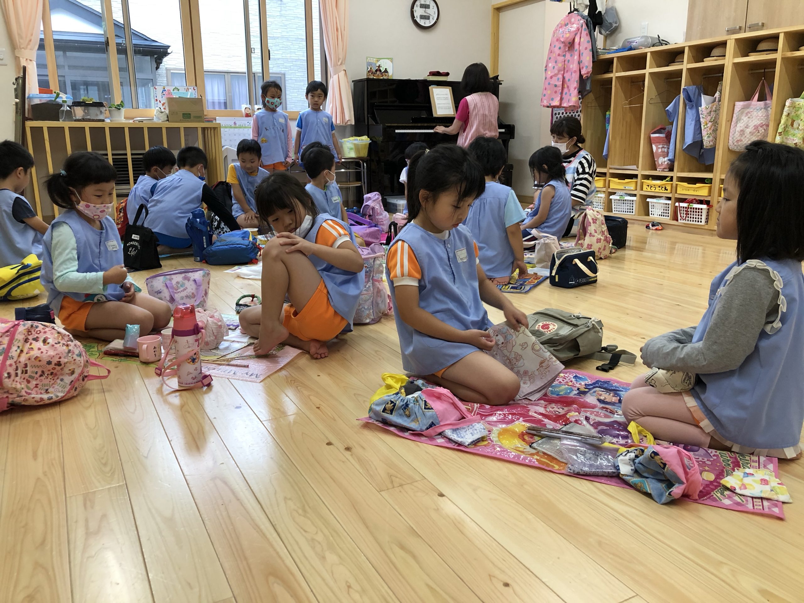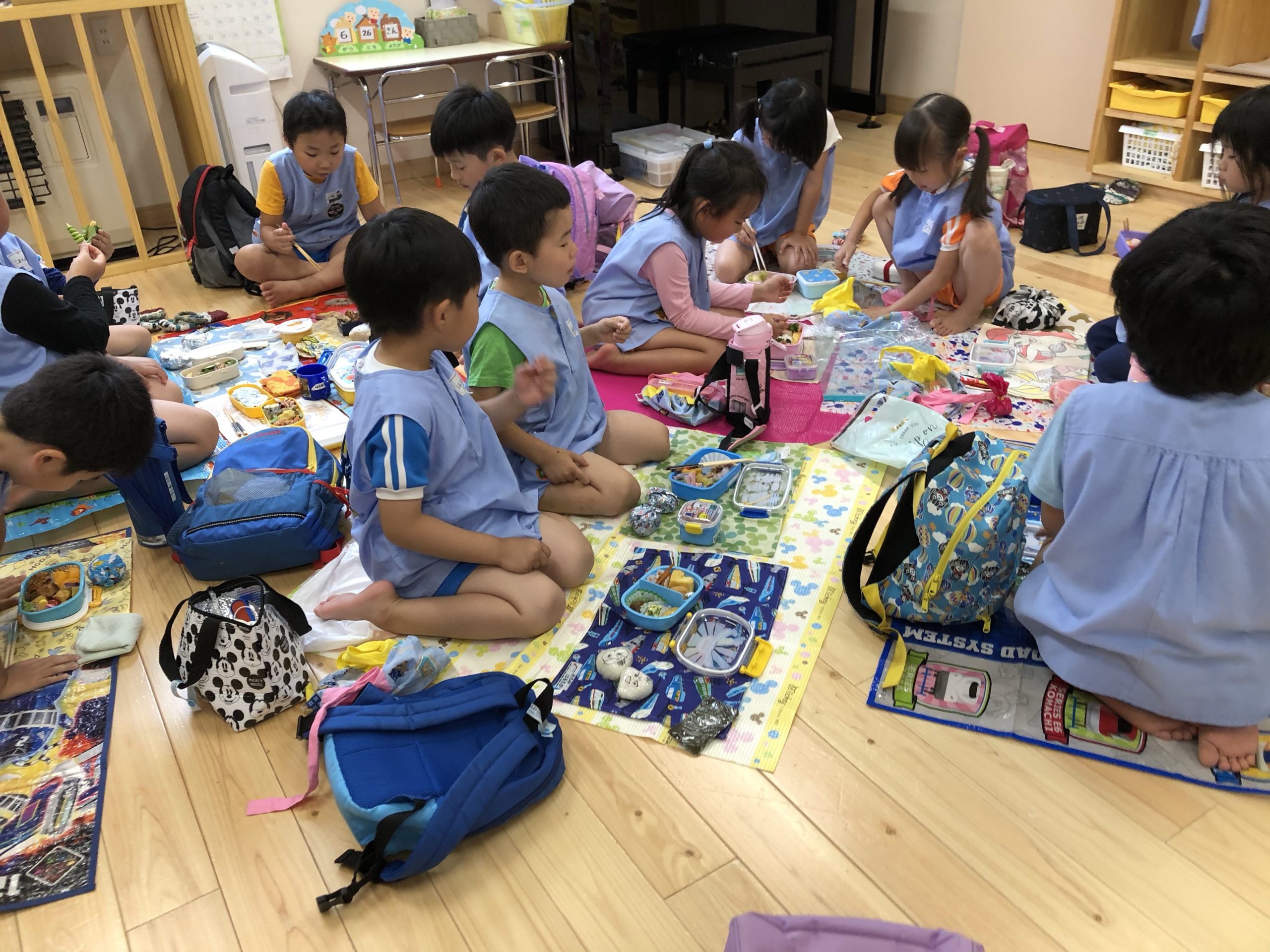 ねぇ、わたしのお弁当はね。 2020.06.26 今日ゆり組の子どもたちはリズム遊びの後に遊戯室で綱引きをしました。 あまりにテンションが上がりすぎて擦り傷?をつくってしまった子どもたちがいます。 たくさん身体を動かした後にはみんなが昨日から楽しみにしていたお弁当です。 シートを敷いてお友だちと、「ねぇねぇ、わたしのお弁当ね〜」 「ぼく、おうちの人と一緒に作ったポテトサラダ入れてきたよ」 楽しい会話がたくさん聞こえました!!