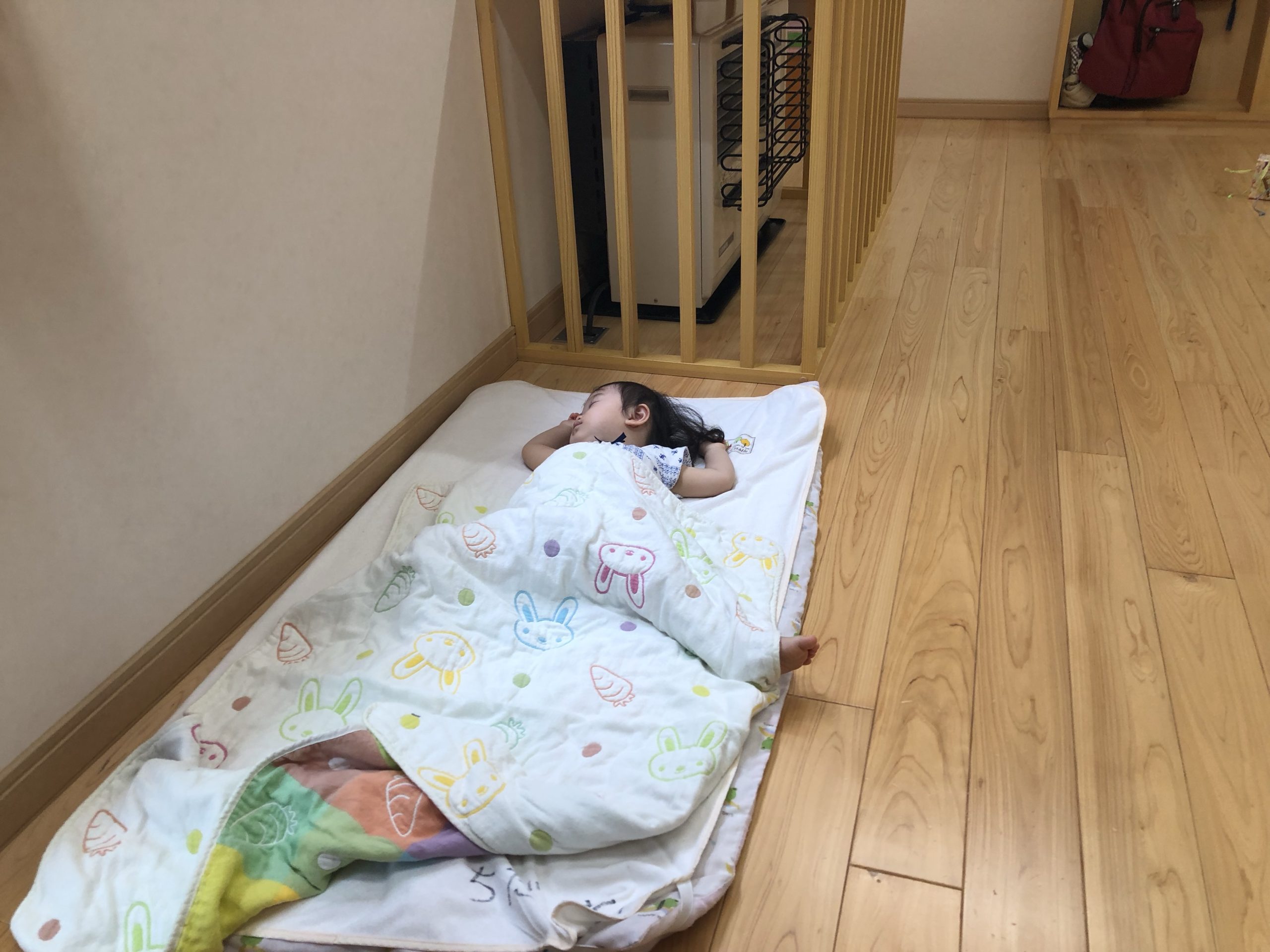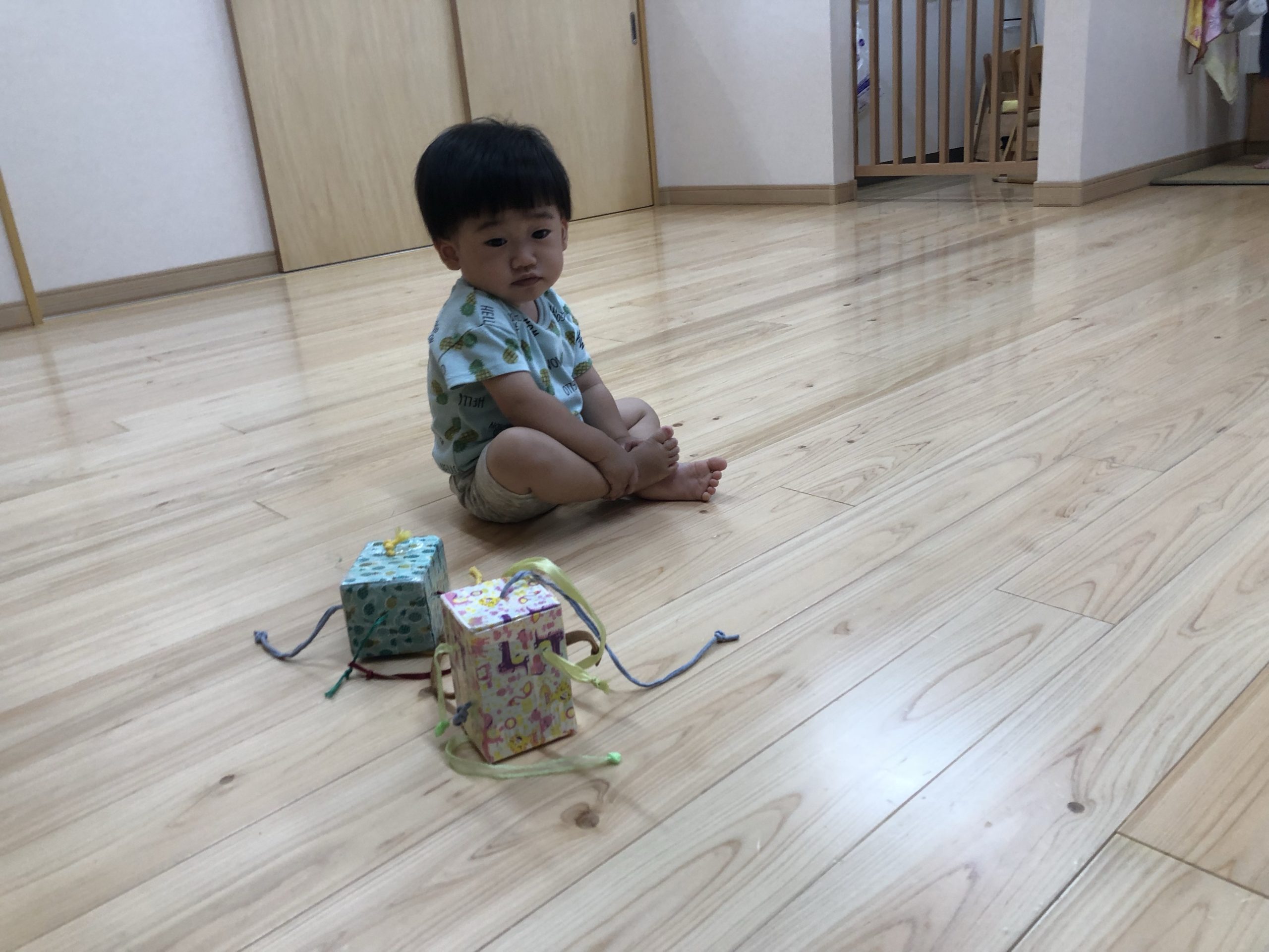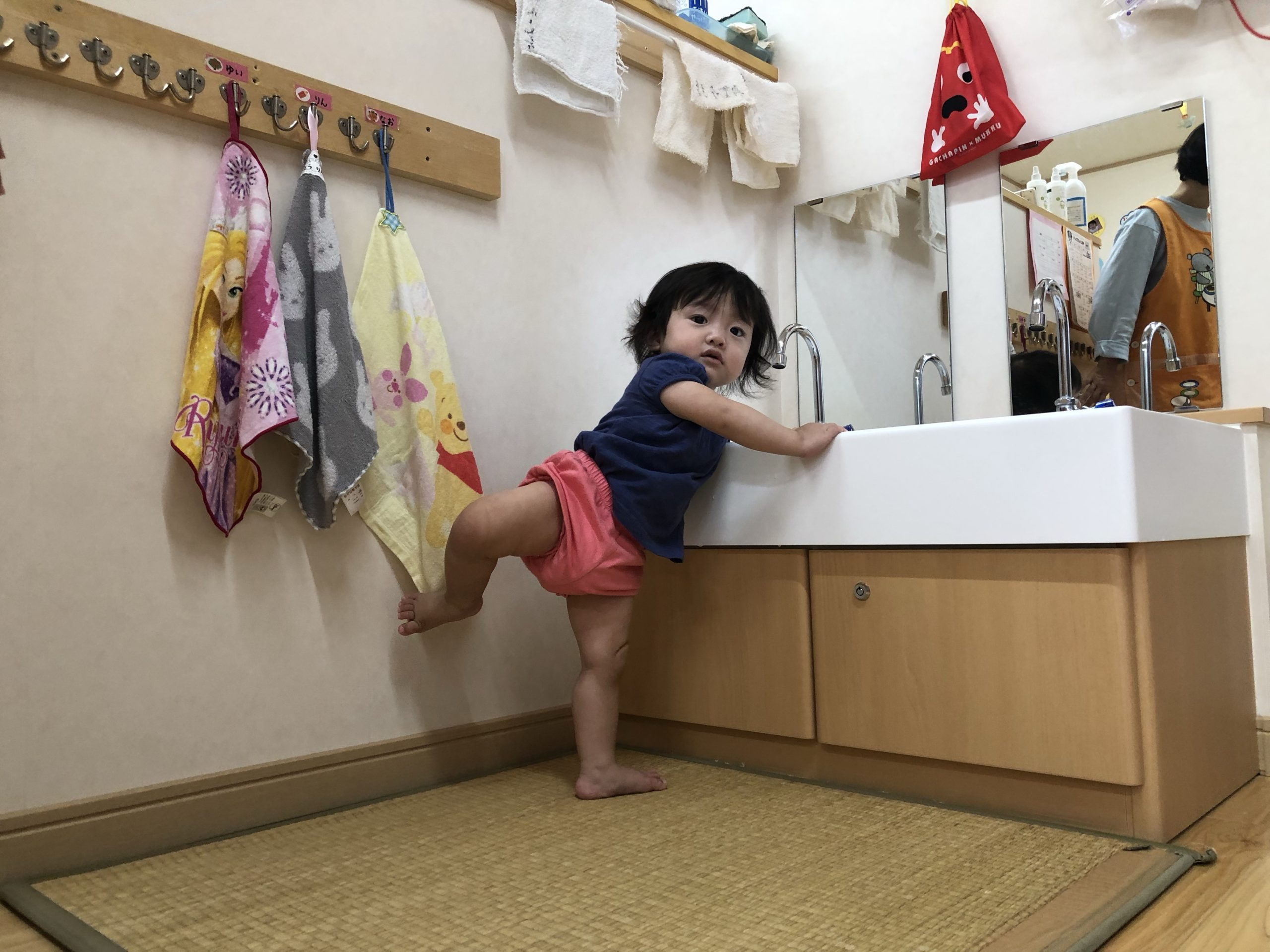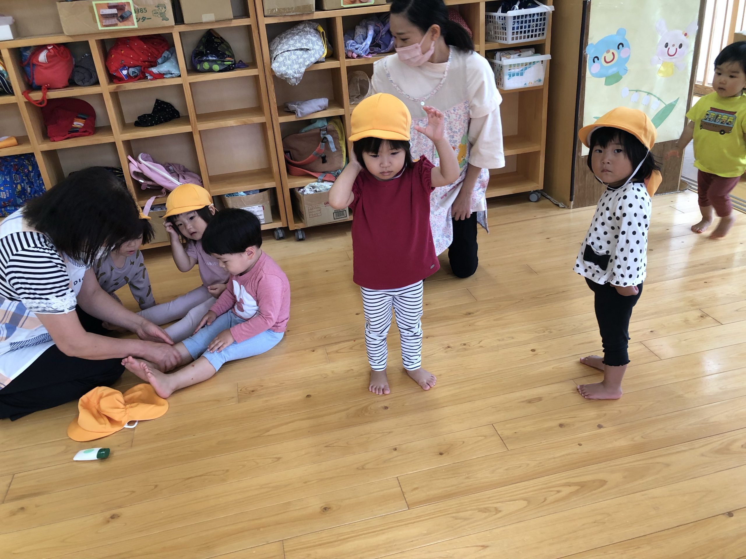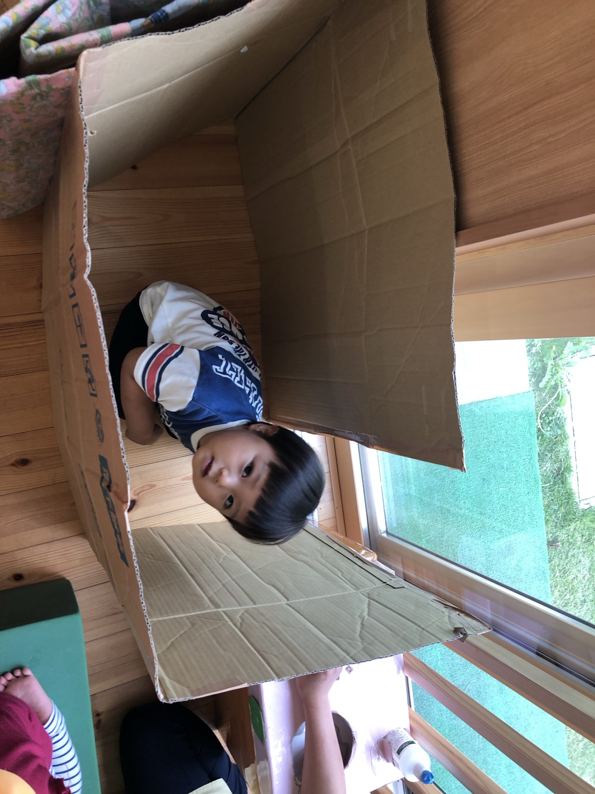 のーんびりと!! 2021.09.24 もも組のお部屋では午前寝のお友だちのそばで鏡に映る自分の顔ににこり!そして、もう1人‥。手作りおもちゃに手を伸ばして遊ぼうしている所へカチャと写真の音に気がついてどちらもカメラ目線!! すずらん組はこれからお外に行きまーす!!の準備でした。 だーれ?箱に隠れている子は?