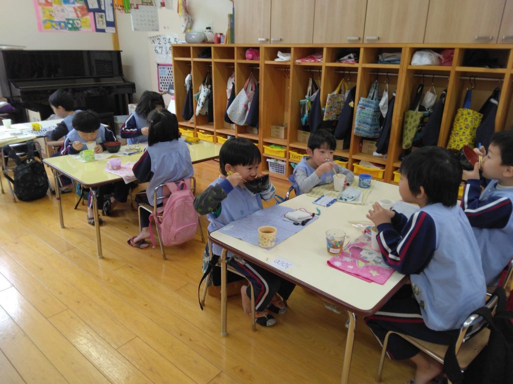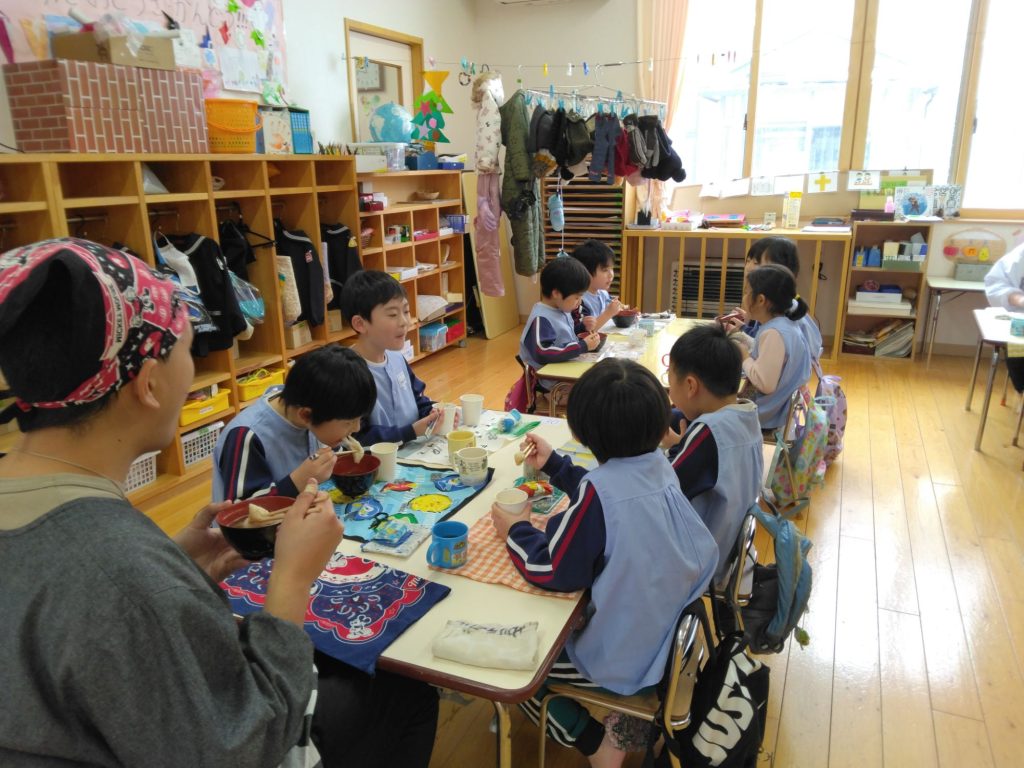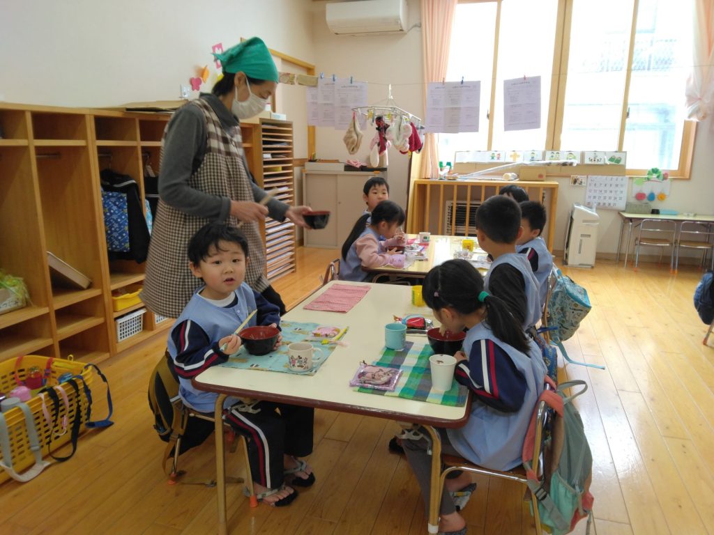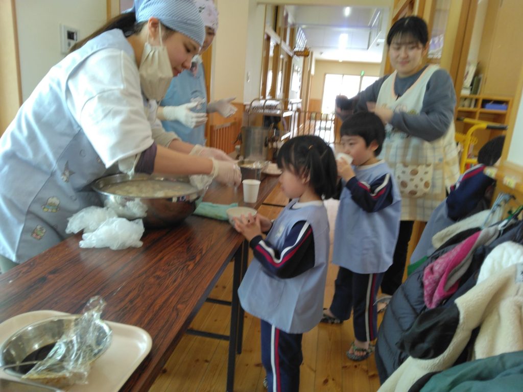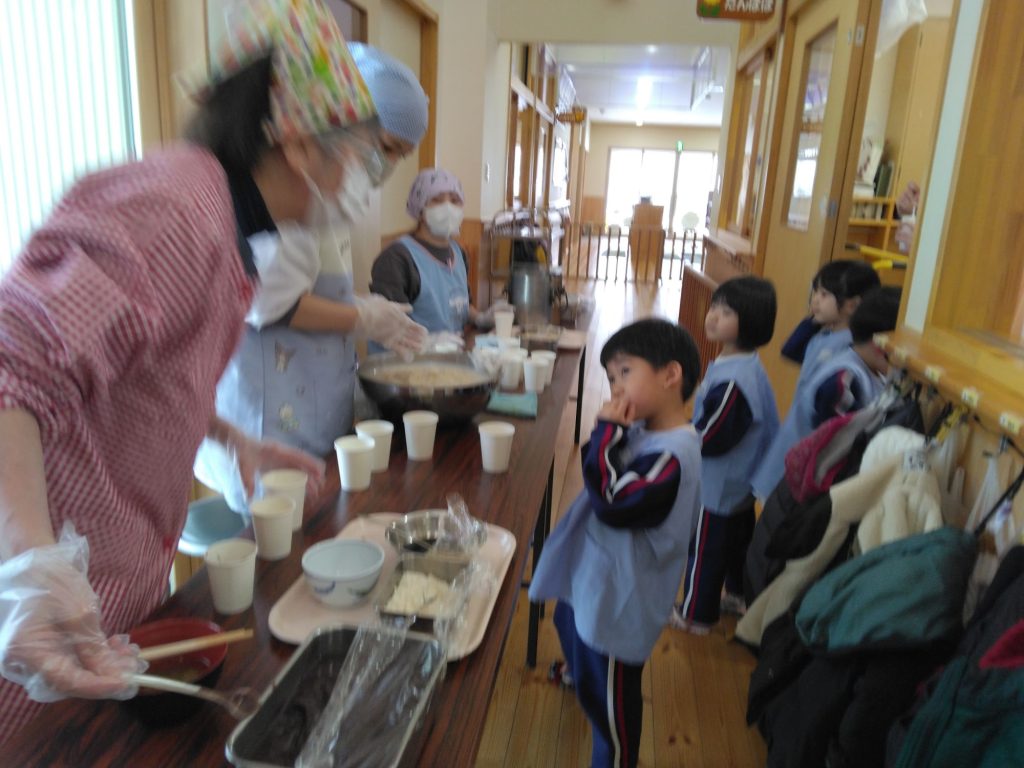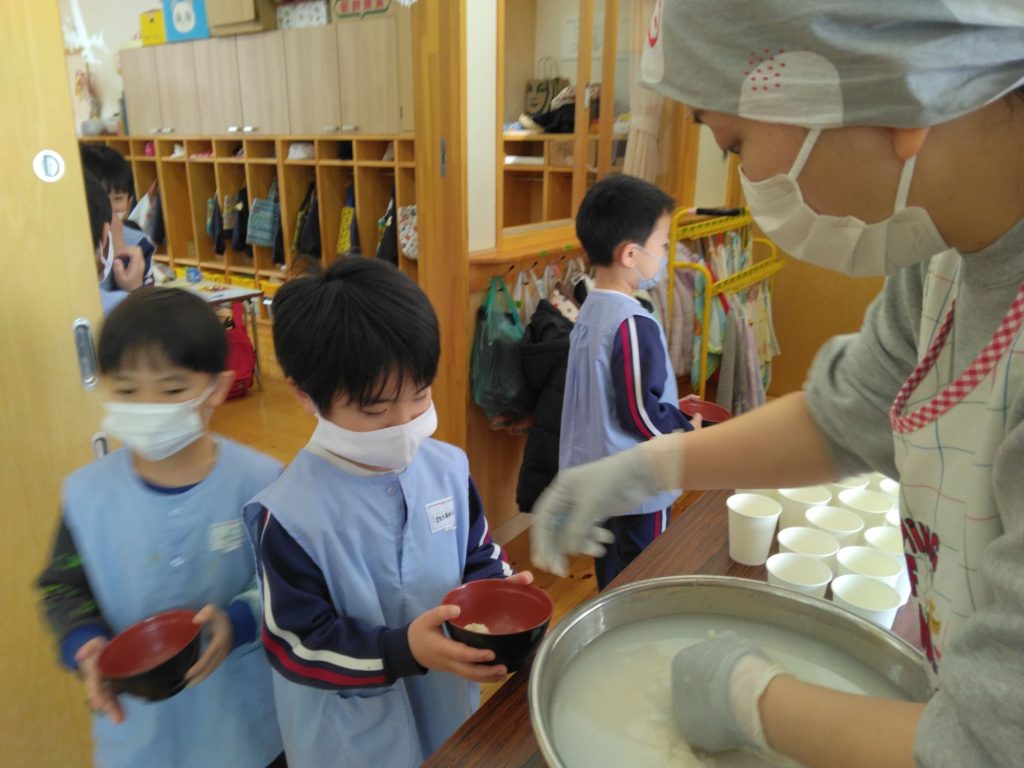 もち給食 2025.01.17 今日は以上児クラスではもち給食でした。 雑煮、きな粉、あんこ、納豆、醤油砂糖の五種類の中から好きな味の餅を食べました。何度もおかわりをしていました。 未満児クラスはお弁当でした!! 朝から「お腹が空いた」と訴えている子どもたちでした。