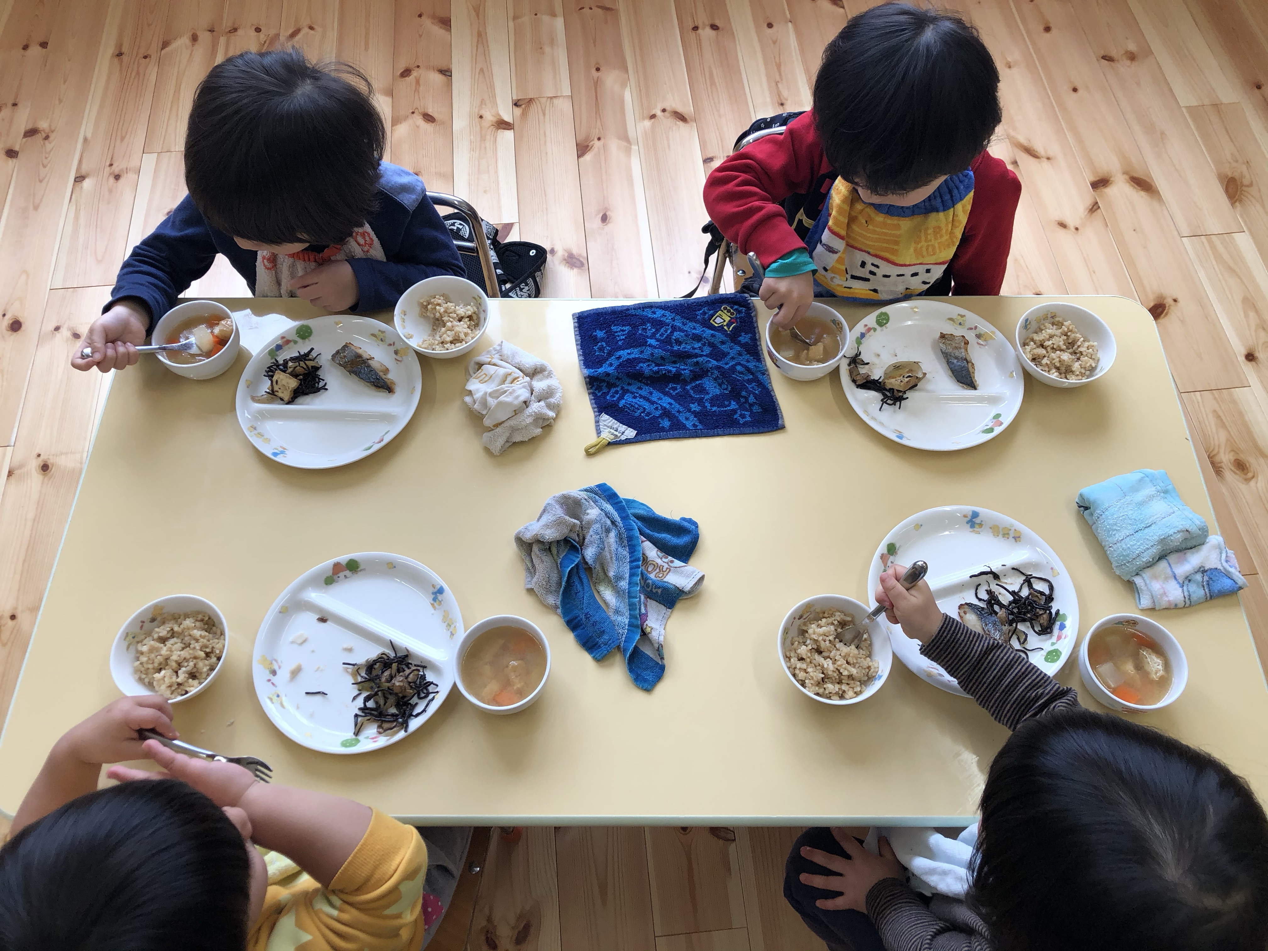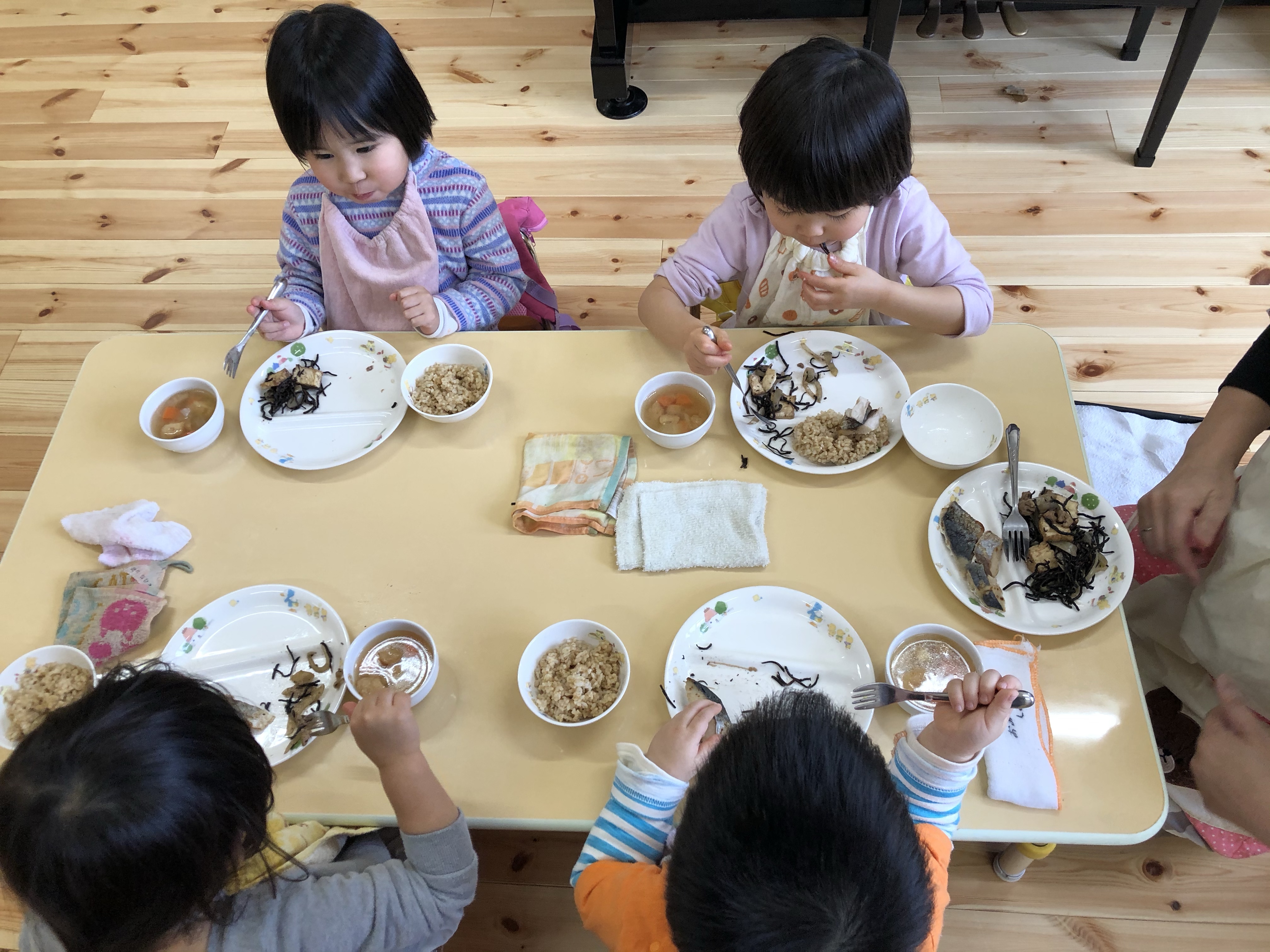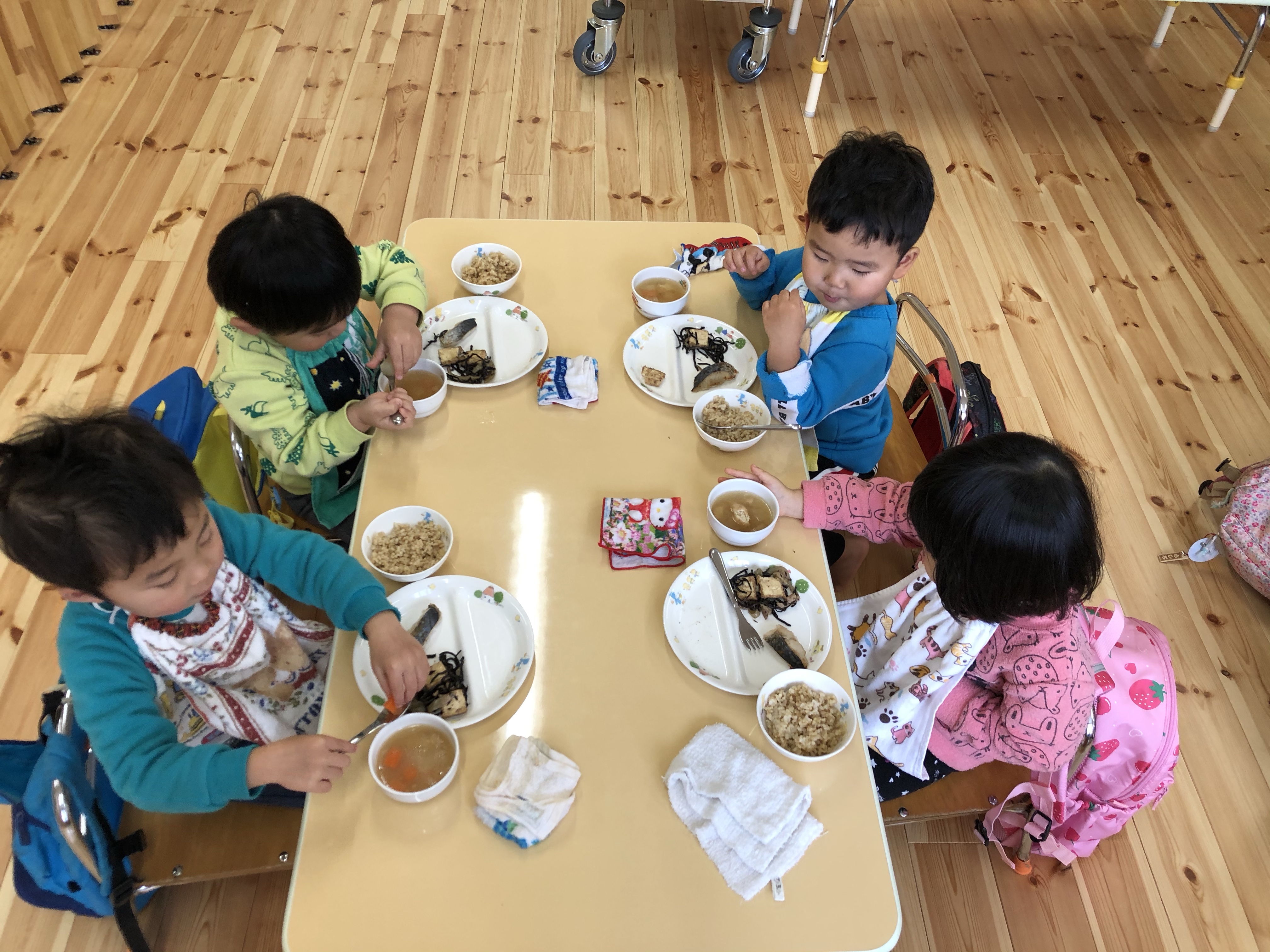 小ホールで食べているひまわり組さん。もりもり食べていました。