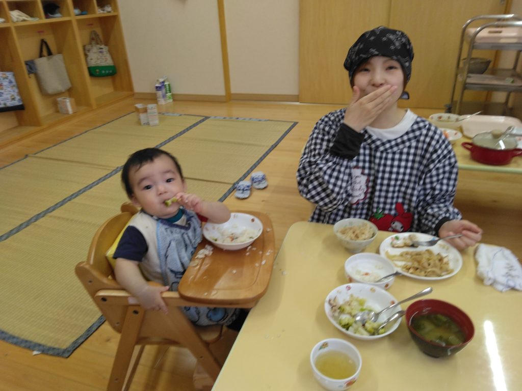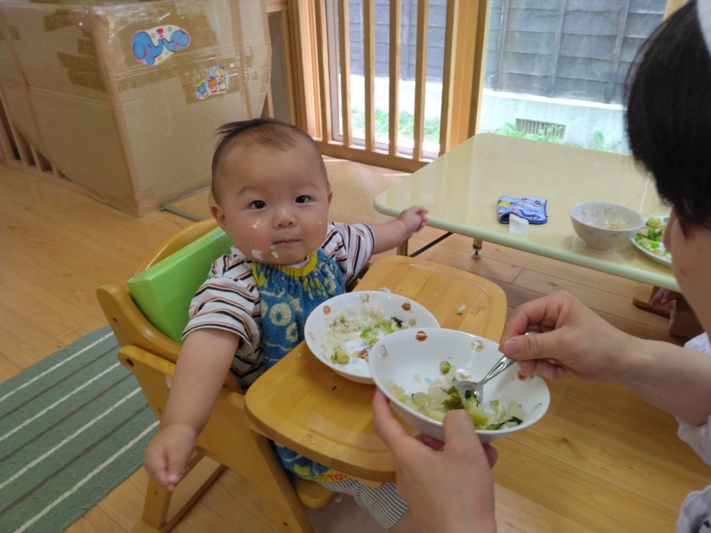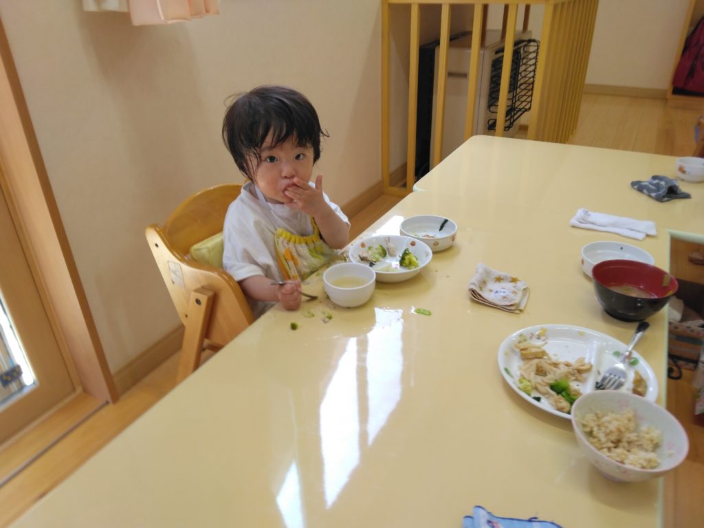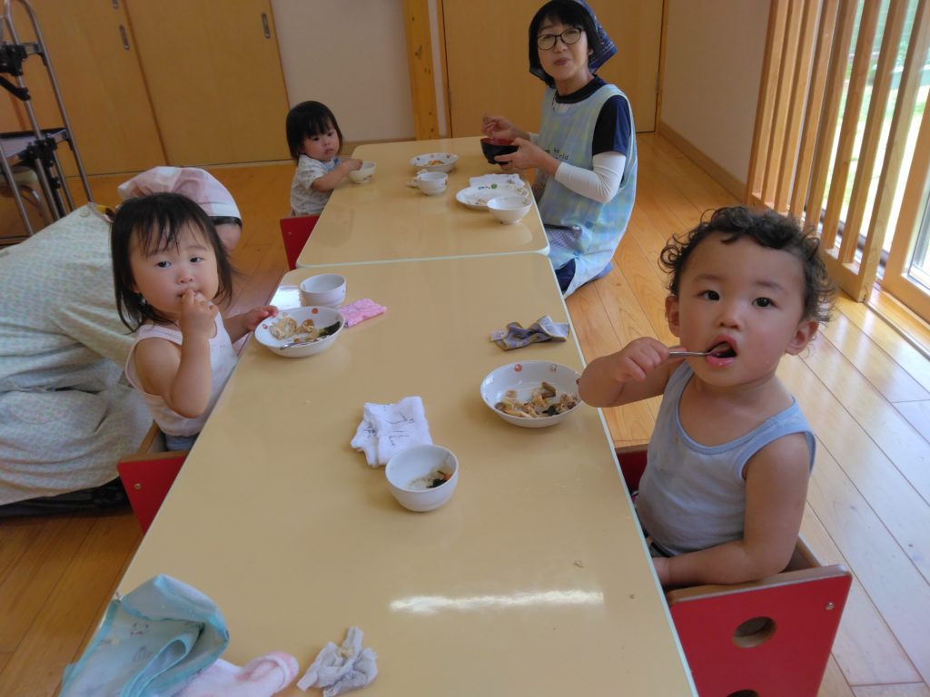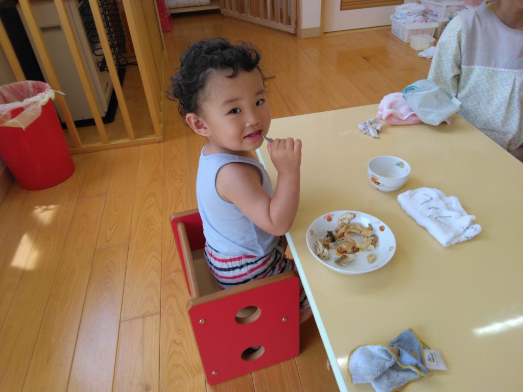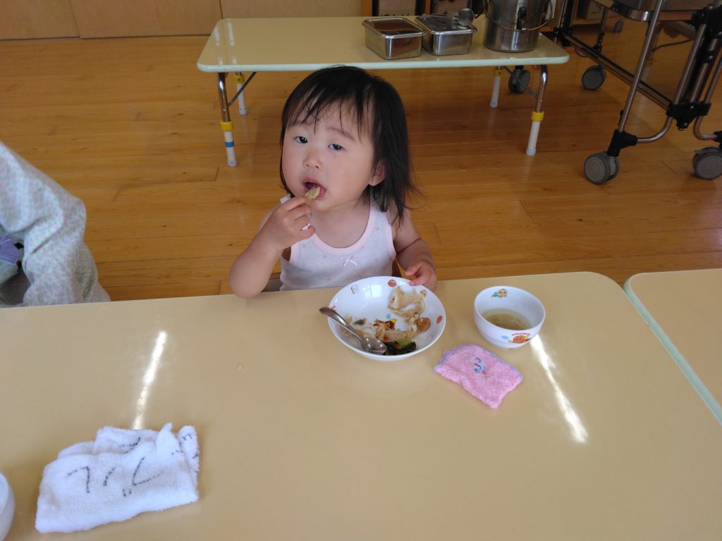 もりもりたべてます!! 2023.06.08 散歩を終えたすずらん組の子どもたちはもりもり給食を食べています。 園庭で遊んだもも組の子どもたちも手づかみ食べでもりもり食べていました。どうしても、カメラを向けると動作がストップして笑顔を見せてくれます。