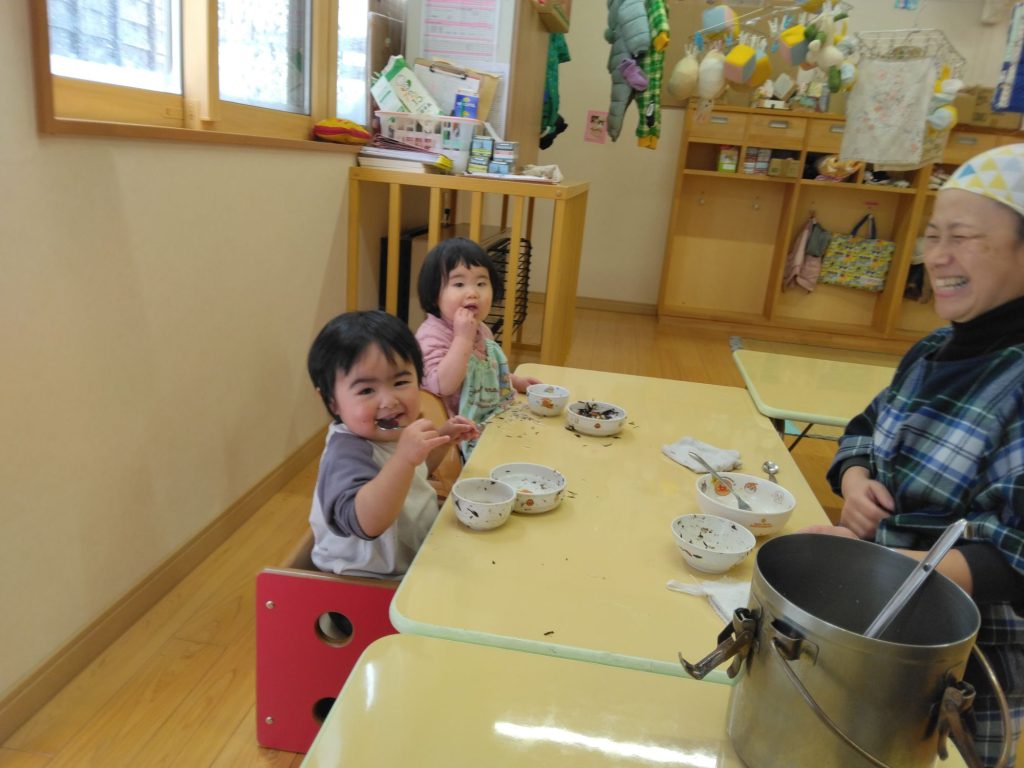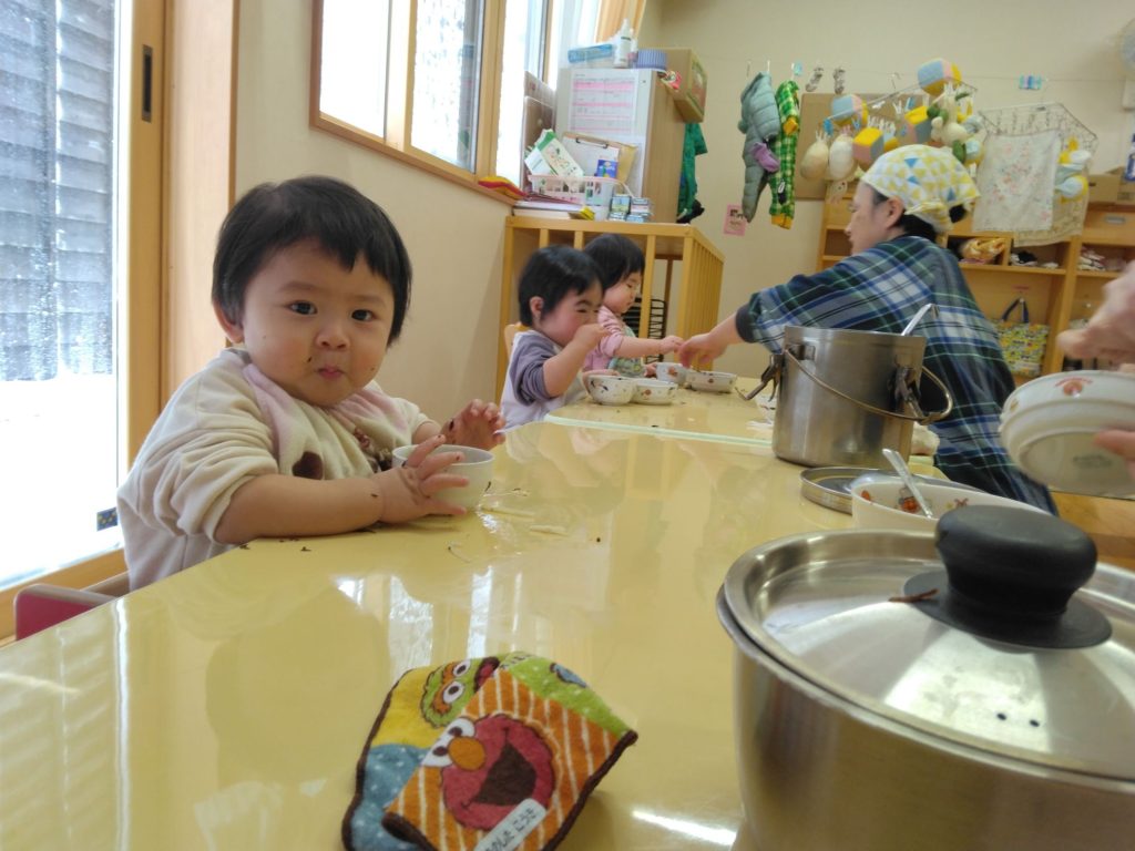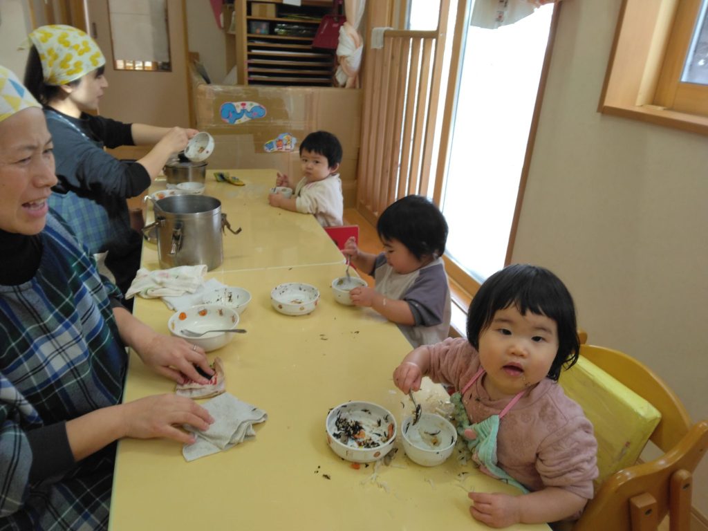 もりもり食べるぞー! 2025.01.31 未満児クラスの給食の様子を覗いてみました。 テーブルいっぱいお皿にしてもりもり食べていました。 隣りのすずらん組さんはどうでしょうか。 「食べてますか?」と声をかけたら「かじだったね。」「おそとににげたね」と、給食のことよりも避難訓練の事が心に残っていて写真を撮っている先生に「にげた?」と聞いていました。食欲旺盛です!