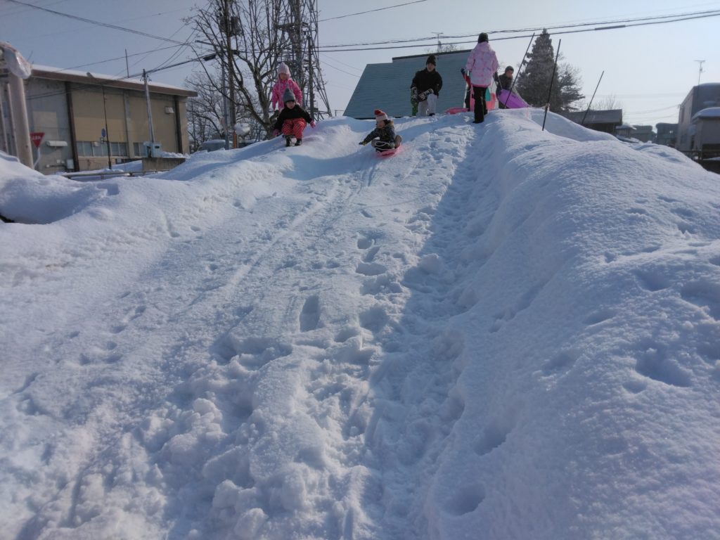 築山に積もった雪を利用した滑り台を作ってもらい、子どもたちは楽しそうにソリで滑っていました。