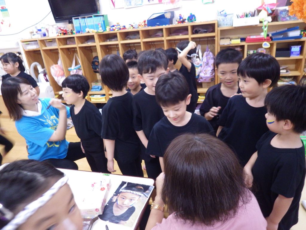 本番の日は突然の大雨が降り、お部屋で化粧をしていた子どもたちは心配そうでした。