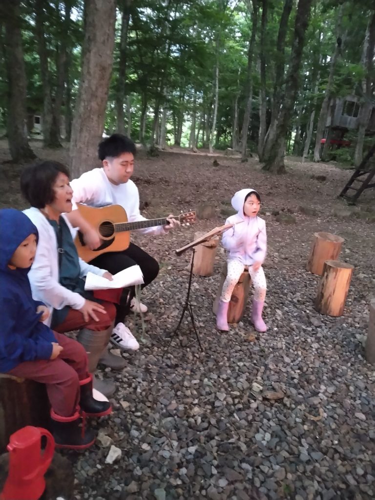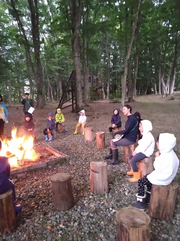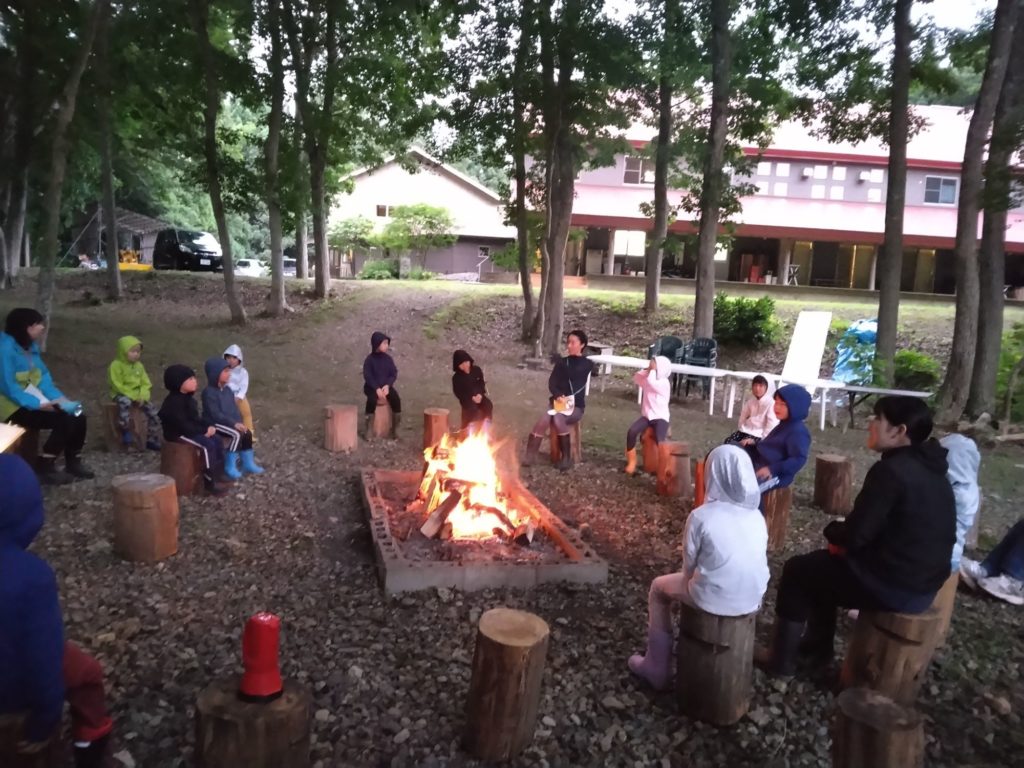 耳を澄まして子どもたちと自然の音に耳を傾けてキャンプファイヤーが始まりました。