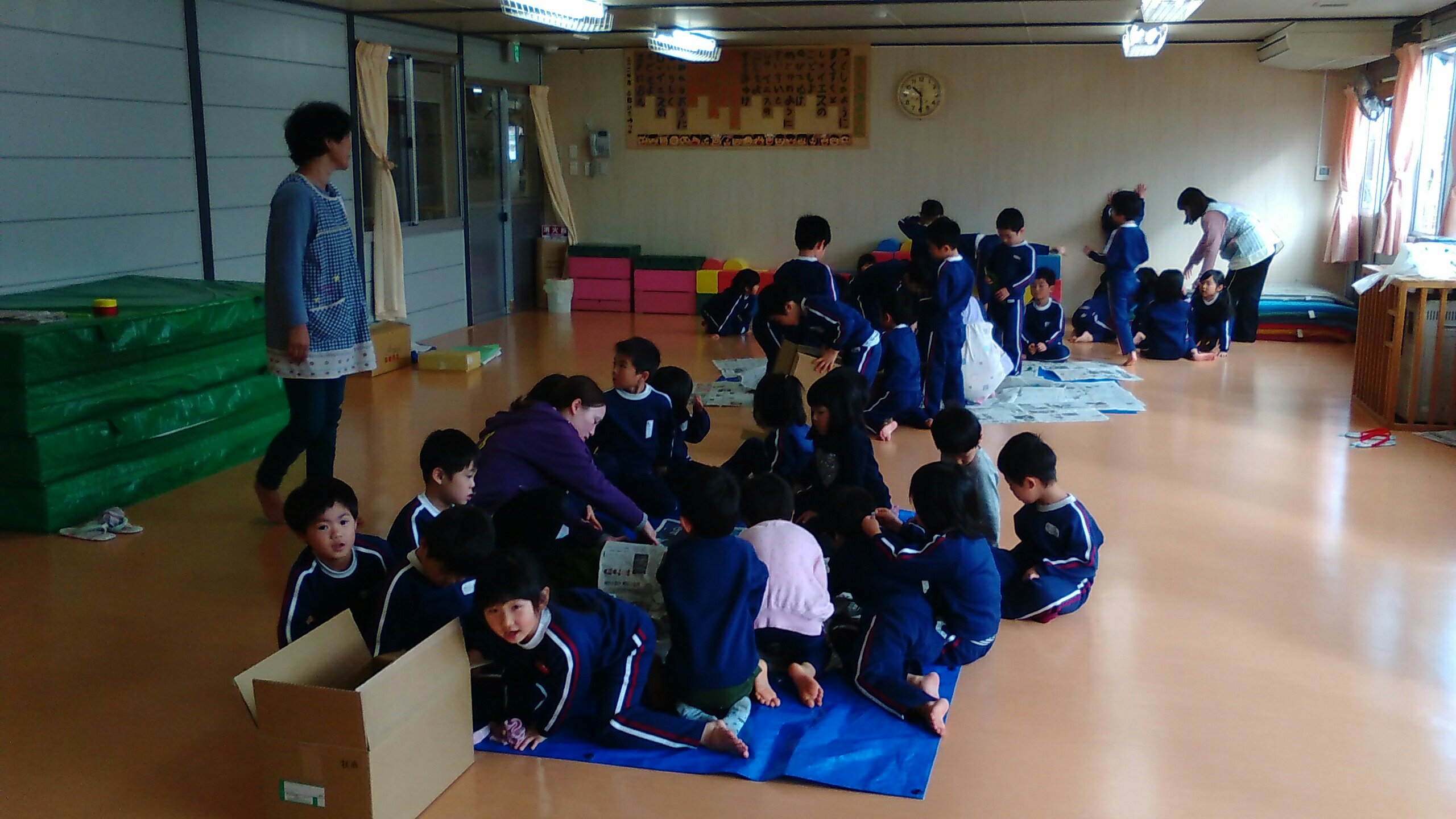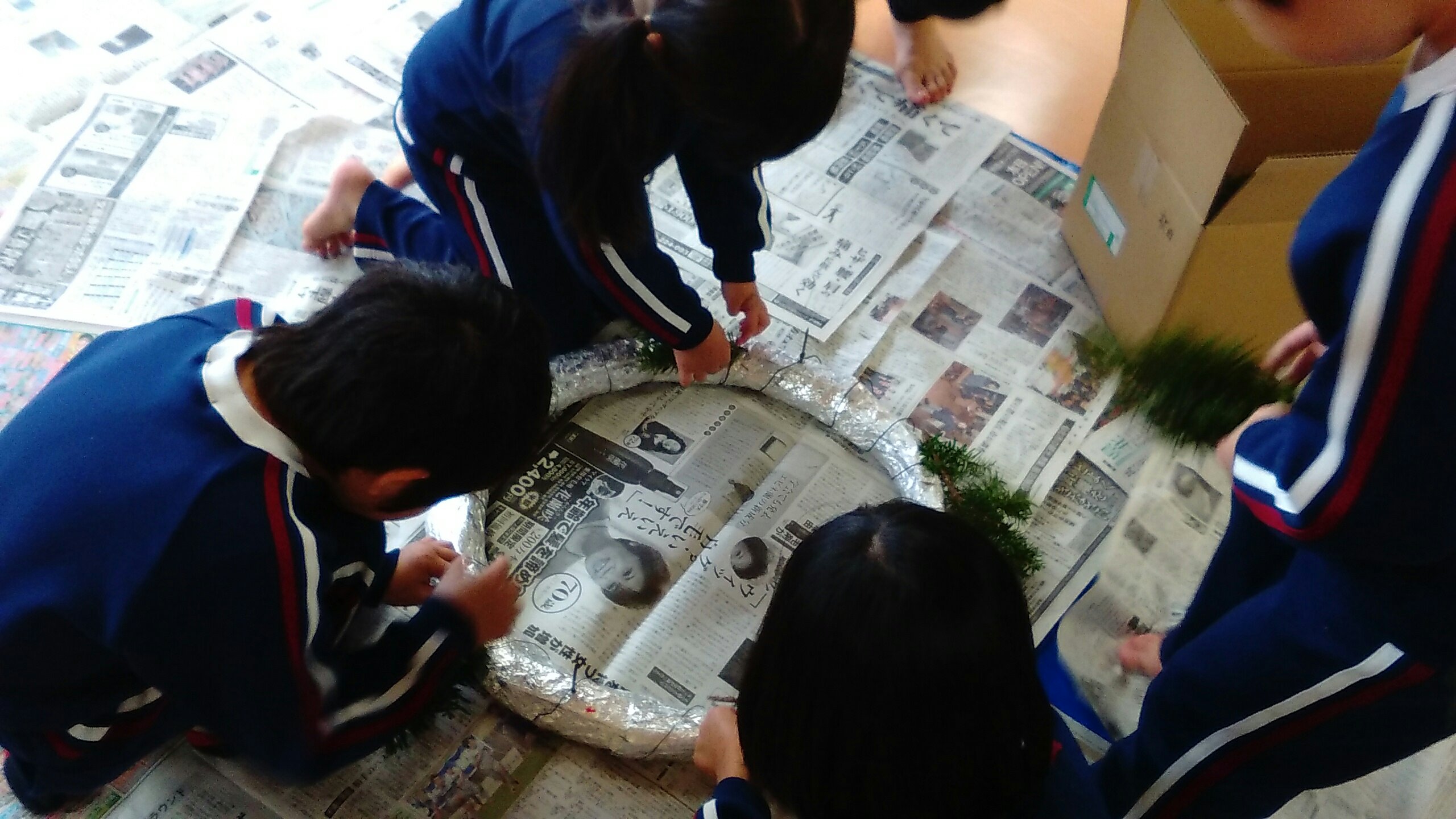 玄関に置くクリスマスツリーはたんぽぽ組のみんなが力を合わせて作ります!