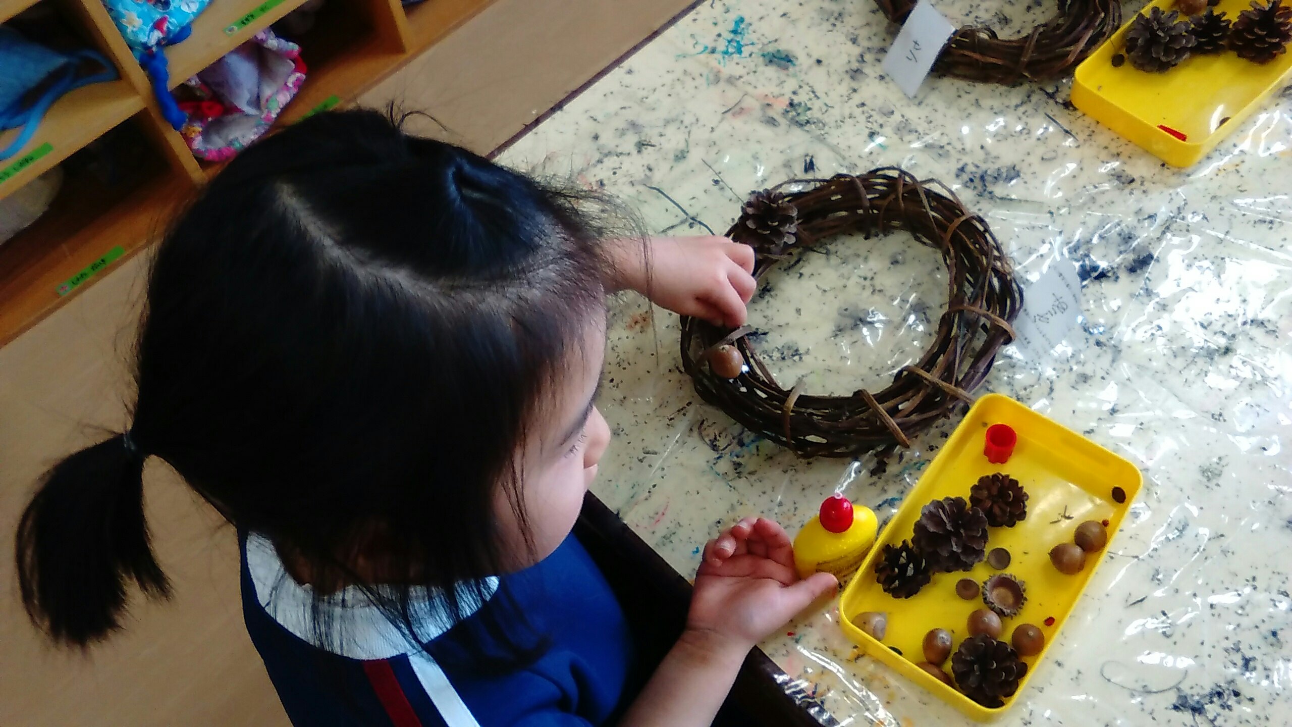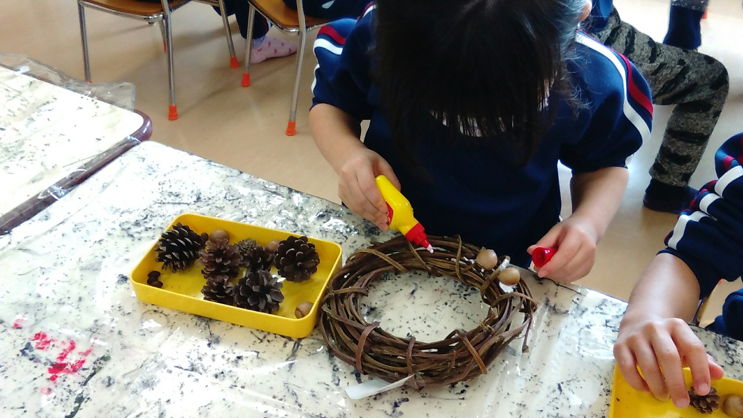 クリスマス制作 2018.12.13 秋に収穫したさつまいものつるで、クリスマスリースを作ったゆり組の子どもたち。 今日は、お散歩などで拾ったまつぼっくりやどんぐりなどの木の実を使って、リースに飾り付けをしました♪ オリジナルのナチュラルクリスマスリースです。