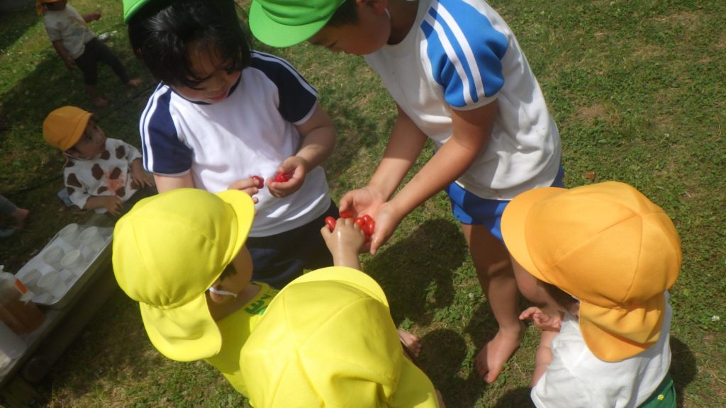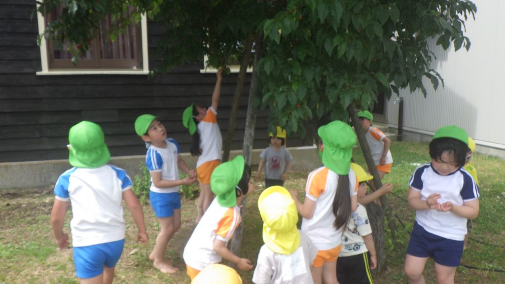 園舎改築と共に玄関の位置が変わり、グミの木は未満児の園庭で子どもたちを見ている気がしています。そして、グミの実が赤くなると毎年、誰ともなしに「赤くなったよー」の声に年長の子どもたちが張り切って未満児の園庭に走ってきて、木に登りグミの実を取って下の年齢の子どもたちに一生懸命あげています。