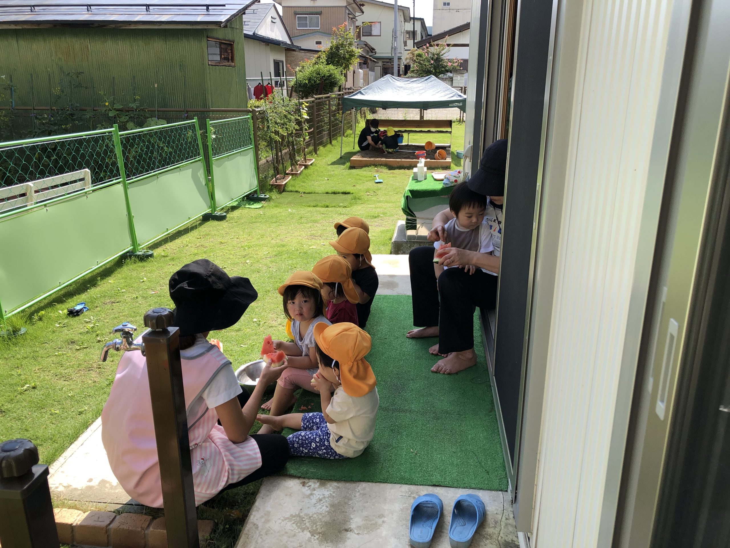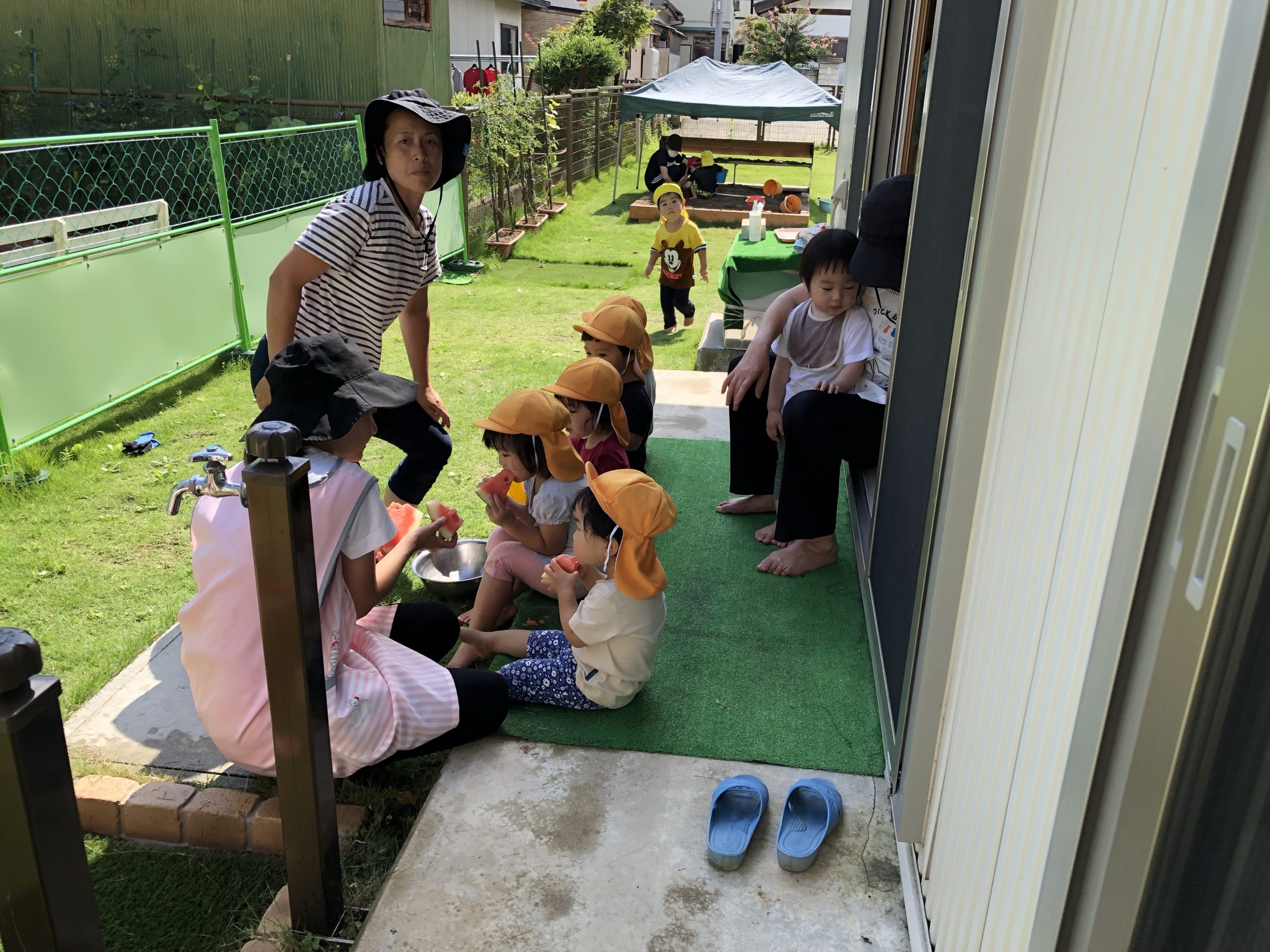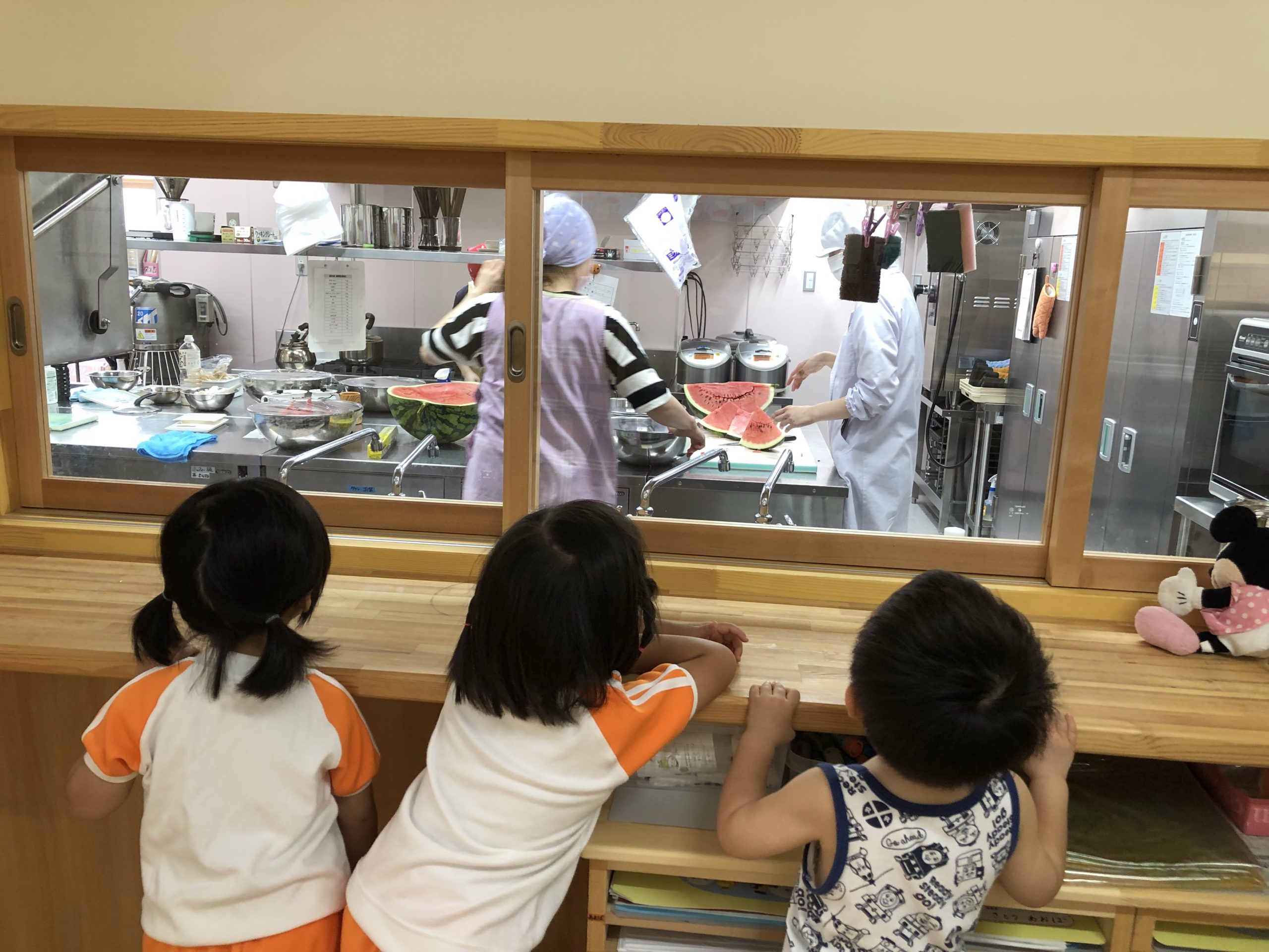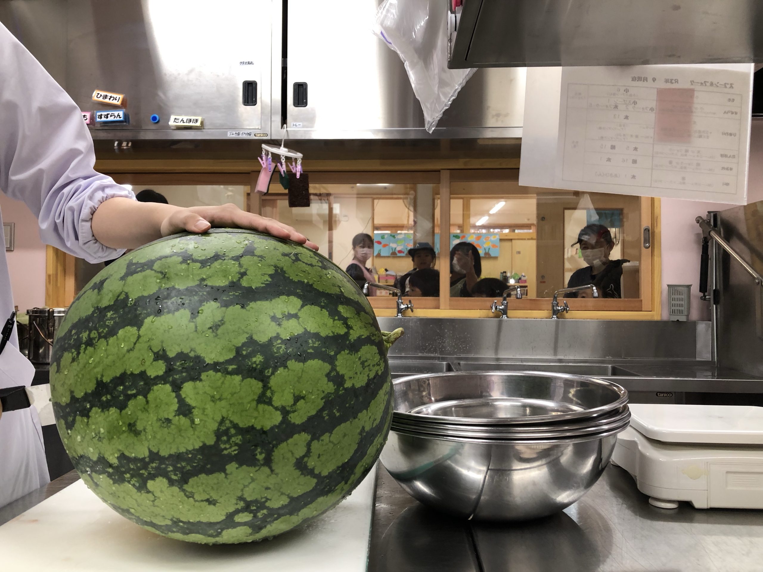 スイカいただきまーす!! 2021.08.27 とてもとても大きな声でスイカを頂きました。 なんと重さが19キロあります。 子どもたちはその大きさにびっくり!! 給食室に運ばれたスイカをどうなるのか窓から見ていました。 昨日、今日はそのスイカをおやつで食べています!!