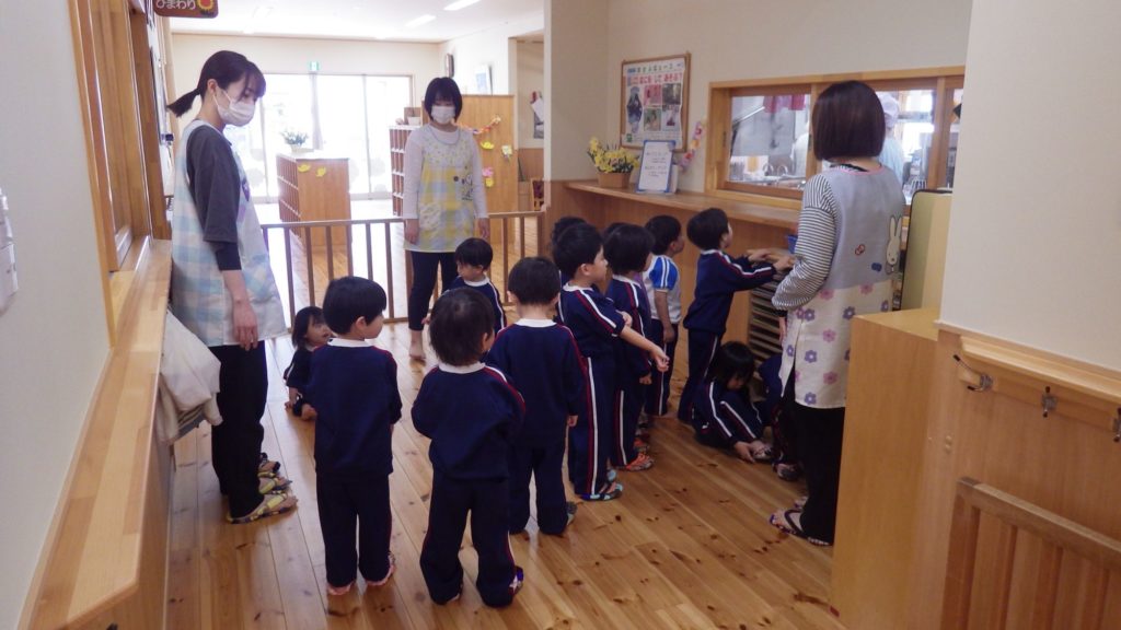 たんぽぽ組さんは園内ツアー。「ここは給食室です。美味しい給食を作ってくれます。」
