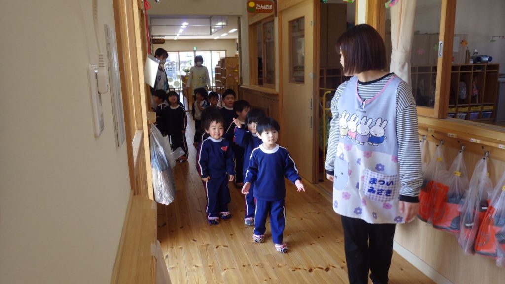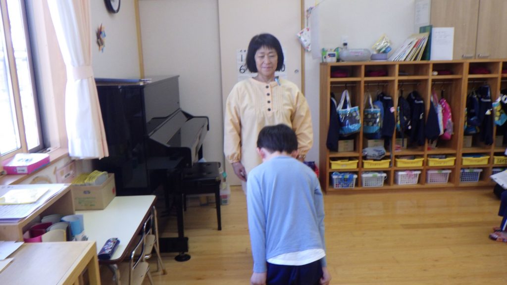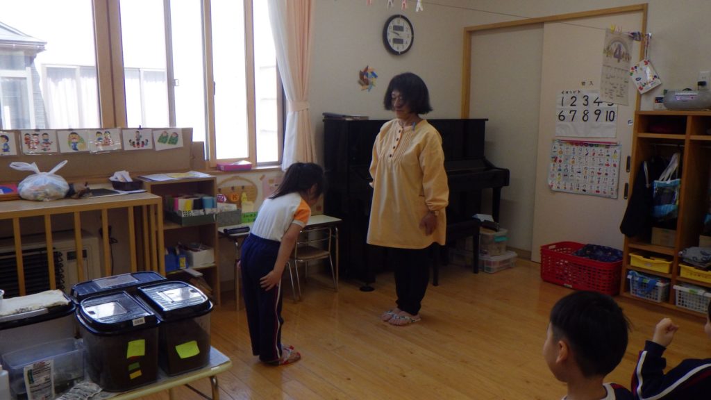 ゆり組さんは素敵な挨拶をみんなでしてみました。朝は「おはようございます。」そしてお家の人には「いってきます」。帰りは「さようなら」「ただいま」と言います。全員とっても立派だったので、明日からの挨拶が楽しみです。