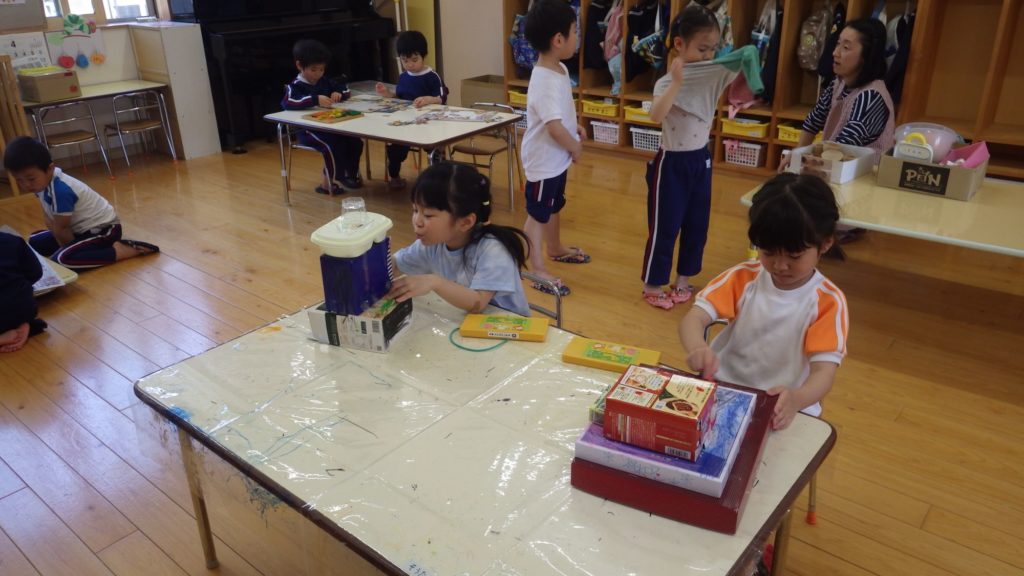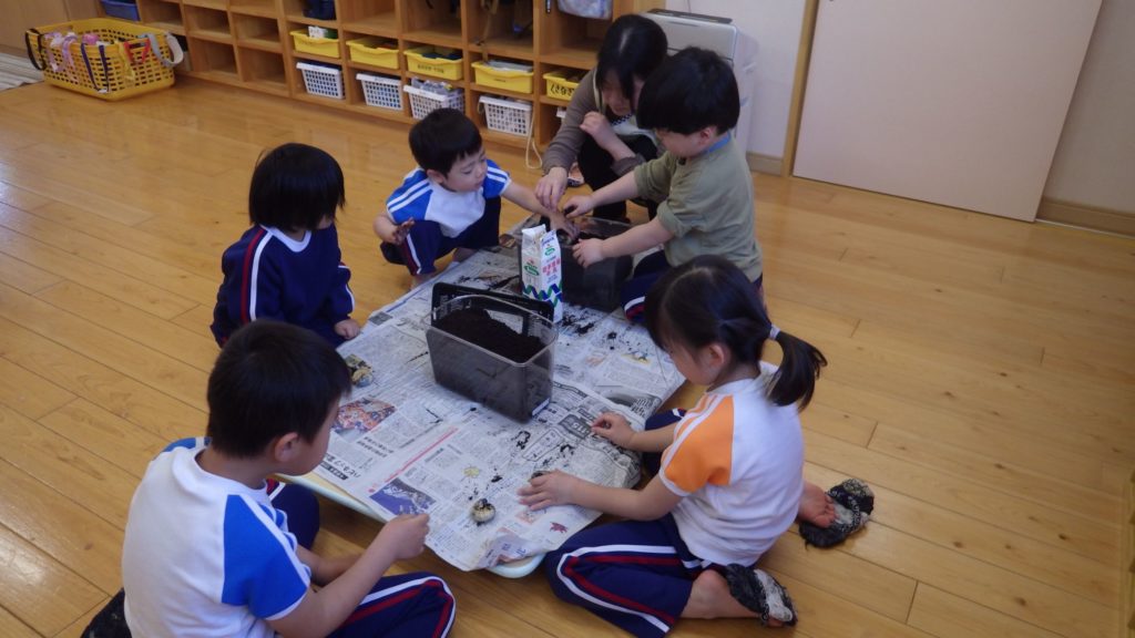 すみれ組さんはカブトムシの幼虫のお世話と制作とパズルをしていました。