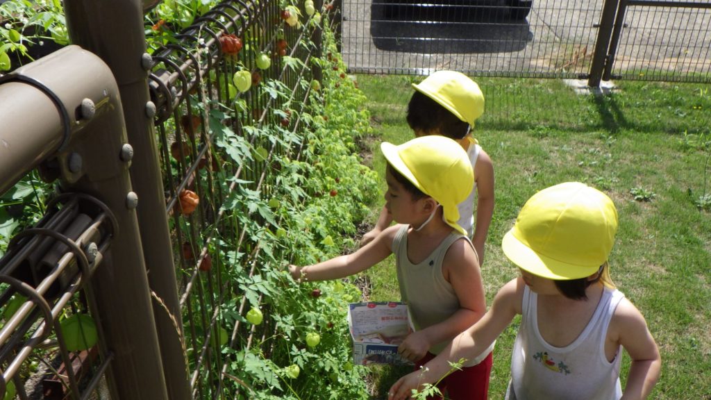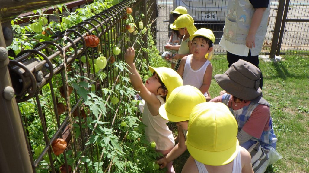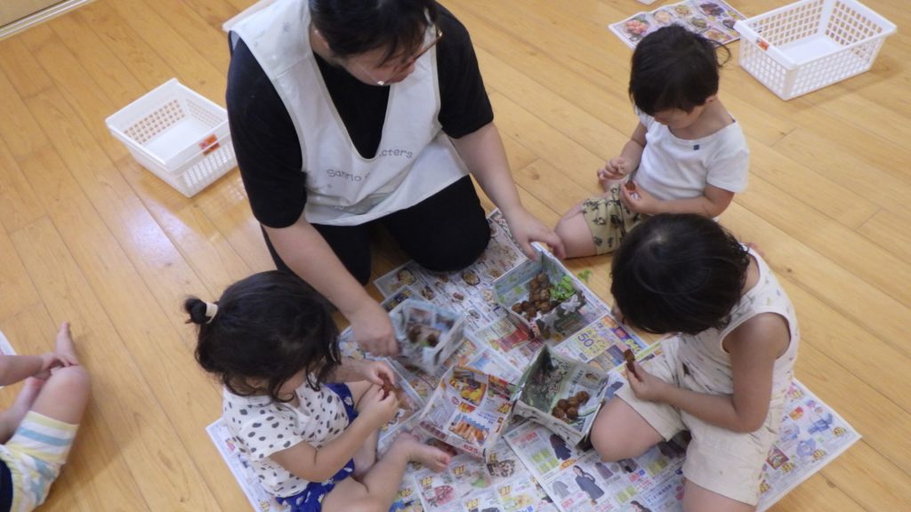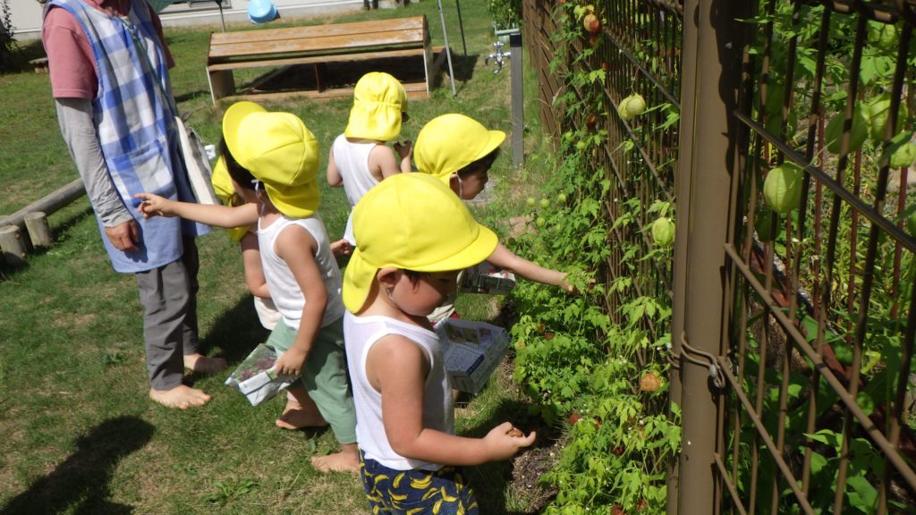 フウセンカズラ(2歳児) 2025.08.28 トマトと一緒に水やりしながら生長を見てきたフウセンカズラが風船状に膨らんで茶色になり、種を採る時期をむかえています。 さっそくみんなでそれぞれの箱に採りながらその後は種取りもしました。