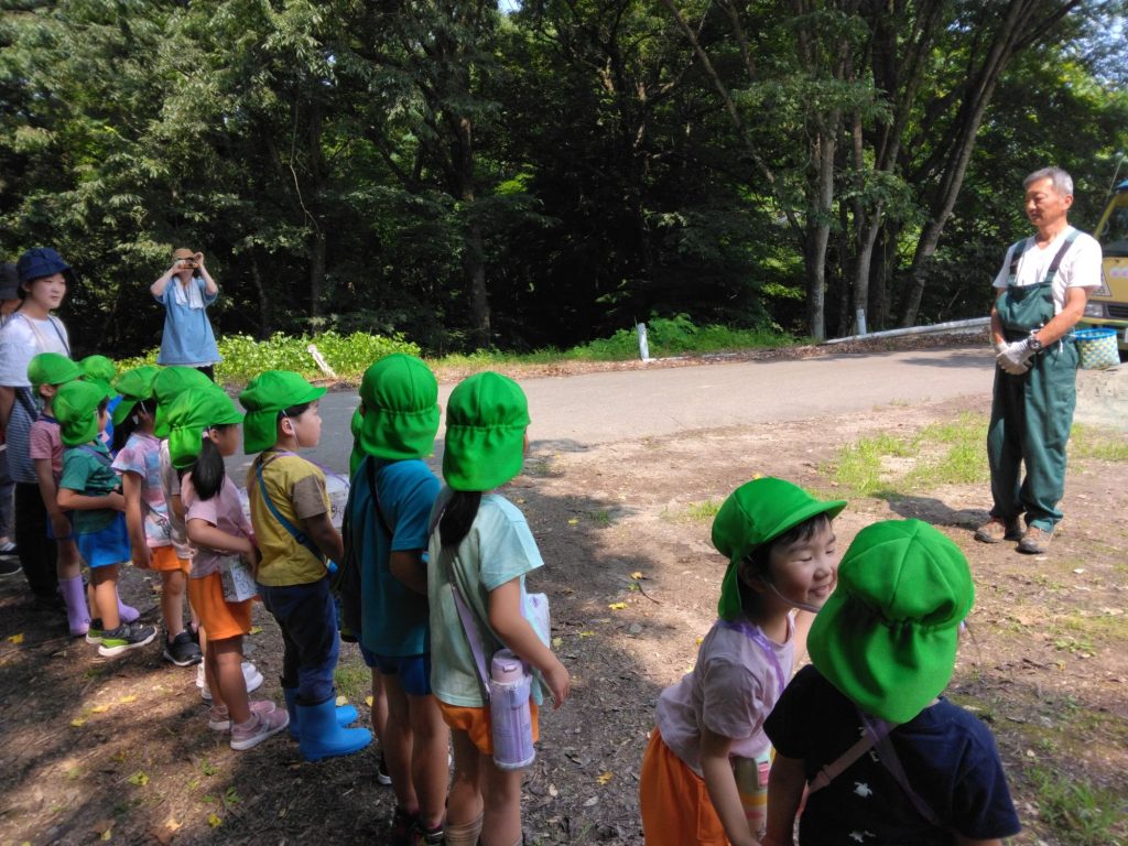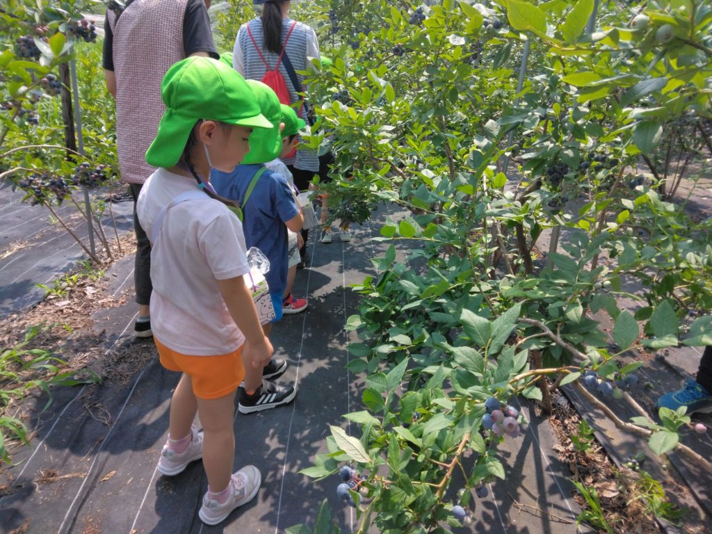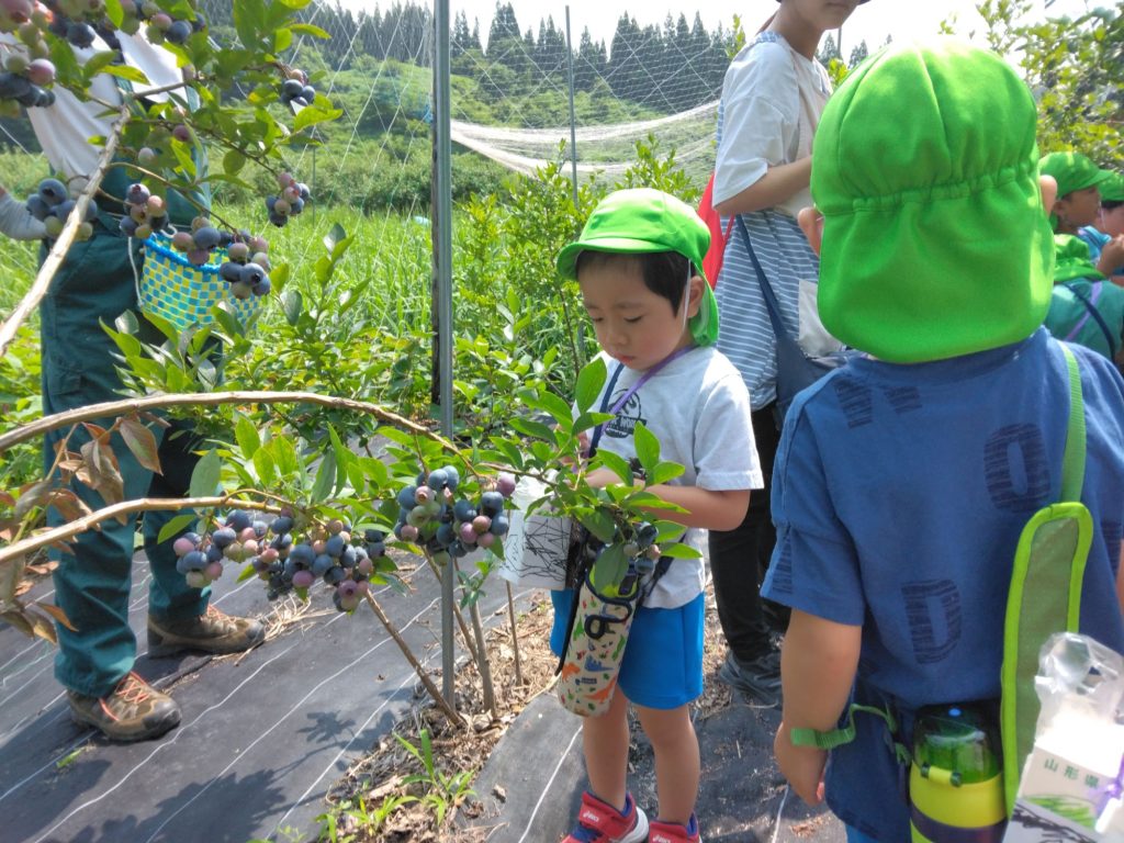 ブルーベリー狩り 2024.07.16 今日、すみれ組みの子どもたちは増田町に園バスで行ってブルーベリー狩りをしてきました。 黒いのを採って食べてください。 赤いのを食べると酸っぱいです。と告げられました。が、しかし…。 子どもの中にはとにかく見つけたら採る、見つけたら採るを繰り返す子どもたちがいました。「酸っぱくないかなー」と聞くと 「だいじょうだよ!!」と言ってパクッ!! ブルーベリー狩りのはじめと最後は招いてくださった方に挨拶をして帰ってきました。