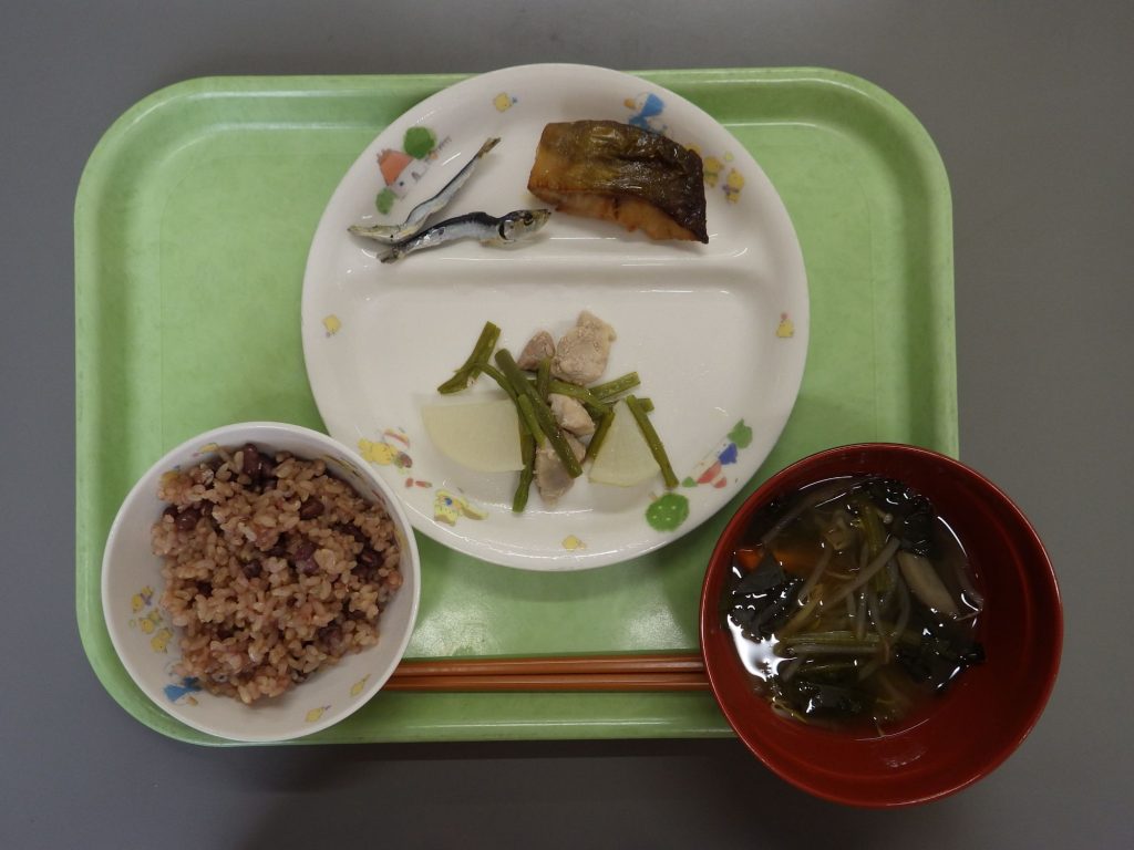 今日の給食 2024.10.23 今日の給食は 小豆ごはん(もも組、すずらん組白米、ひまわり組五分づき、以上児クラス玄米) 味噌汁(ほうれん草、もやし、えのき) ほっけ醤油焼き 鶏肉と大根の煮物(鶏肉、大根、インゲン) 離乳食は 小豆ごはん(白米) 味噌汁(ごぼう、えのき) ほっけ塩焼き 土鍋野菜(大根、じゃがいも、人参) 咀嚼用ごぼう