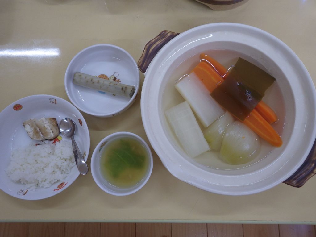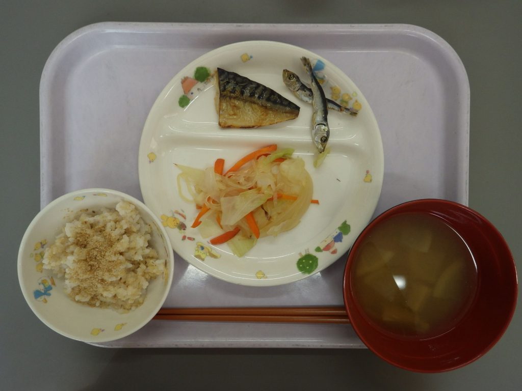 今日の給食 2024.10.01 今日の給食は ごはん(もも組、すずらん組白米、ひまわり組五分づき、玄米) 味噌汁(大根、ごぼう、えのき) 鯖の塩焼き 春雨サラダ(春雨、玉ねぎ、人参、キャベツ) ひまわり組、以上児クラスは煮干しも食べます。 離乳食は ごはん(白米) 味噌汁(キャベツ、えのき) 鯖の塩焼き 土鍋野菜(玉ねぎ、大根、人参)