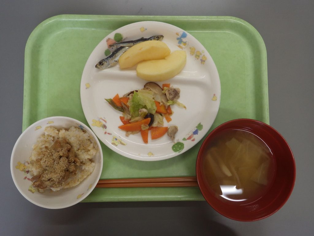 今日の給食 2024.10.02 今日の給食は ごはん(もも組、すずらん組白米、ひまわり組五分づき、以上児玄米) 味噌汁(キャベツ、もやし、しめじ) 味噌納豆 野菜炒め(しいたけ、鶏肉、ねぎ、人参) ひまわり組、以上児は煮干しも食べます。 離乳食は ごはん(白米) 味噌汁(しいたけ、もやし) 納豆 土鍋野菜(ねぎ、人参、キャベツ) 咀嚼用ごぼう