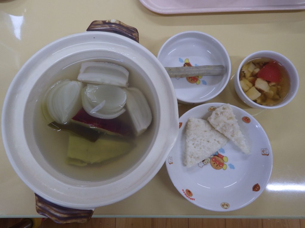 今日の給食 2024.10.07 今日の給食は パン(もも組、すずらん組米粉、ひまわり組、以上児クラスは全粒粉) きのこスープ(鶏肉、しめじ、えのき、しいたけ、トマト) さつまいもサラダ(さつまいも、玉ねぎ、蓮根、豆乳) ひまわり組、以上児クラスは煮干しも食べます。 離乳食は 米粉パン スープ(鶏ささみ、しいたけ、トマト) 土鍋野菜(さつまいも、玉ねぎ、蓮根) 咀嚼用ごぼう