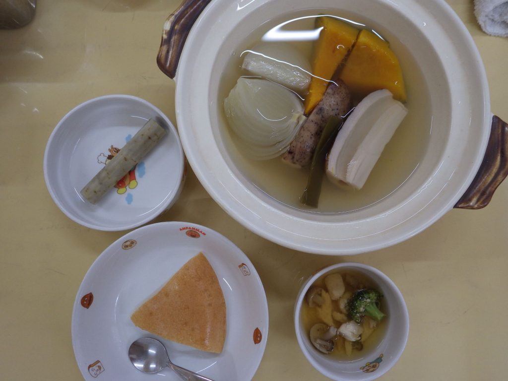 今日の給食 2024.10.21 今日の給食は パン(もも組、すずらん組米粉パン、ひまわり組、以上児クラス全粒粉パン) チキンスープ(鶏肉、蓮根、しめじ、ブロッコリー) かぼちゃサラダ(かぼちゃ、玉ねぎ、人参、豆乳) ひまわり組、以上児クラスは煮干しも食べます。 離乳食は 米粉パン スープ(鶏肉ささみ、しめじ、ブロッコリー) 土鍋野菜(かぼちゃ、玉ねぎ、蓮根) 咀嚼用ごぼう