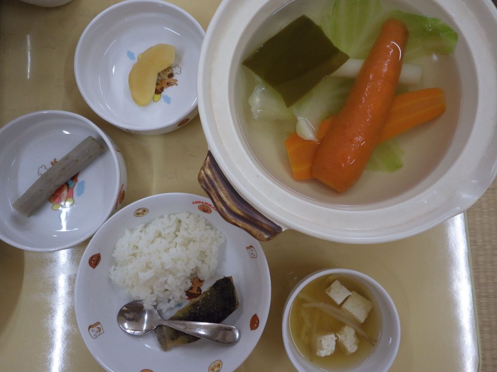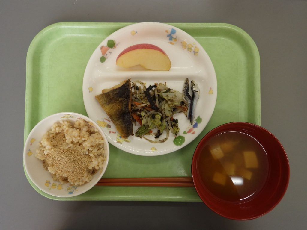 今日の給食 2024.10.29 今日の給食は ごはん(もも組、すずらん組白米、ひまわり組五分づき、以上児クラス玄米) 味噌汁(豆腐、さつまいも、ねぎ) ほっけ塩焼き 海苔和え(海苔、キャベツ、人参、もやし) デザートりんご(もも組、すずらん組は煮りんご) ごはんにはすり胡麻をかけています。 ひまわり組、以上児クラスは煮干しも食べます。 離乳食は 白米ごはん 味噌汁(豆腐、もやし) ほっけ塩焼き 土鍋野菜(キャベツ、人参、ねぎ) デザート煮りんご 咀嚼用ごぼう