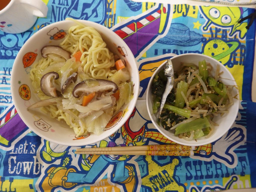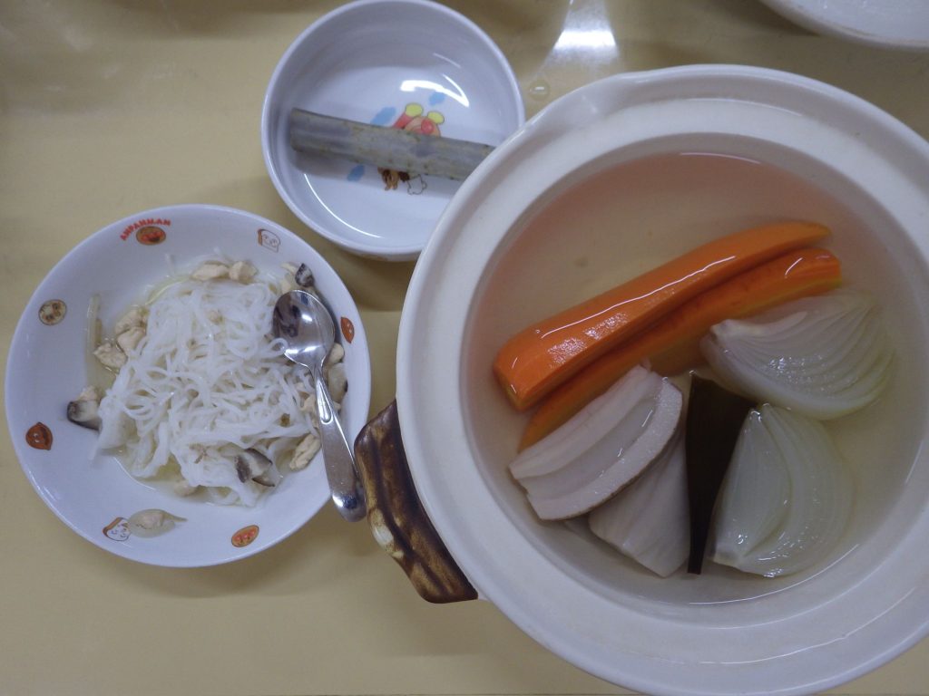 今日の給食 2024.11.15 今日の給食は 中華そば(もも組、すずらん組米麺、 ひまわり組、以上児クラスは中華麺、鶏肉、キャベツ、人参、しいたけ、玉ねぎ) ナムル(もやし、小松菜、いりごま) ひまわり組、以上児クラスは煮干しも食べます。 午前のおやつに甘酒を飲んでます。 離乳食は 米粉麺 スープ(鶏肉ささ身、しいたけ、もやし) 土鍋野菜(蓮根、玉ねぎ、人参) 咀嚼用ごぼう