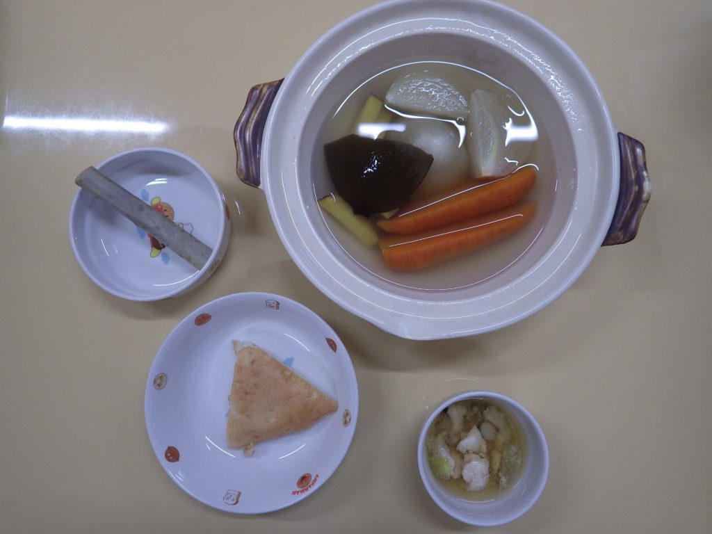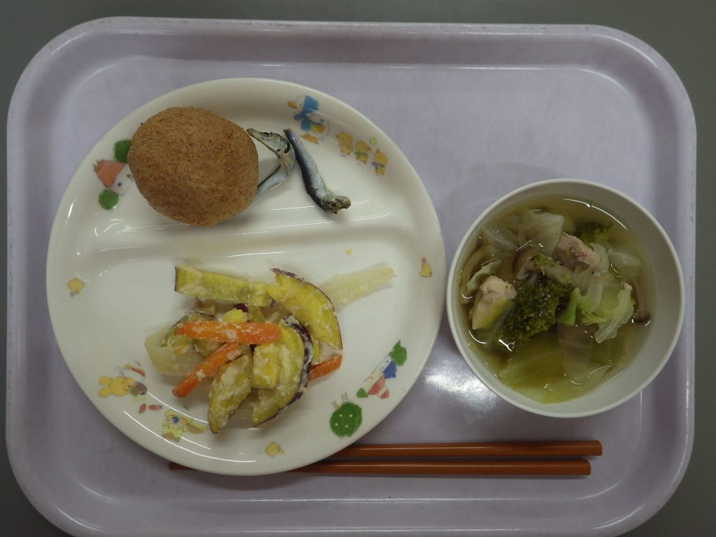 今日の給食 2024.11.18 今日の給食は パン(もも組、すずらん組米粉パン、ひまわり組、以上児クラスは全粒粉パン) チキンスープ(鶏肉、ブロッコリー、しめじ、キャベツ) さつまいもサラダ(さつまいも、人参、玉ねぎ、豆乳) ひまわり組、以上児クラスは煮干しも食べます。 今日の離乳食は 米粉パン スープ(鶏肉ささ身、しめじ、キャベツ) 土鍋野菜(さつまいも、人参、玉ねぎ) 咀嚼用ごぼう 午前には全クラス豆乳のおやつを飲みました。