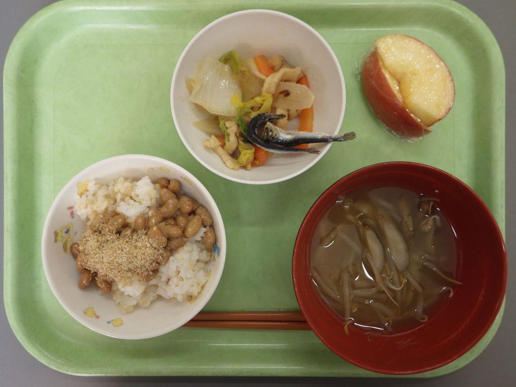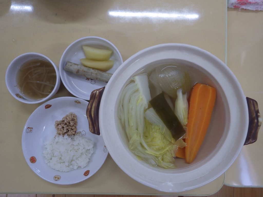 今日の給食 2024.11.20 今日の給食は ごはん(もも組、すずらん組白米、ひまわり組五分づき、以上児クラス玄米) 味噌汁(もやし、ごぼう) 塩麹納豆 中華あんかけ煮物(切り干し大根、白菜、人参、玉ねぎ) ごはんにはすり胡麻をかけています。 ひまわり組、以上児クラスは煮干しも食べます。 離乳食は 白米ごはん 味噌汁(もやし、ごぼう) ひきわり納豆 土鍋野菜(白菜、人参、玉ねぎ) 咀嚼用ごぼう