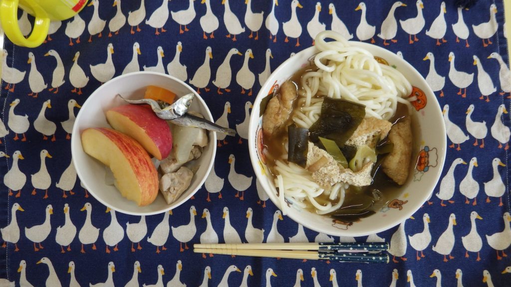 今日の給食 2024.11.22 今日の給食は きつねうどん(油揚げ、なめこ、ねぎ、わかめ、もも組、すずらん組米粉麺、ひまわり組、以上児クラスは小麦粉麺) 鶏肉と根菜の煮物(鶏肉、大根 人参) りんご ひまわり組、以上児クラスは煮干しも食べます。 離乳食は 米粉麺(鶏ささ身、なめこ、ねぎ) 土鍋野菜(さつまいも、大根、人参) 煮りんご 咀嚼用ごぼうごぼう