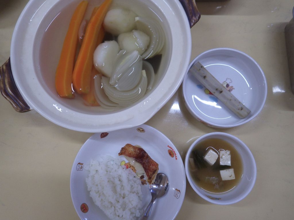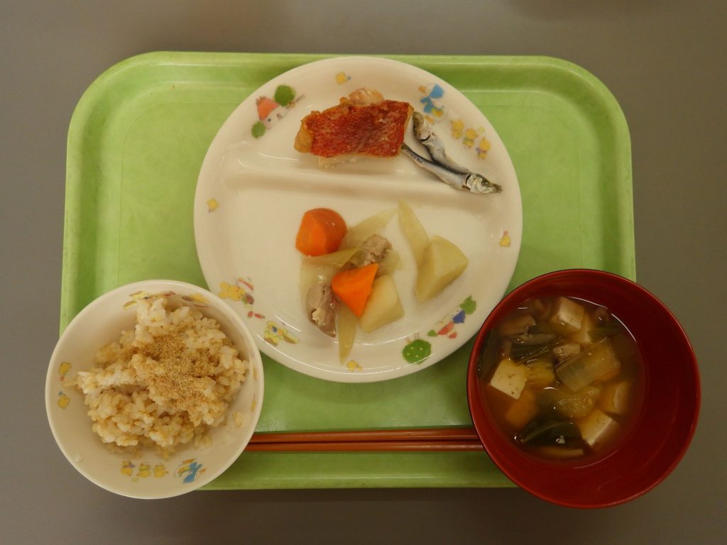 今日の給食 2024.12.10 今日の給食は ごはん(もも組、すずらん組白米、ひまわり組五分づき、以上児玄米) 味噌汁(豆腐、チンゲン菜、しめじ) 赤魚塩焼き 塩肉じゃが(じゃがいも、鶏肉、人参、玉ねぎ) ごはんにはすり胡麻をかけます。 ひまわり組、以上児クラスは煮干しも食べます。 離乳食は 白米 味噌汁(東京、チンゲン菜、しめじ) 赤魚塩焼き 土鍋野菜(じゃがいも、玉ねぎ、人参) 咀嚼用ごぼう