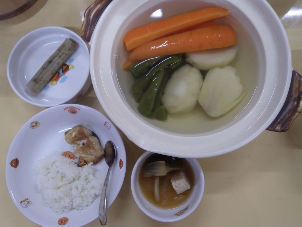 今日の給食 2024.12.17 今日の給食は ごはん(もも組、すずらん組白米、ひまわり組五分づき、以上児クラス玄米) 味噌汁(豆腐、小松菜、玉ねぎ) 鯖の塩焼き すき昆布炒め(すき昆布、しめじ、人参、油揚げ) ごはんにはすり胡麻をかけます。 ひまわり組、以上児クラスは煮干しも食べます。 離乳食は 白米 味噌汁(豆腐、小松菜、玉ねぎ) さば塩焼き 土鍋野菜(人参、じゃがいも、ピーマン) 咀嚼用ごぼう