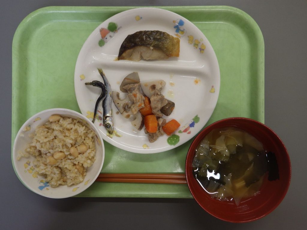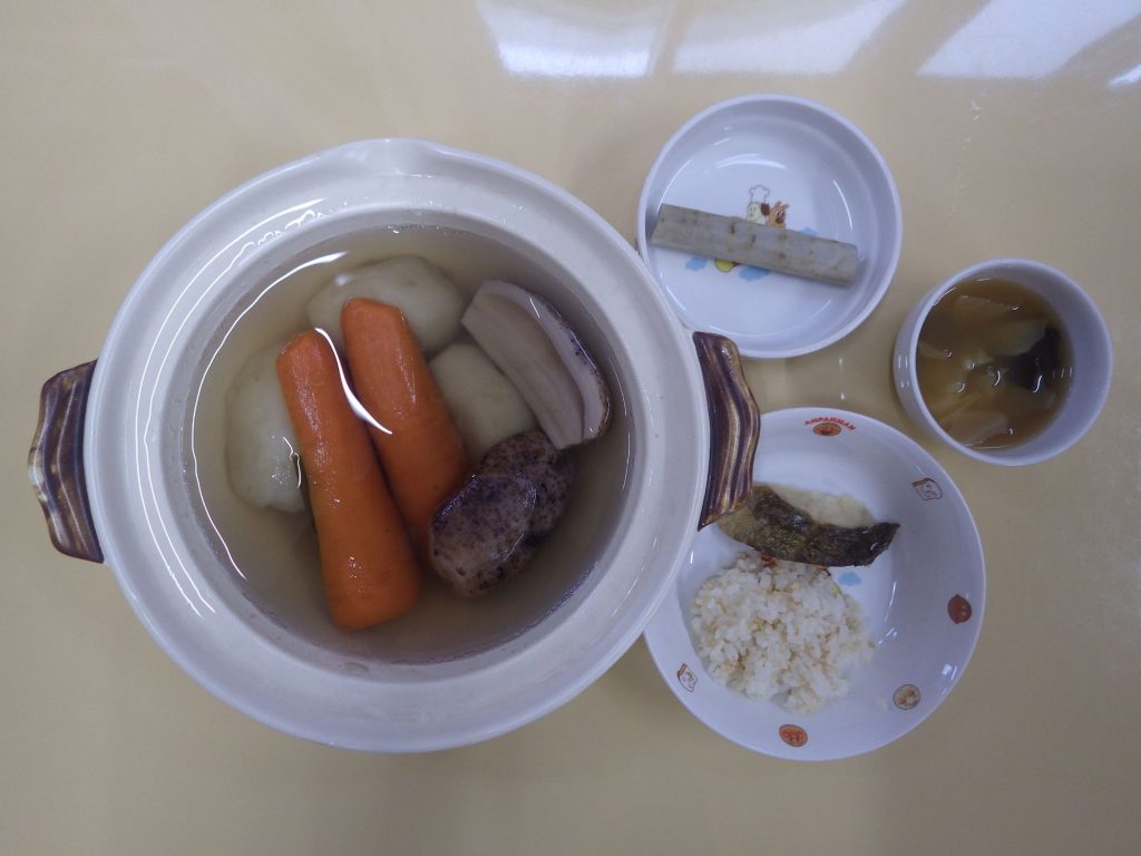 今日の給食 2024.12.25 今日の給食は 豆ごはん(もも組、すずらん組白米、ひまわり組五分づき、以上児クラス) 味噌汁(キャベツ、えのき、わかめ) ほっけ塩焼き 筑前煮(鶏肉、蓮根、ごぼう、人参) ひまわり組、以上児クラスは煮干しも食べます。 離乳食は 白米 味噌汁(大根、ごぼう、油揚げ) 赤魚醤油焼き 土鍋野菜(チンゲン菜、玉ねぎ、人参) 咀嚼用ごぼう