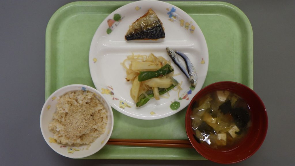 今日の給食 2025.01.15 今日の給食は ごはん(もも組、すずらん組白米、ひまわり組五分づき、以上児クラス玄米) 鯖の塩焼き 春雨炒め(春雨、ピーマン、玉ねぎ、じゃがいも) ごはんにはすり胡麻をかけています。 ひまわり組、以上児クラスは煮干しも食べます。