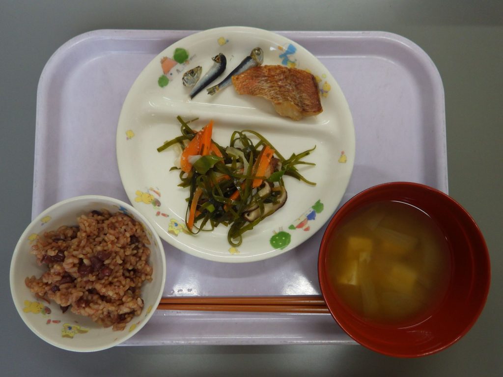 今日の給食 2025.01.23 今日の給食は 小豆ごはん(もも組、すずらん組白米、ひまわり組五分づき、以上児クラス玄米) 味噌汁(豆腐、玉ねぎ、ごぼう) 赤魚塩焼き すき昆布炒め(すき昆布、ねぎ 人参、しいたけ) ひまわり組、以上児クラスは煮干しも食べます。