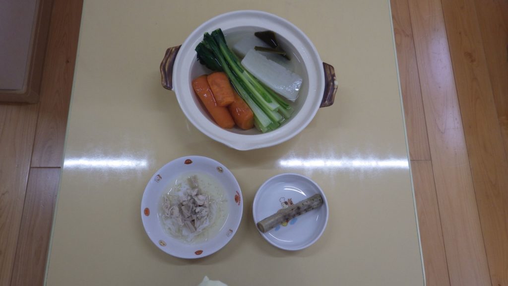 今日の給食 2024.04.26 今日の給食はけんちん風うどん 煮びたし そして、煮干しです。 もも組、すずらん組の給食は、 けんちん風米粉麺 煮びたし そして、離乳食にはいつものように土鍋野菜がついてます。 咀嚼用ごぼうも!! 土鍋野菜の小松菜も上手に食べています。